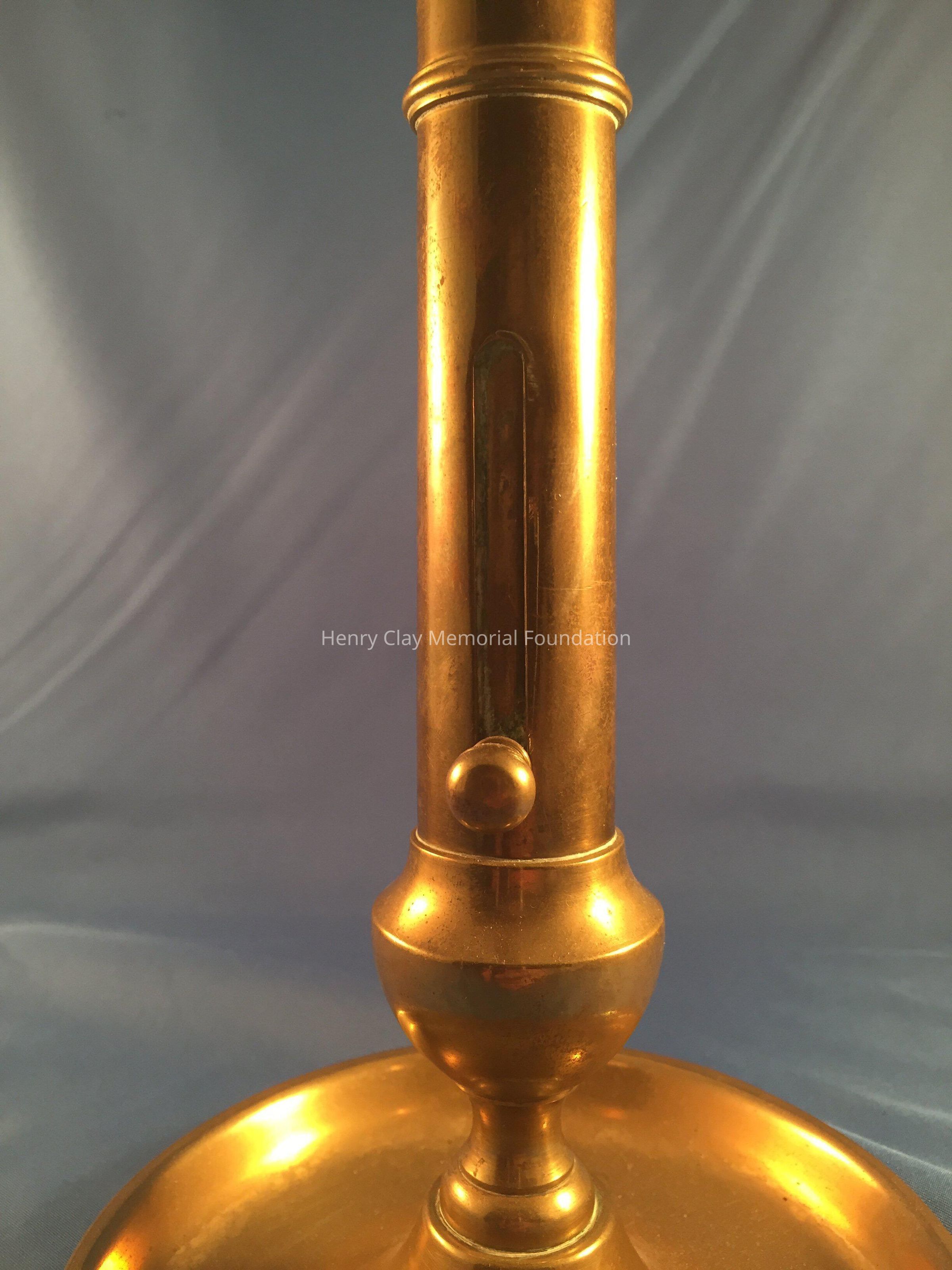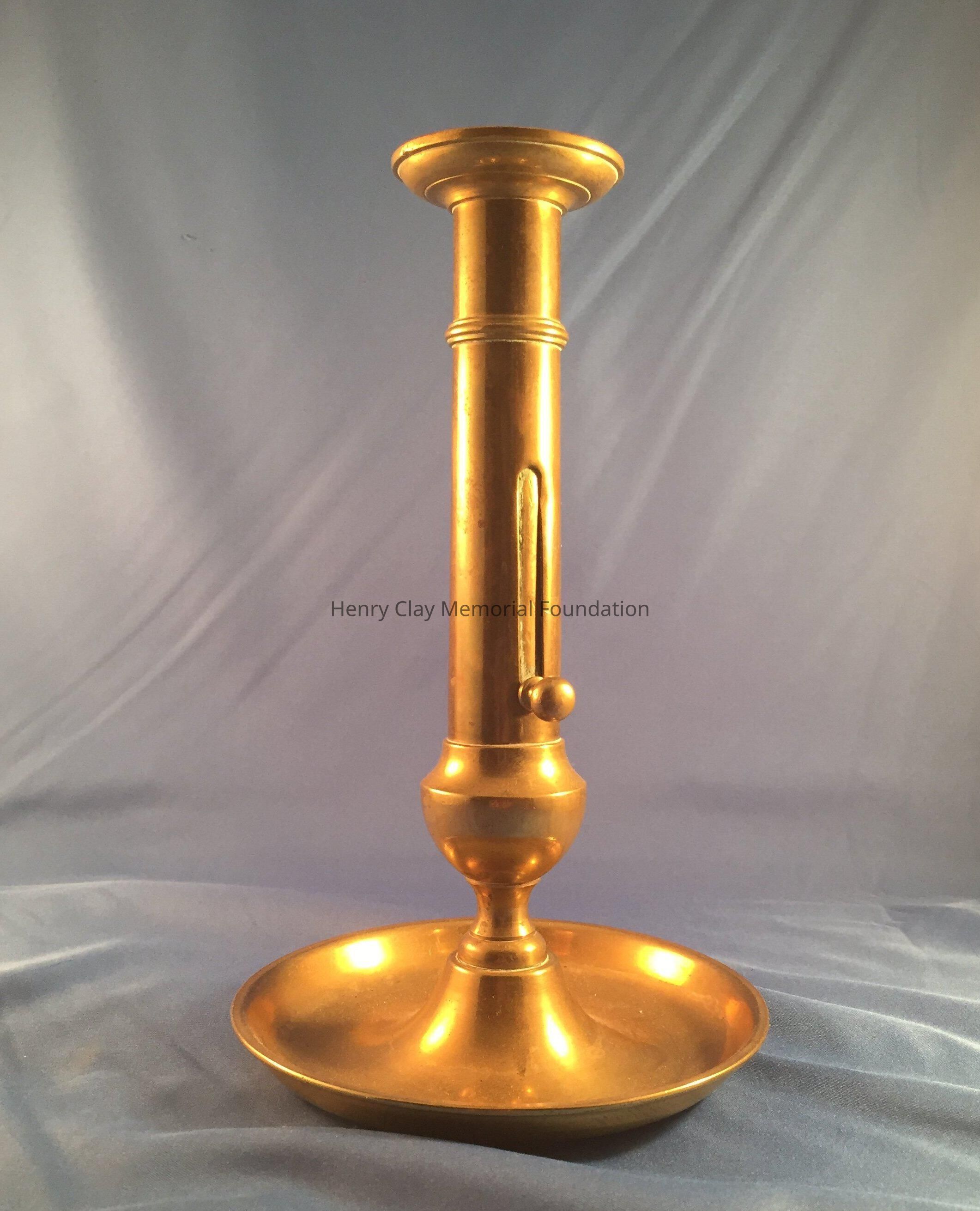 Brass candlestick, push up knob on stem, round, deep base.