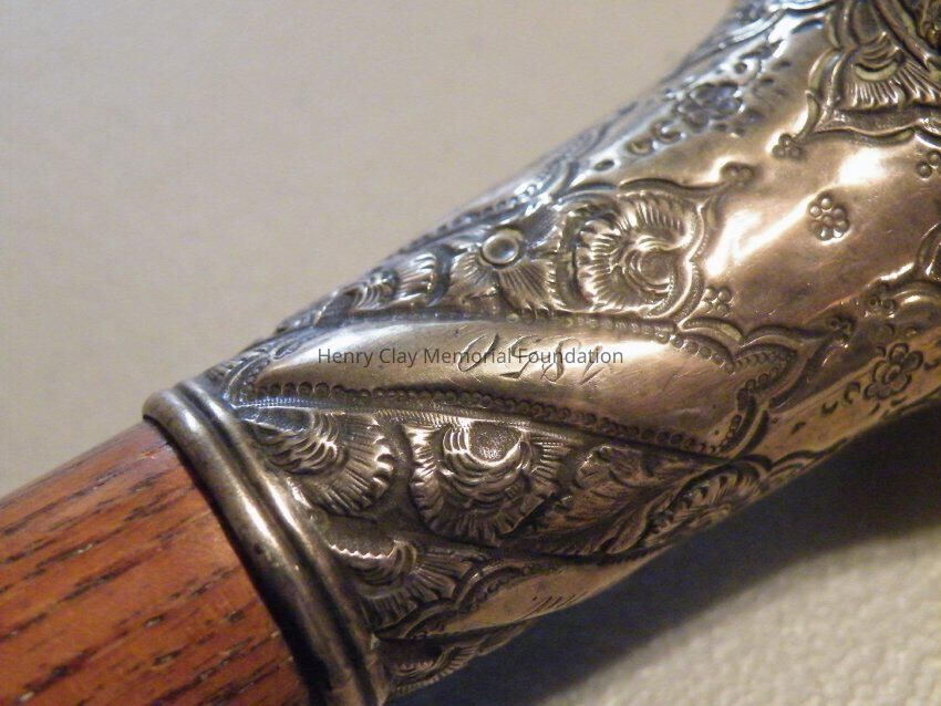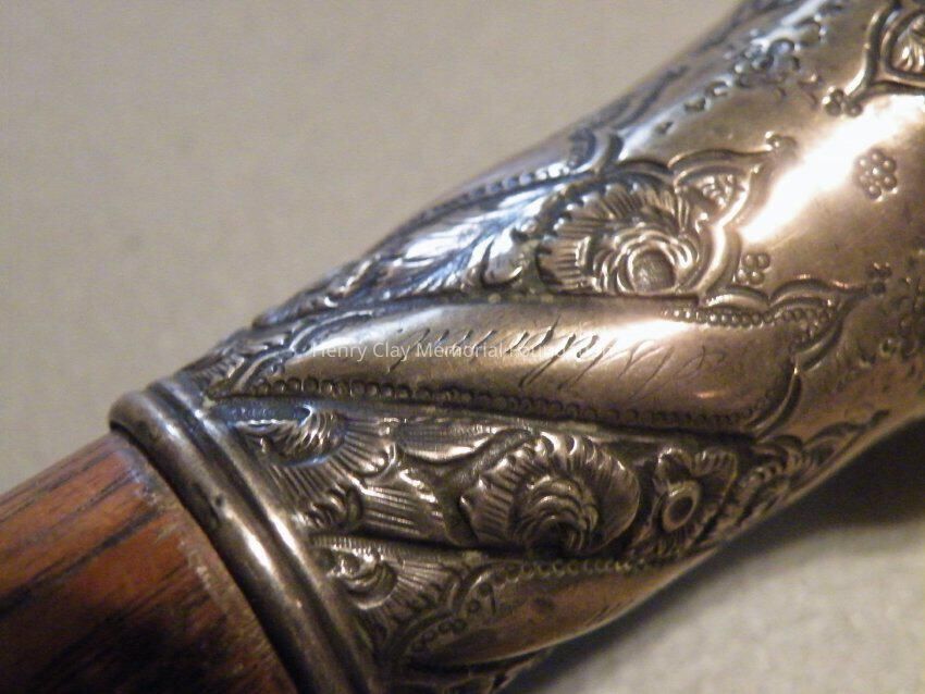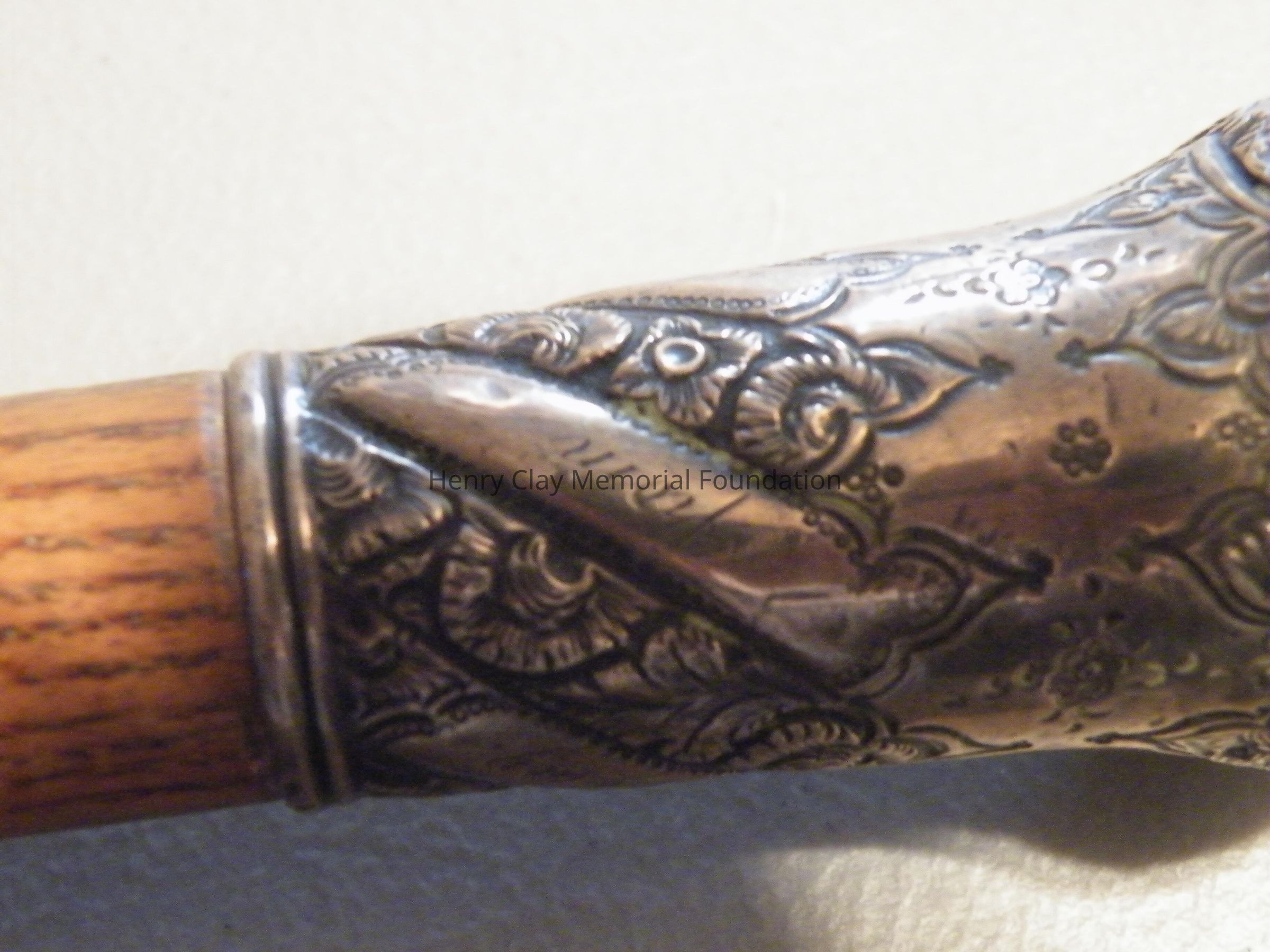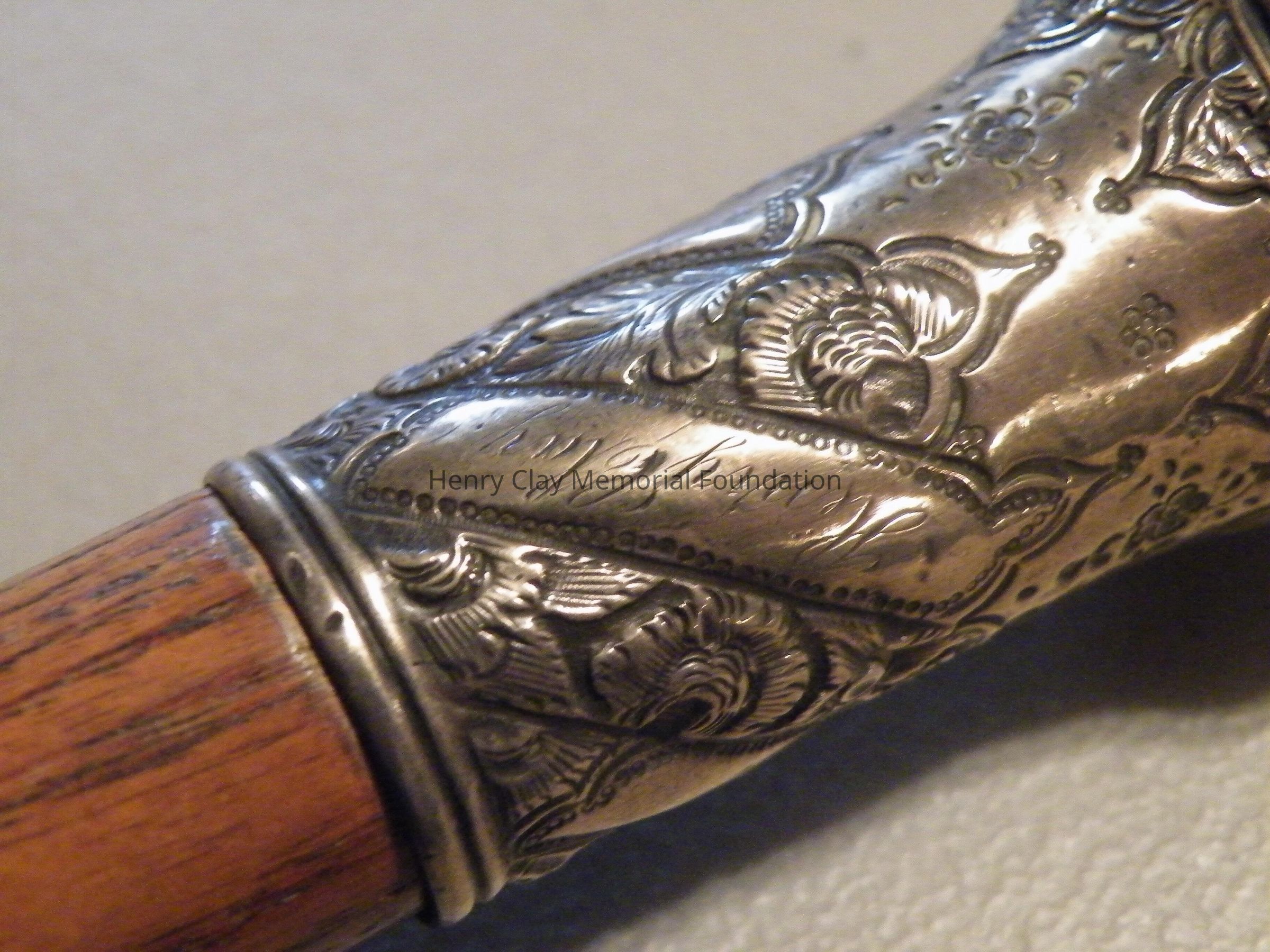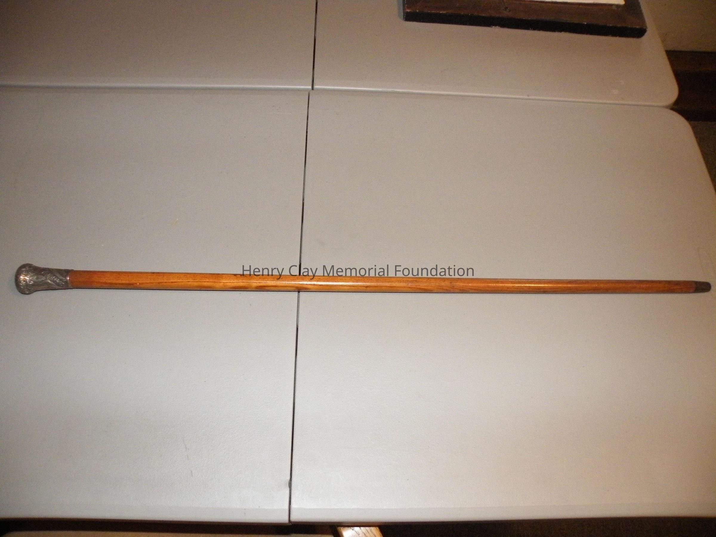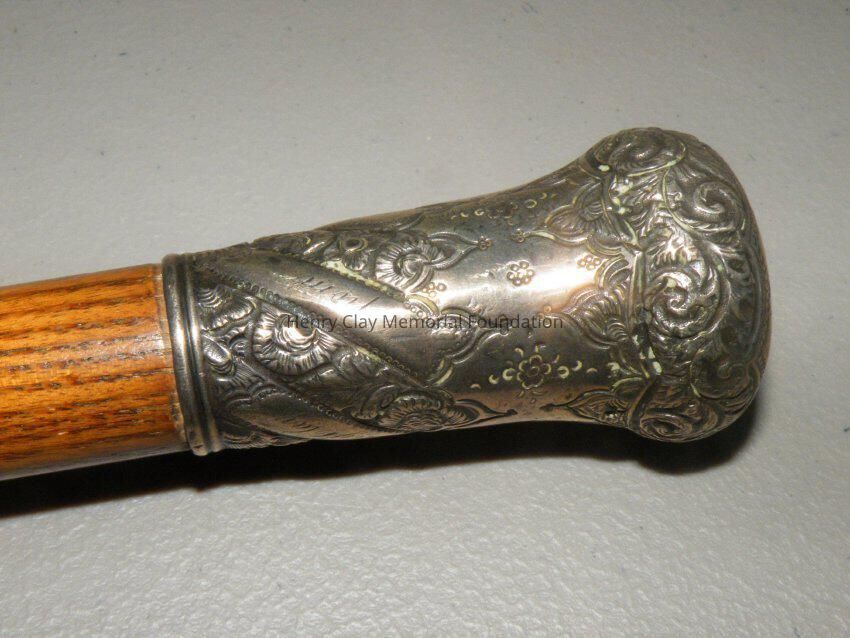 One cane with light colored wood shaft, metal end cap. and silver knob. The knob is heavily decorated will floral deisgns and scroll work. It is engraved on top "Ward" and on the sides on ribbons "from Henry Clay Ashland 1850". The knob pulls out of the cane to reveal a small triangular blade 11" long engraved with floral designs and triangular notches near the point. The knob itself is composed of a silver outer layer over a base metal form.