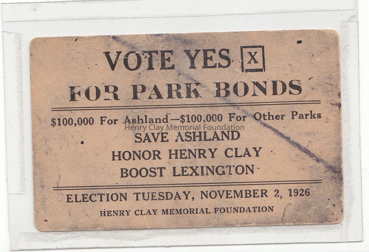 A small card. "Vote yes for park bonds, $100000 for Ashland, $100000 for other parks. Save Ashland Honor Henry Clay Boost Lexington, Elction Tuesday, November 2, 1926, Henry Clay Memorial Foundation