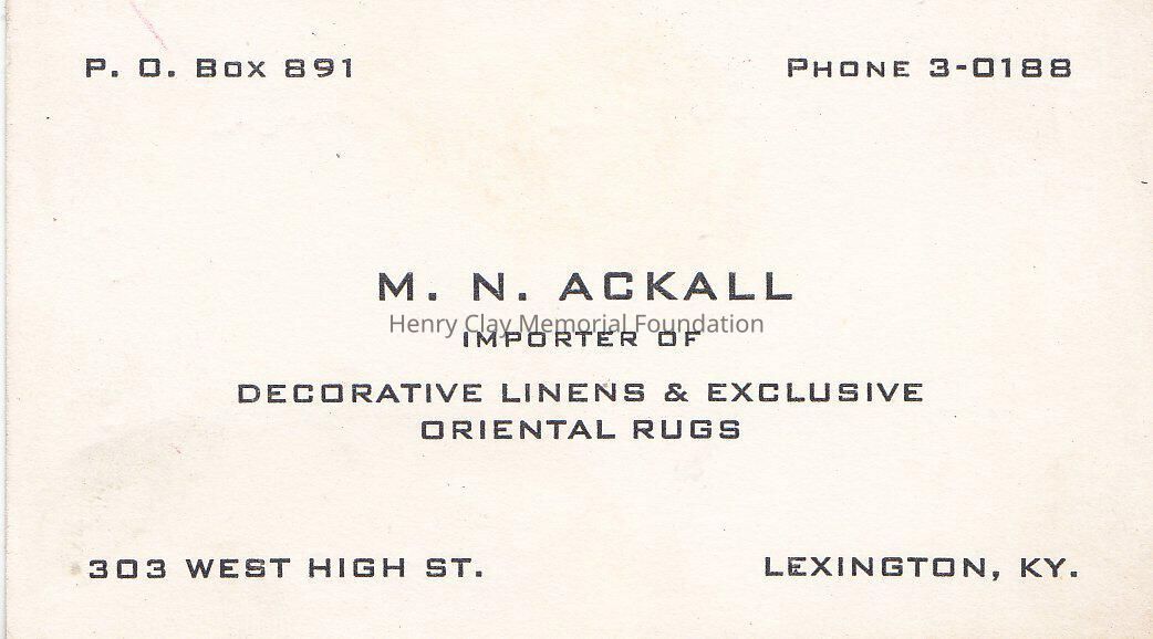 A business card of M.N.Ackall Importer of Decorative Linens & Exclusive Oriental Rugs.