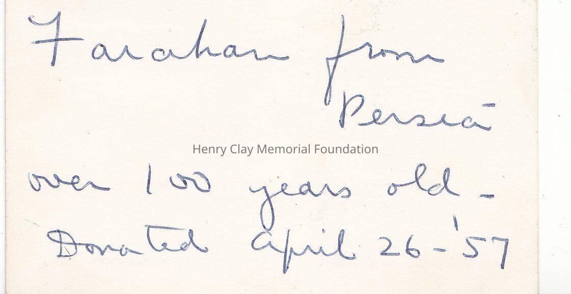 In the rear in pen " 7 arahan from Persia over 100 years old, donated april 26 1957"