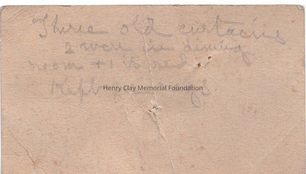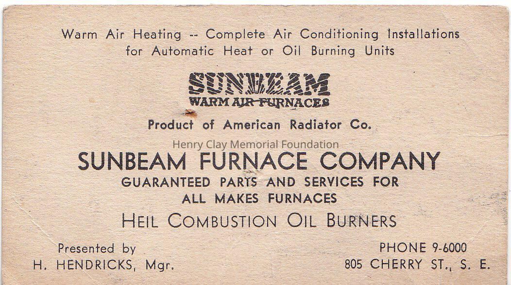A business card from Sunbeam warm air furnaces. In the rear a message in pencil " Three old curtains 2 were in dining room + 1 is red. Kept for rags"