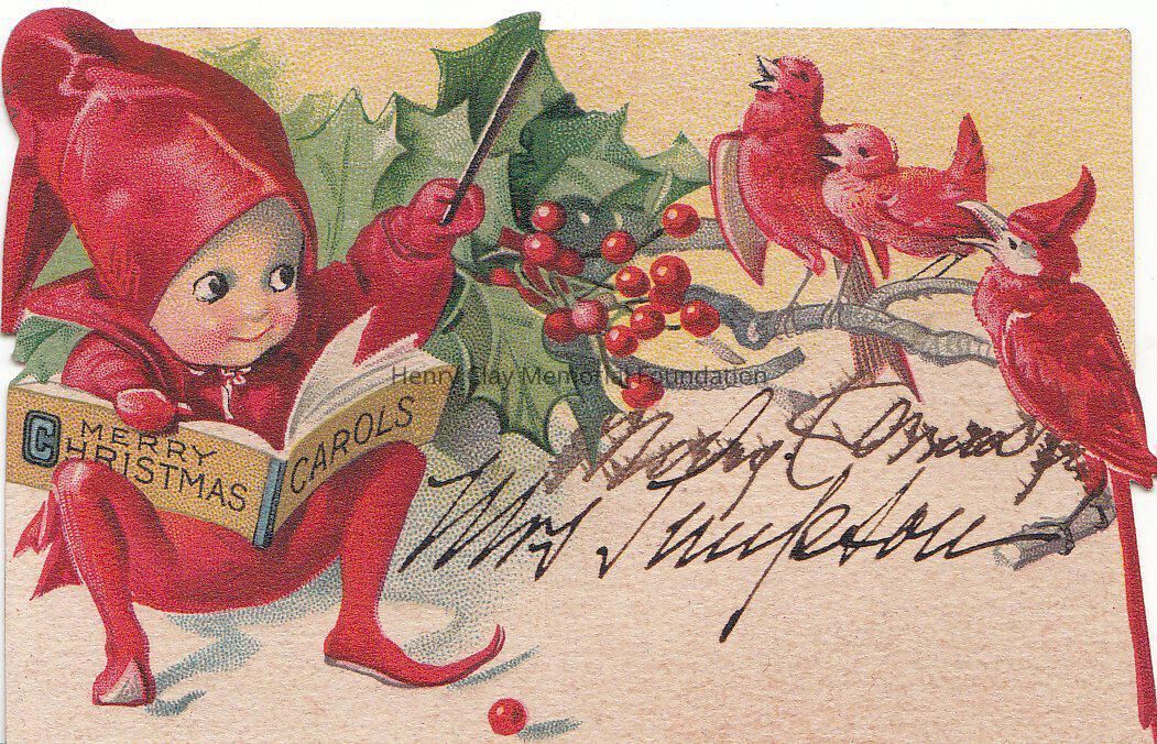 A small card with an elf in front directing red birds, singing carols on a holly branch. Writing in pen.