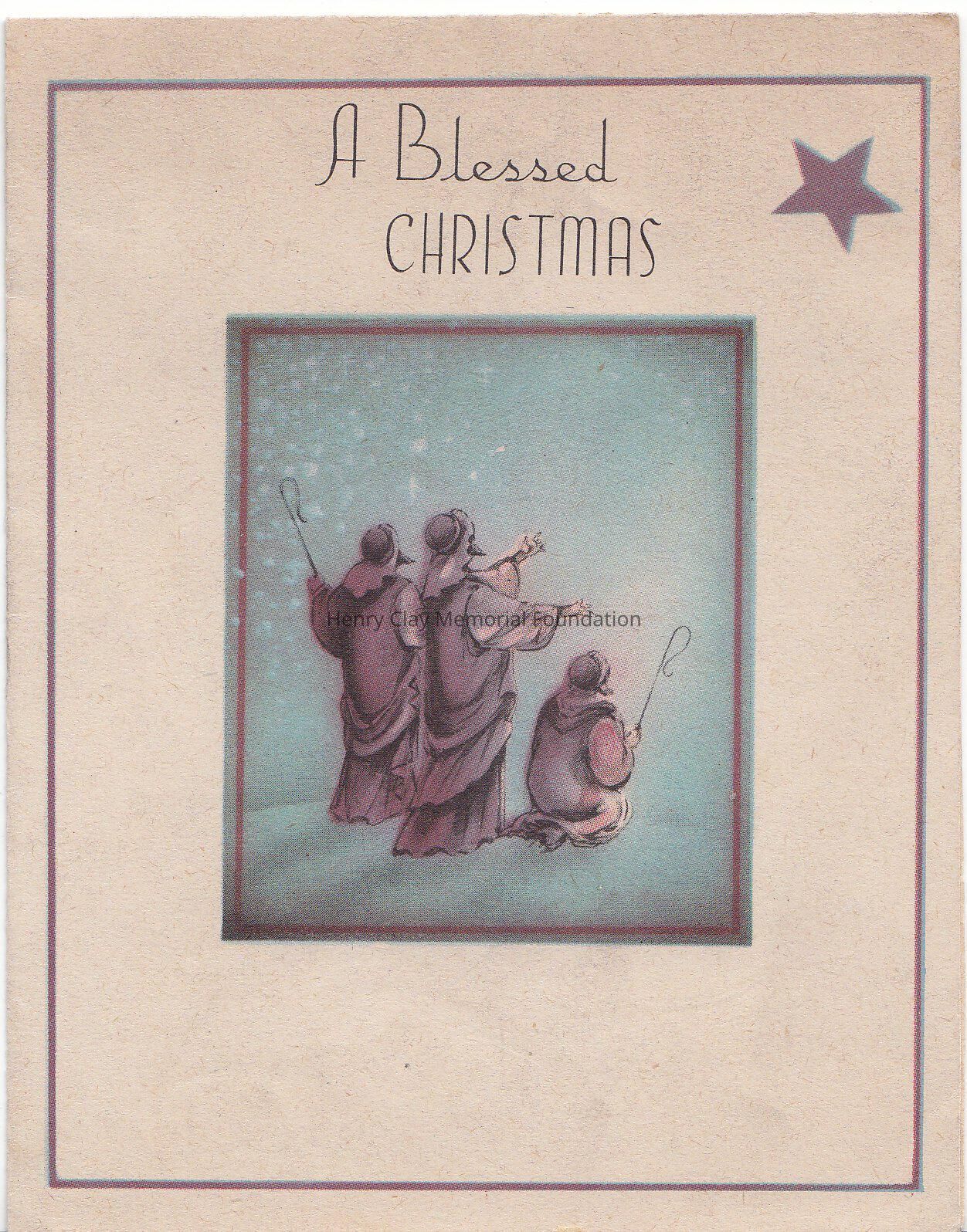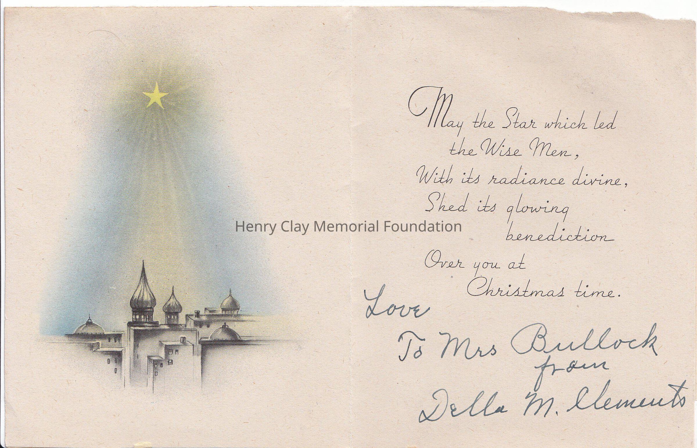 A christmas card with a drawing of the Three Magi, "A Blessed Christmas" on top of drawing and a star in the corner. Inside a drawing on the left page, rooftops and a star, on the other page in pen " Love To Mrs Bullock from Della M.Clements" under a printed greeting,