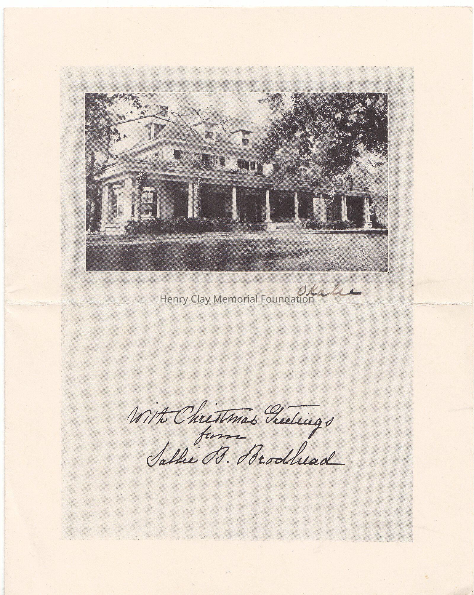 A Christmas card, with a picture of a house depicted on the top half. Under the house in pen, "OKallee" and always in pen on the bottom half " With Christmas Greetings from Sallie B. (Arodluad?).