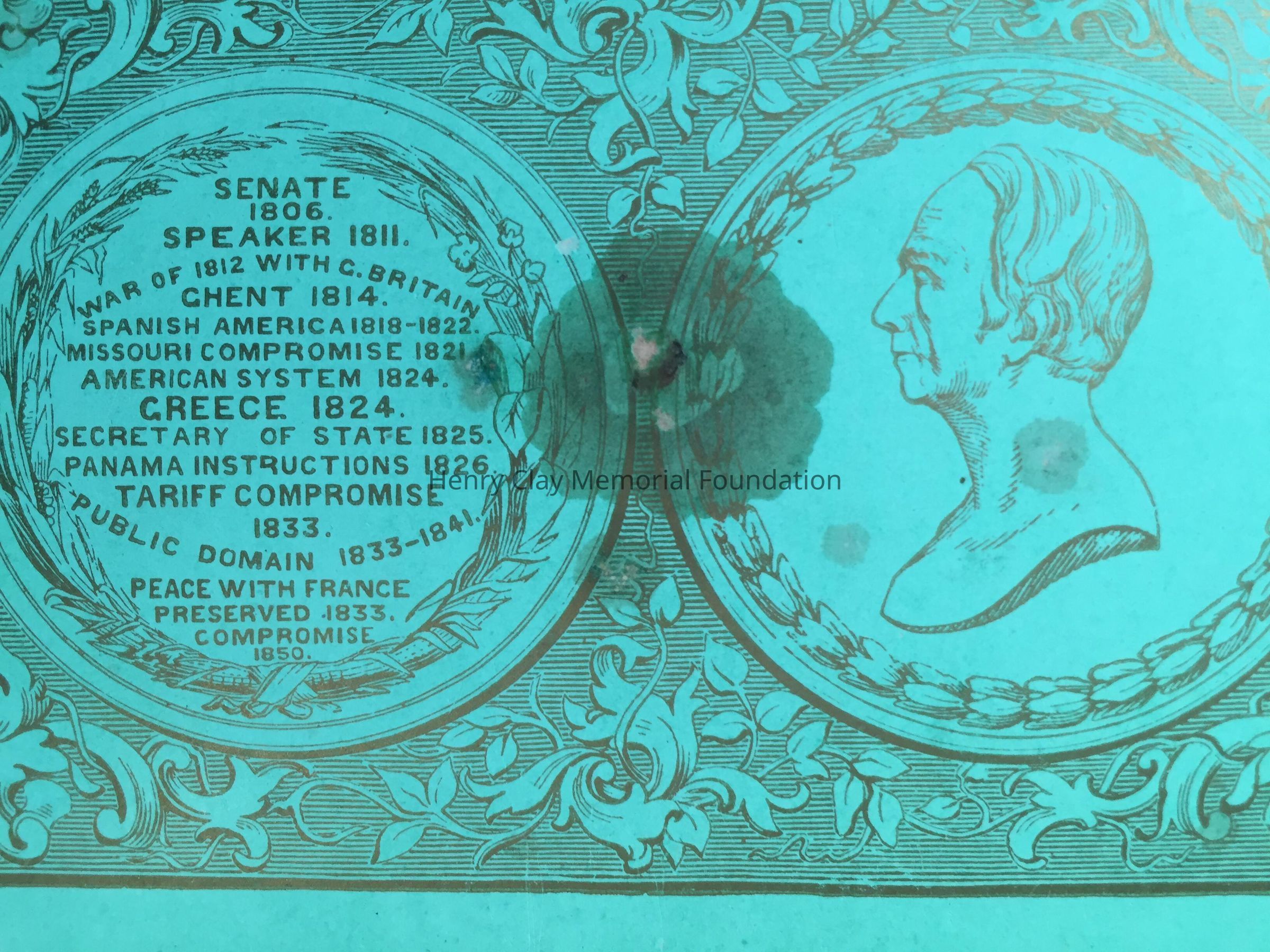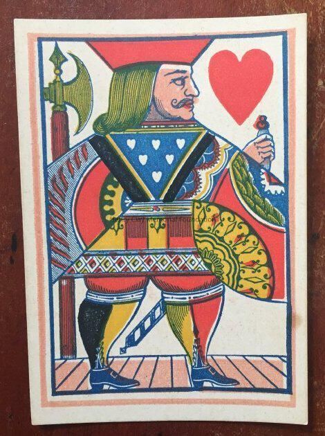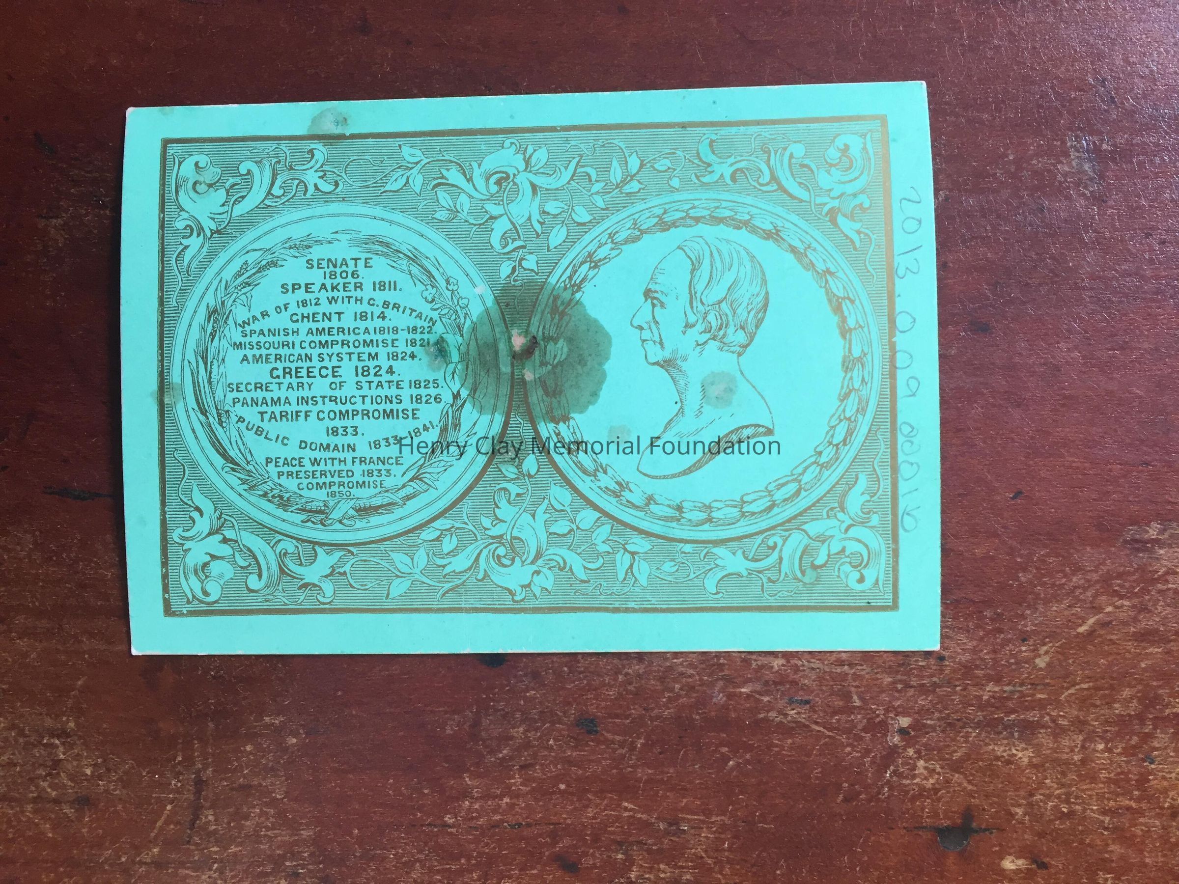 Jack of Hearts card.On the back is Henry Clay's side portrait on the back in a circle on the right of the card. On the left of the back of the card there is a circle with a list of Clay's achievements including "Senate 1806" "Speaker 1811" "War of 1812 with C. Britain" etc. The back of the card is printed in green and red ink.