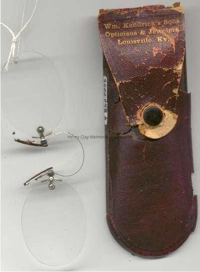 (B) Torpedo-shaped case is metal covered with brown coated paper. Flap at top of case secures with button snap on front. Lined with black velvet. (C) Broken case flap used to close case embossed in gold lettering: " Wm. Kendrick's Sons/ Opticians & Jewelers / Louisville, Ky." Hole torn on flap. Button still attached to bulk of case. Case flap is brown leather unlike case body.