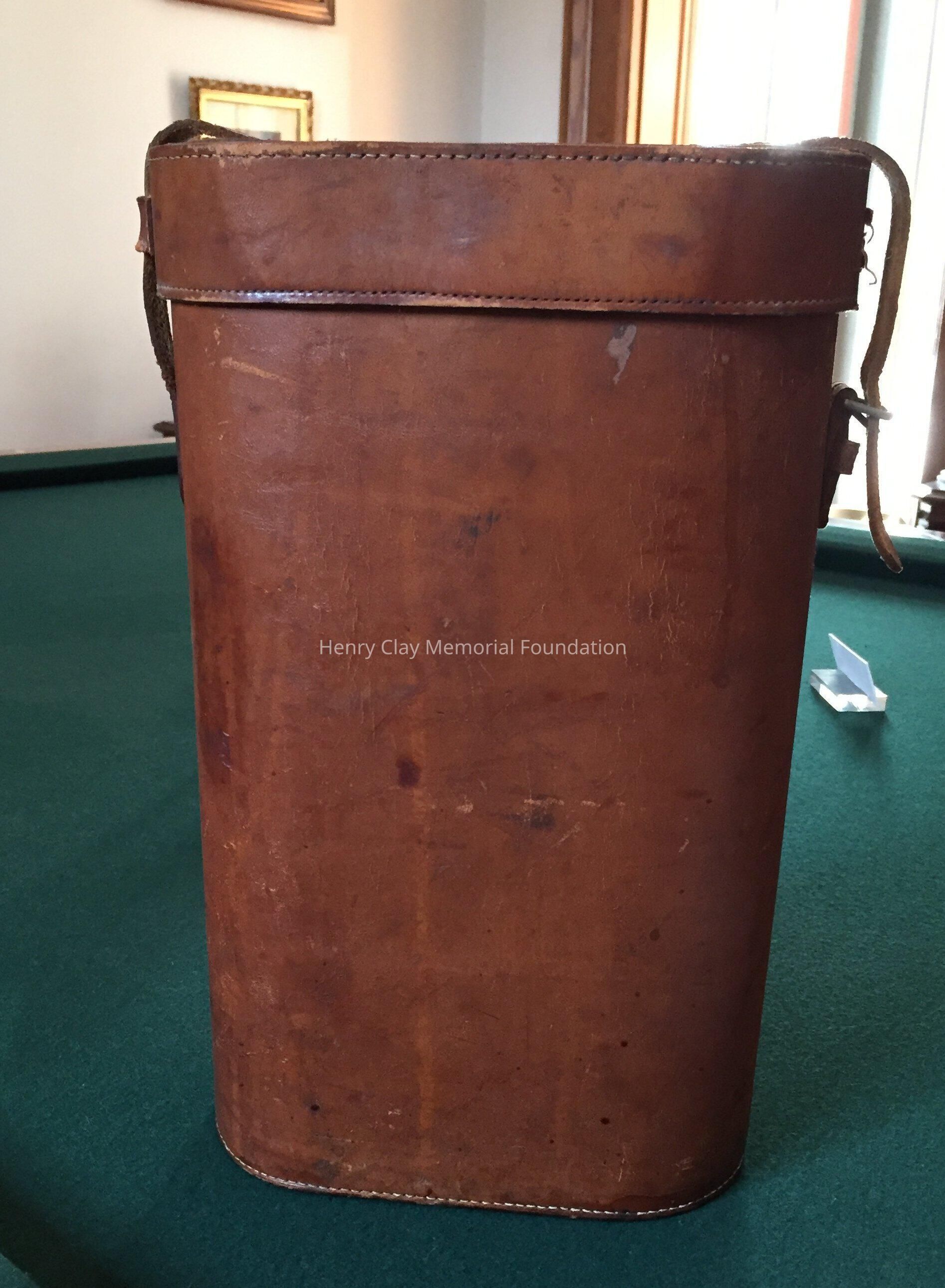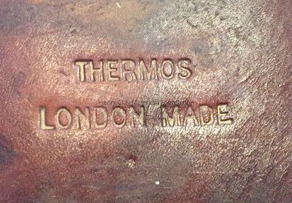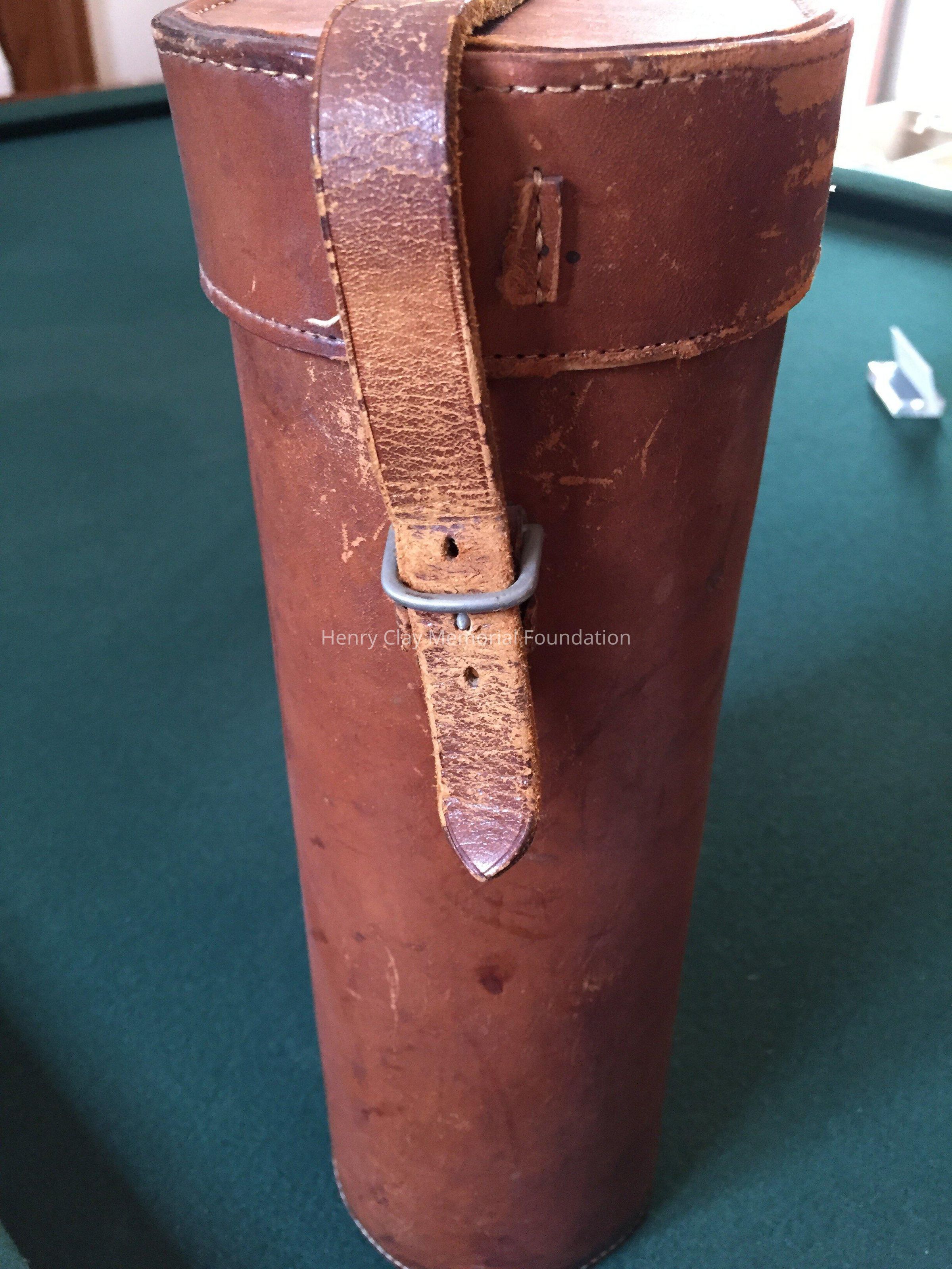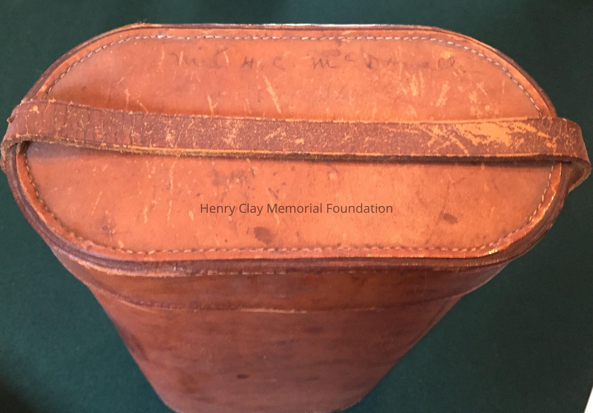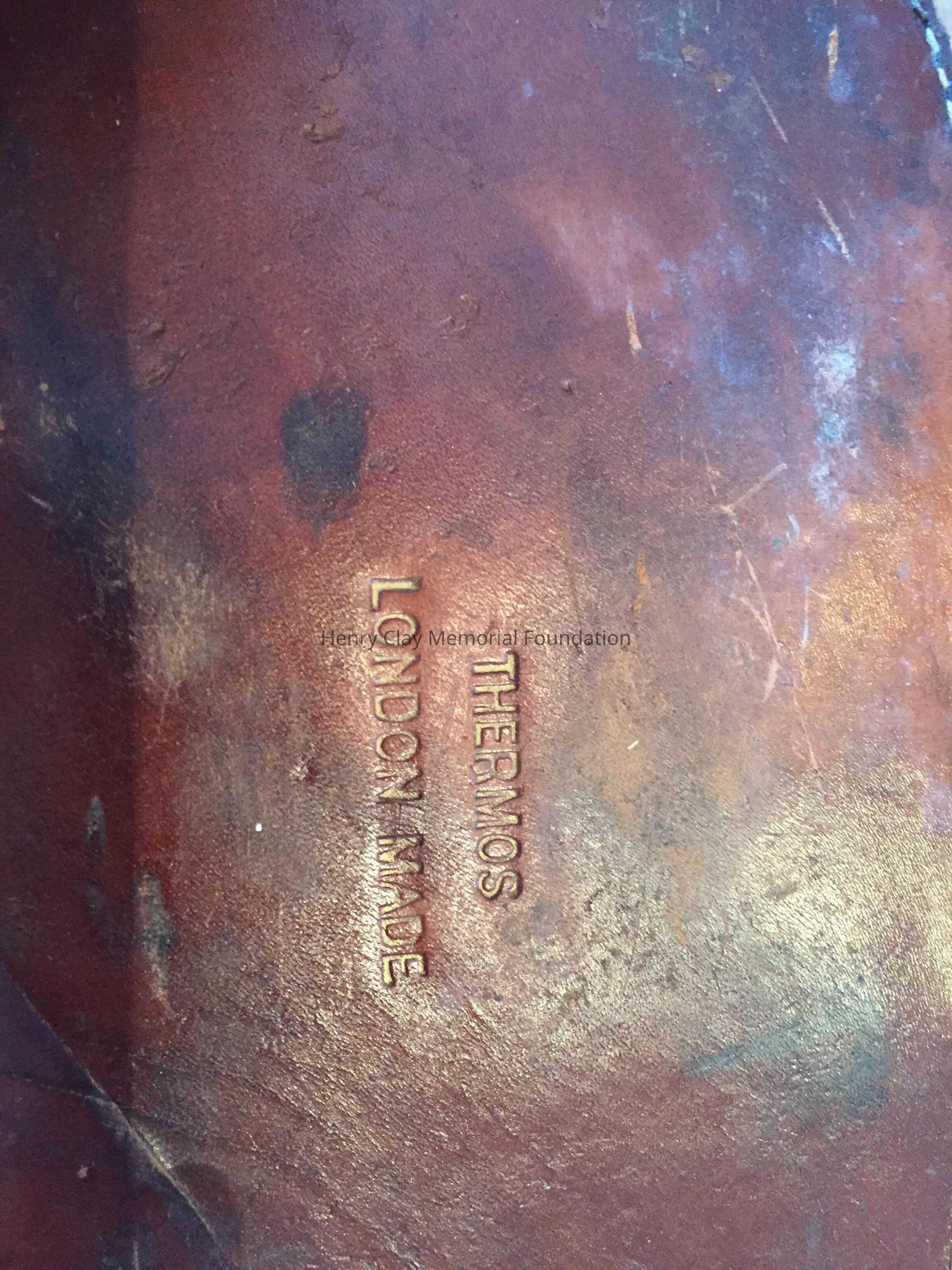 Leather case to hold two thermoses, signed on top "Mrs. H.C. McDowell." Stamped on bottom: "Thermos London made." One metal thermos with top.