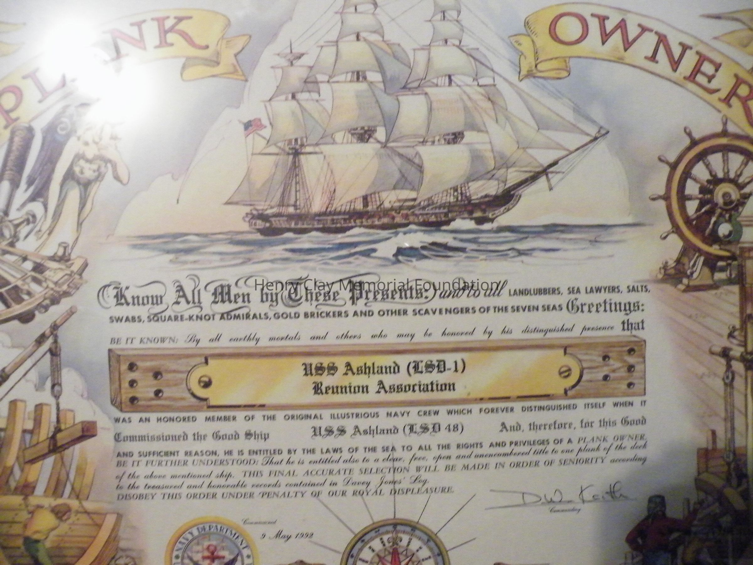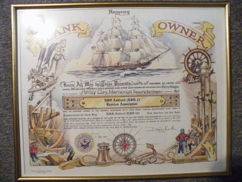 This is a plankowner's certificate that has a descriptive note reading, "Honorary Plankowner Certificate Presented to the Cew of USS Ashland (LSD-1) by Captain Douglas Keith Commanding Officer USS Ashland (LSD-48) 9 May 1992". The certificate is set in a golden colored frame. The certificate has writing in the middle, and it has nautical drawings around the edges, including a ship with sails, navigation equipment, and various other parts of a ship and its crew.