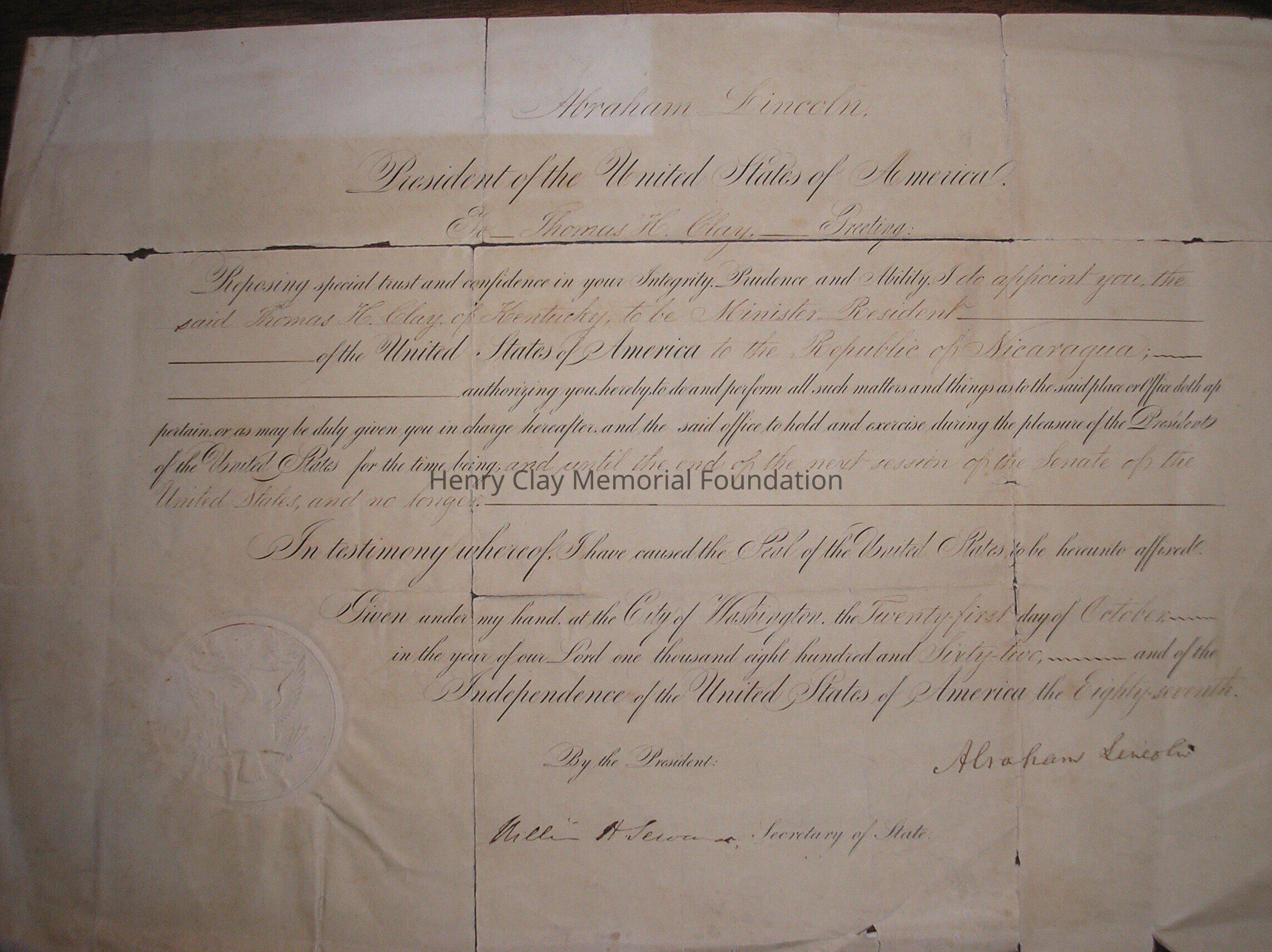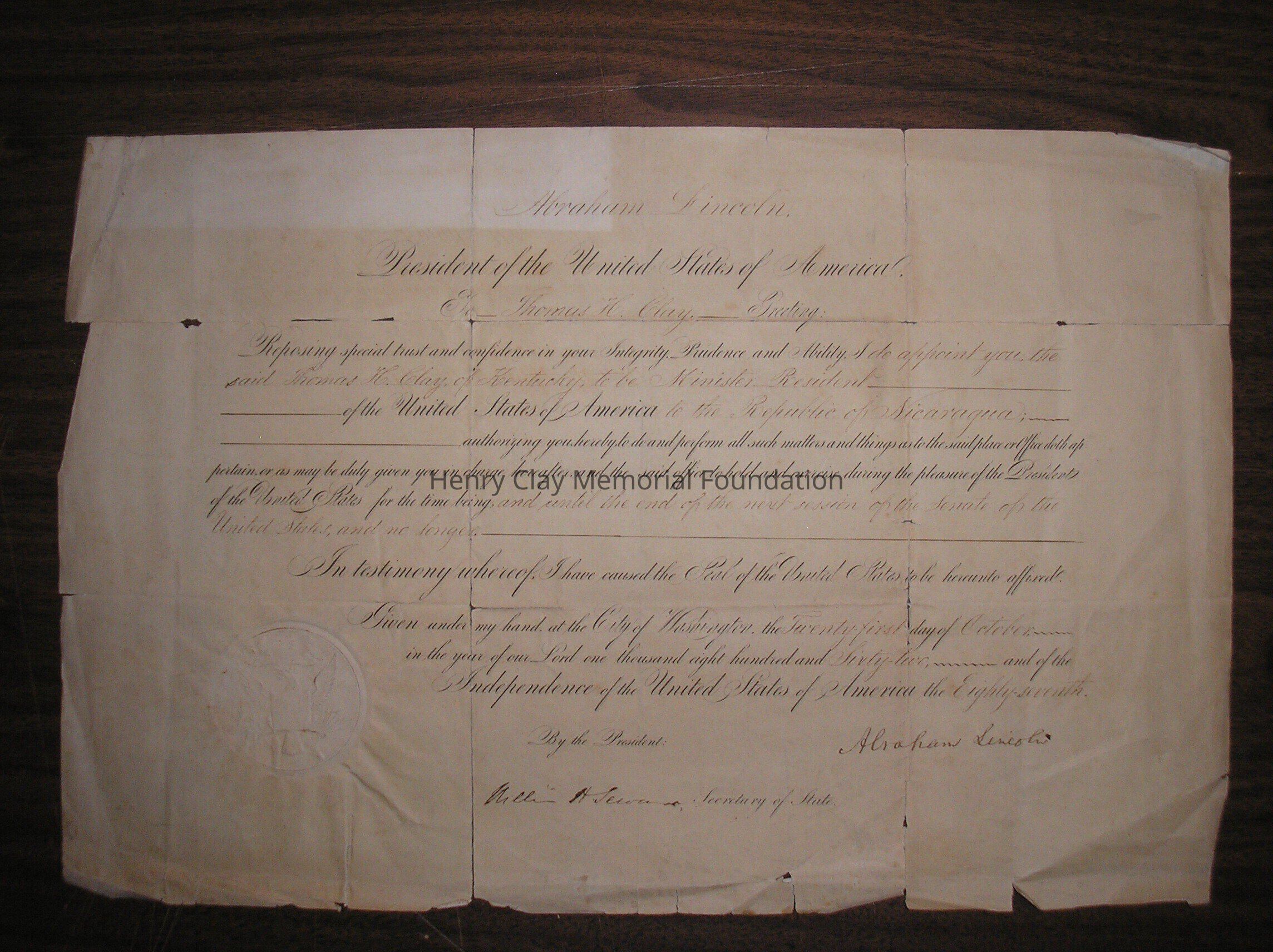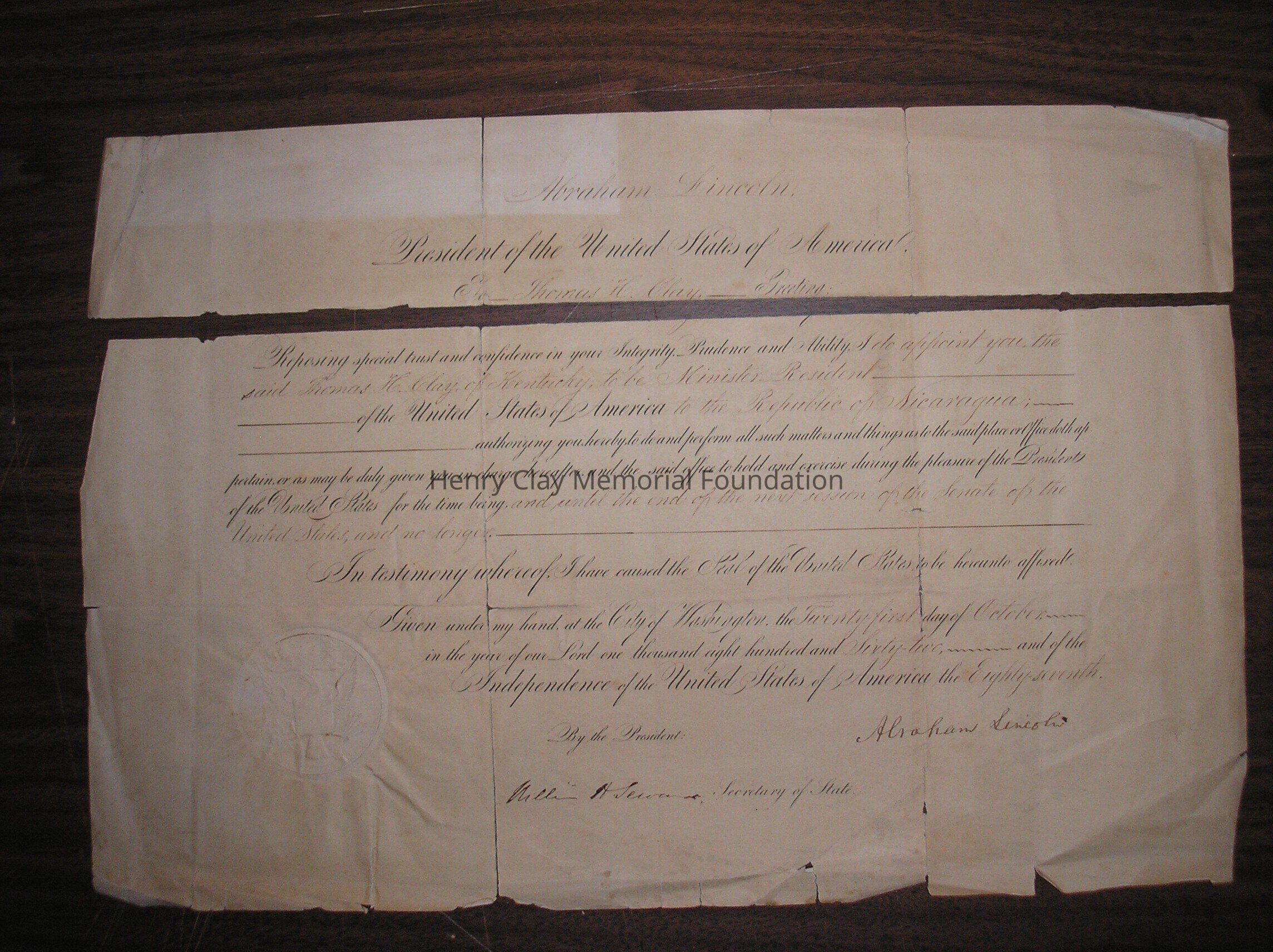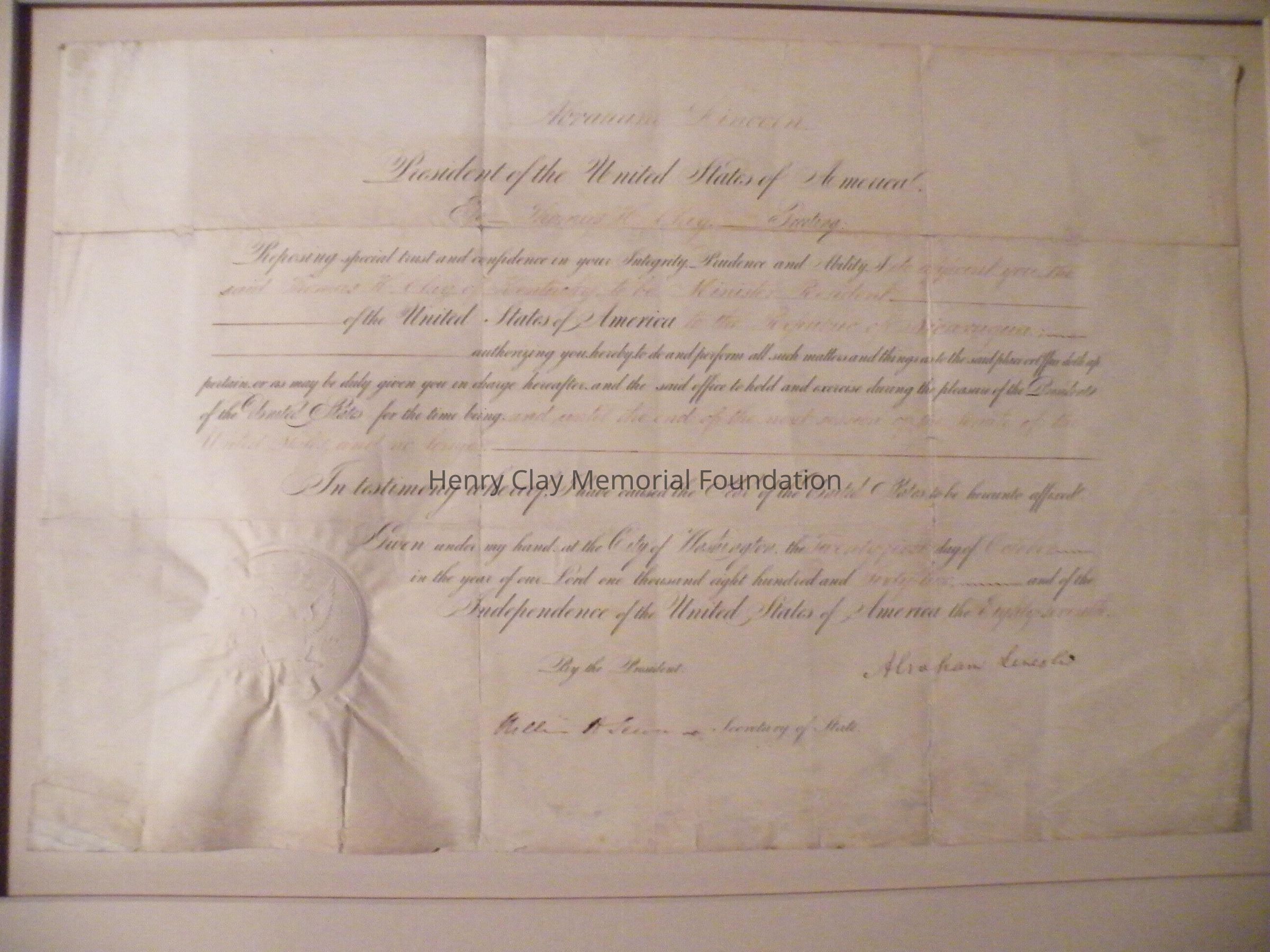 A Certificate of appointment to the post of Ambassador to Nicauragua for Thomas Hart Clay, signed by Abraham Lincoln and William Seward.