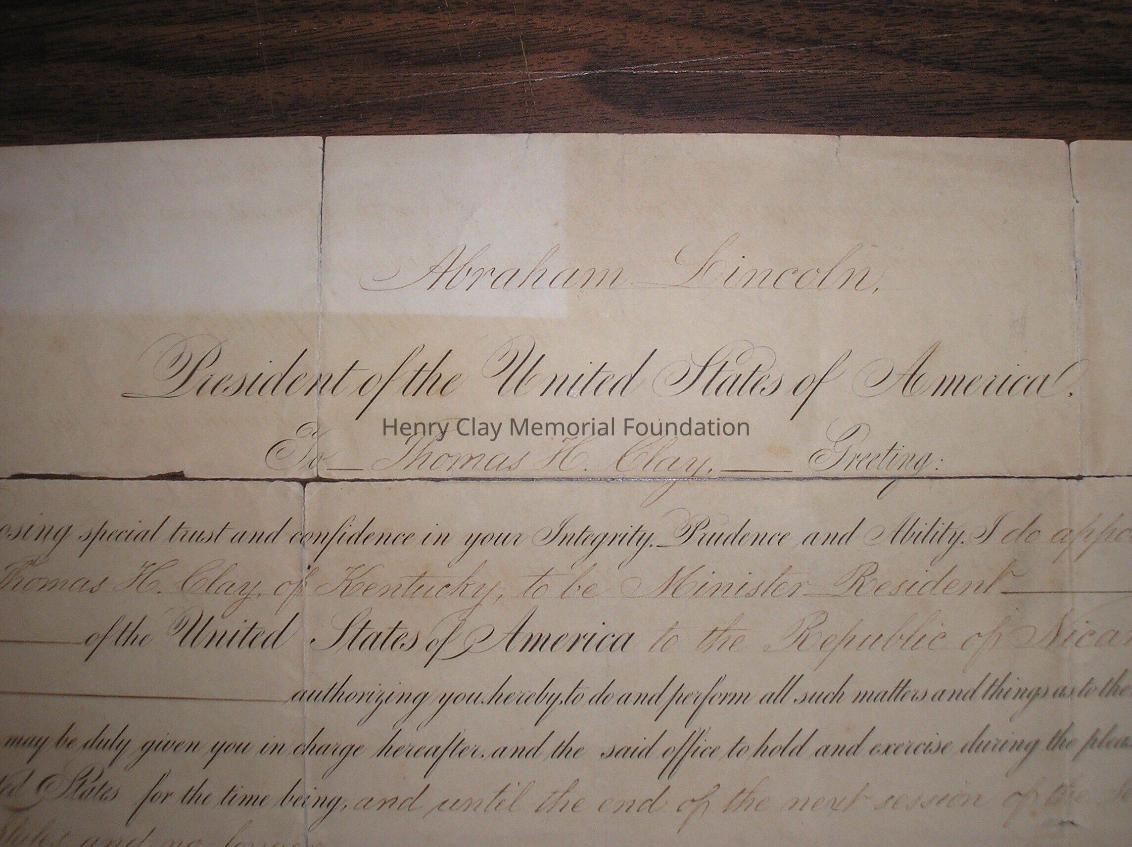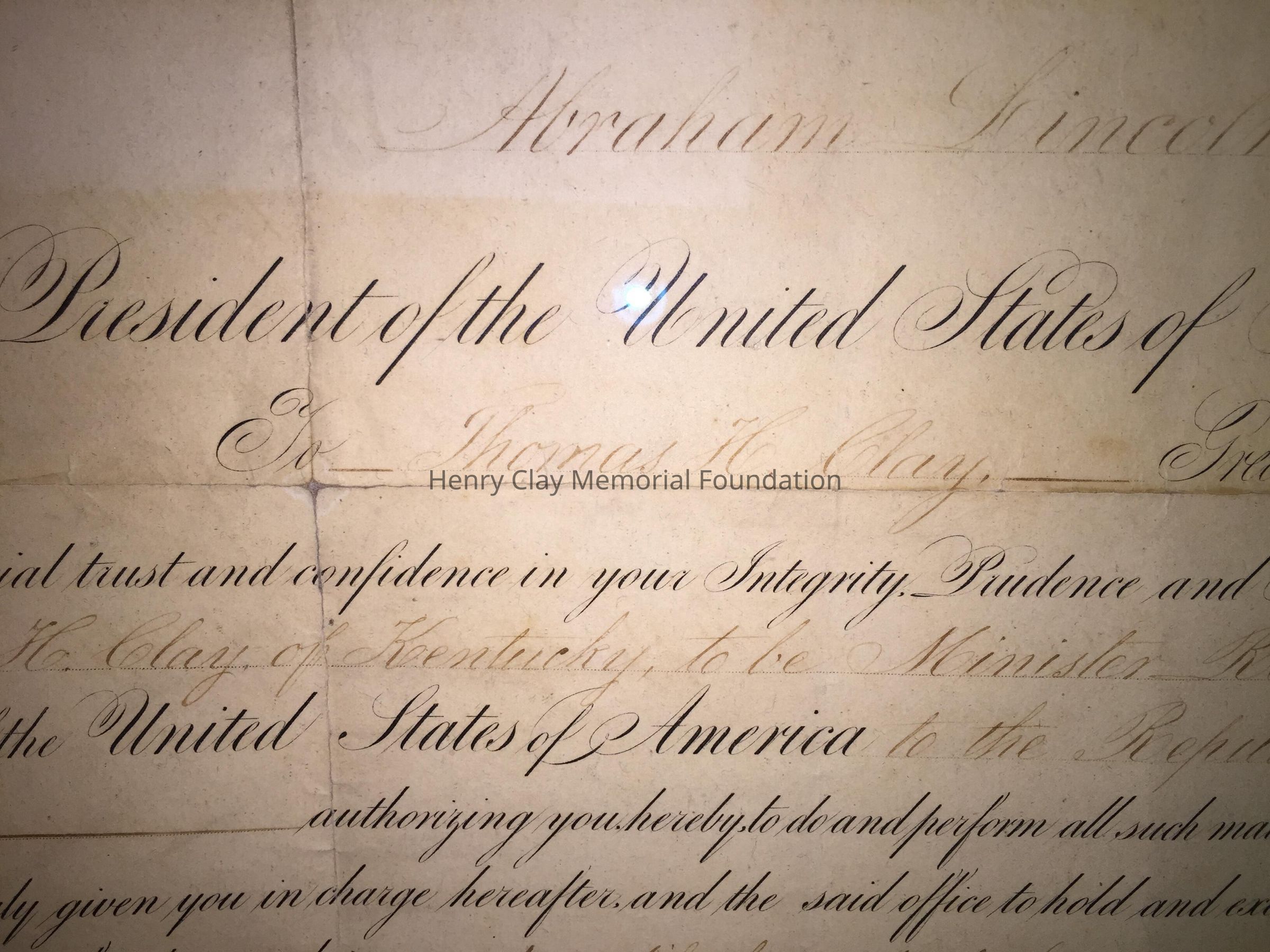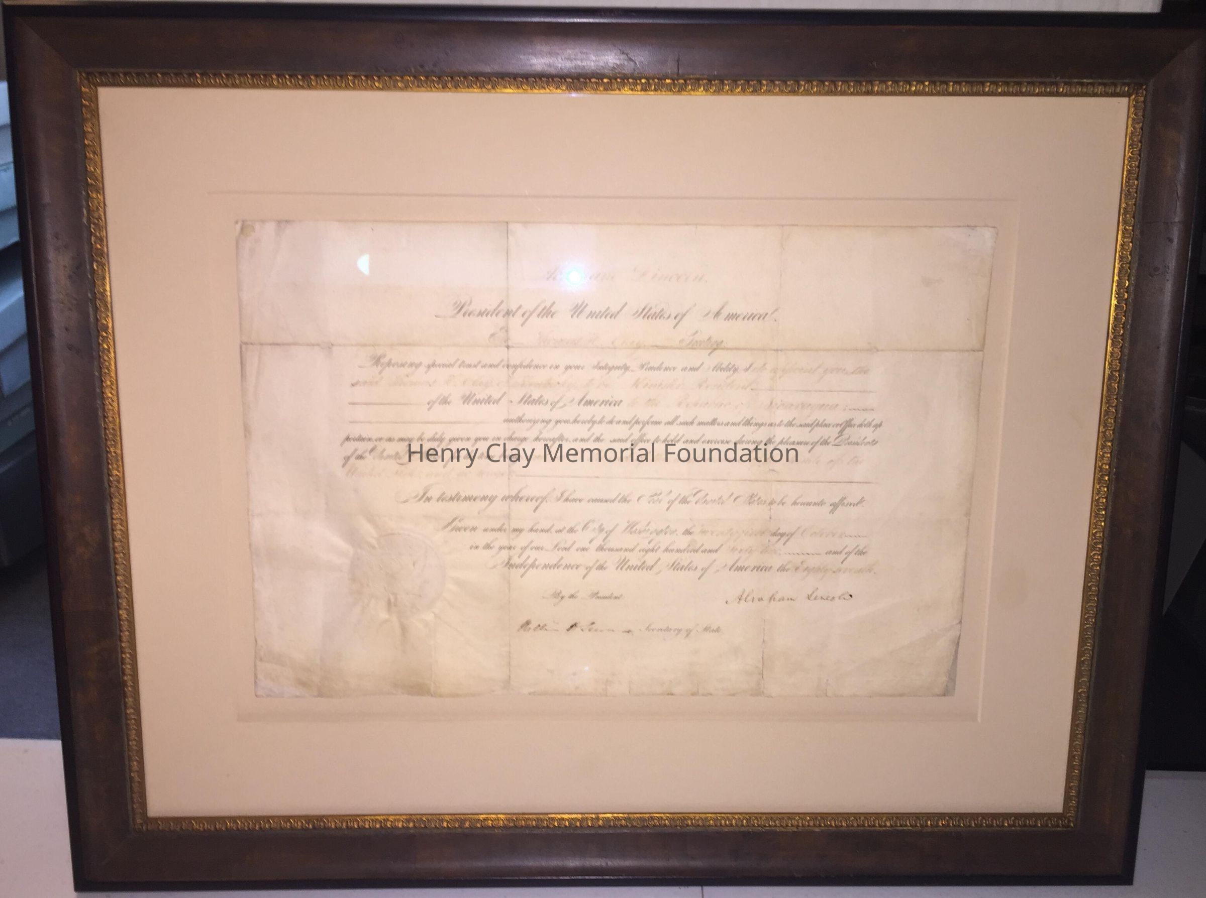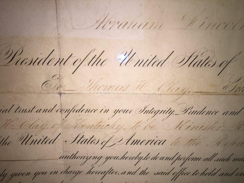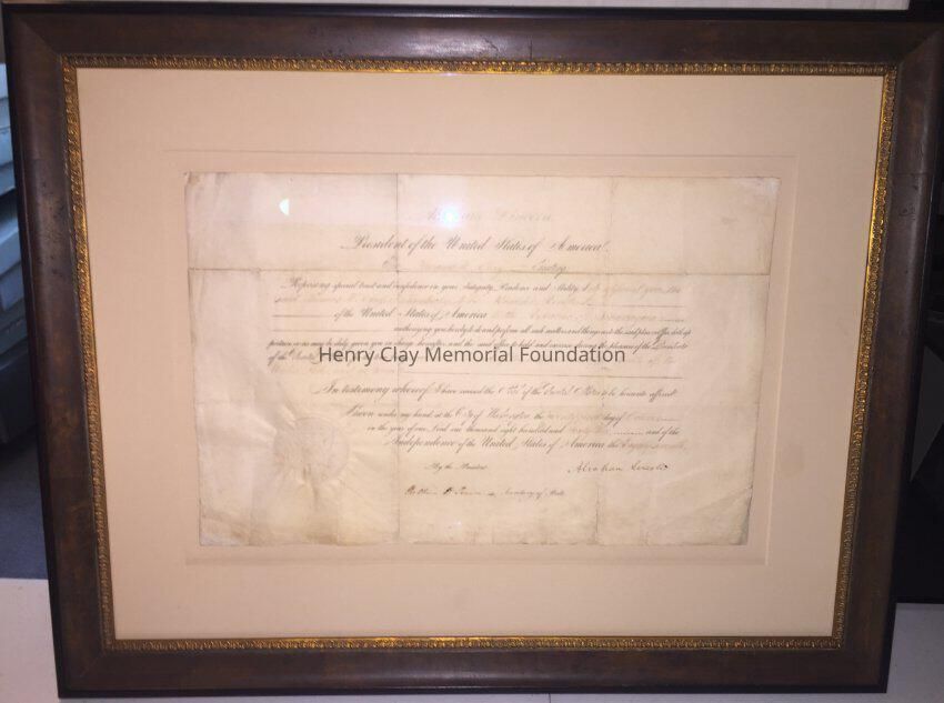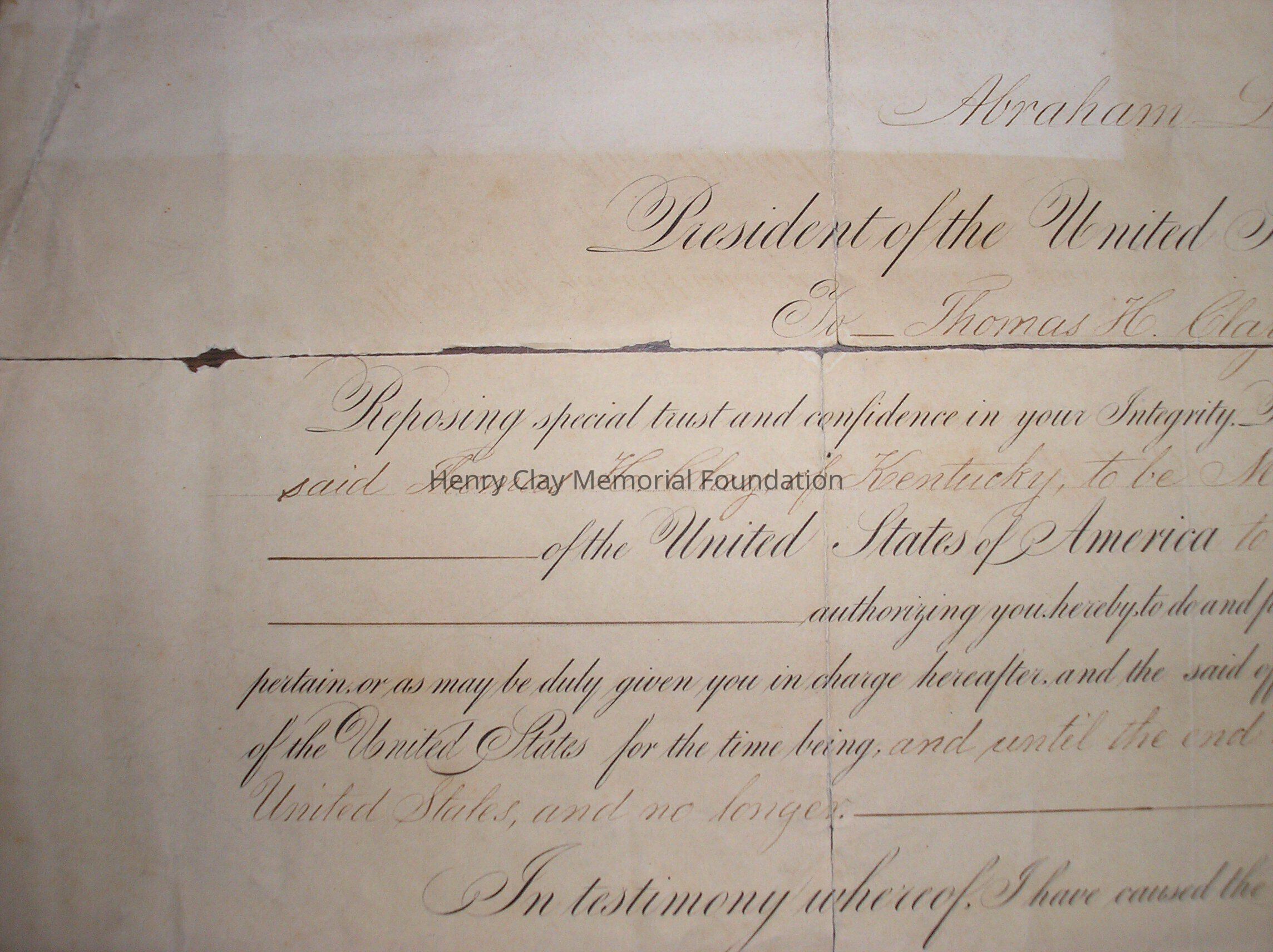A Certificate of appointment to the post of Ambassador to Nicauragua for Thomas Hart Clay, signed by Abraham Lincoln and William Seward.