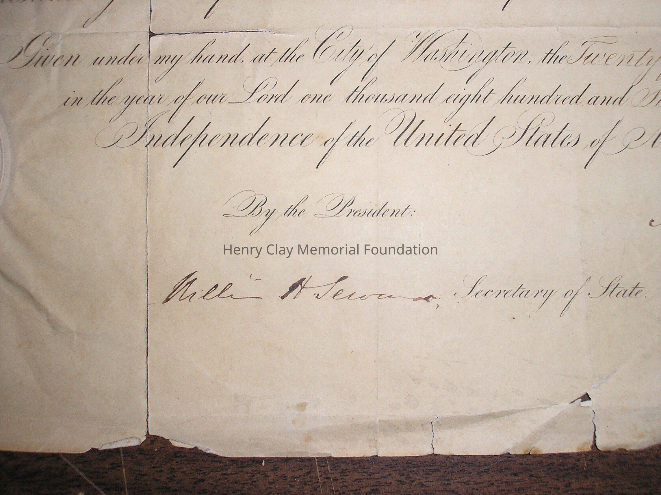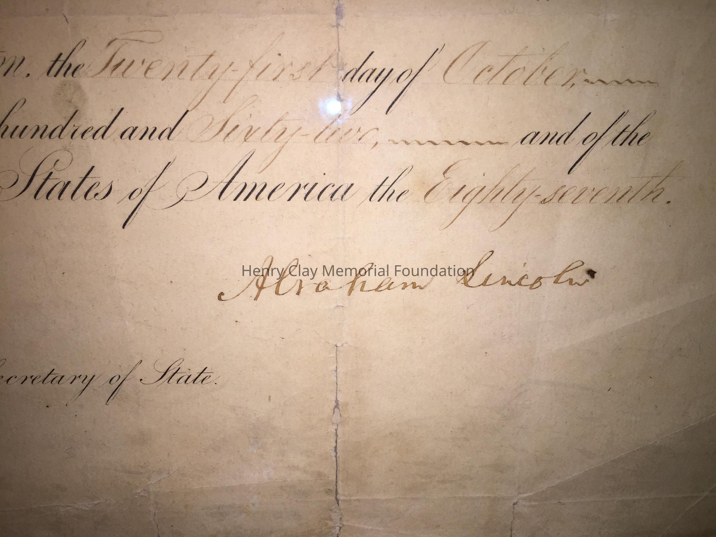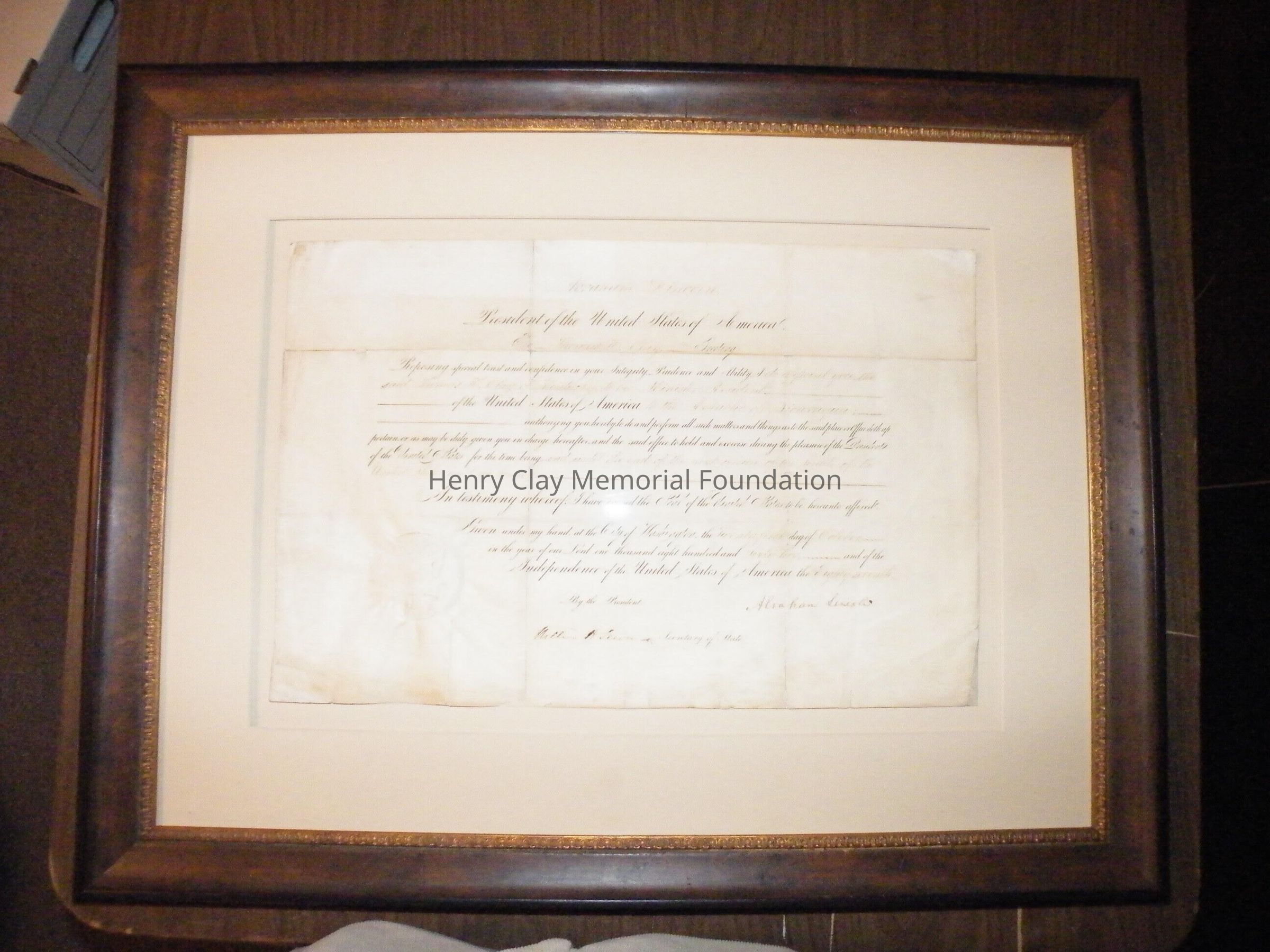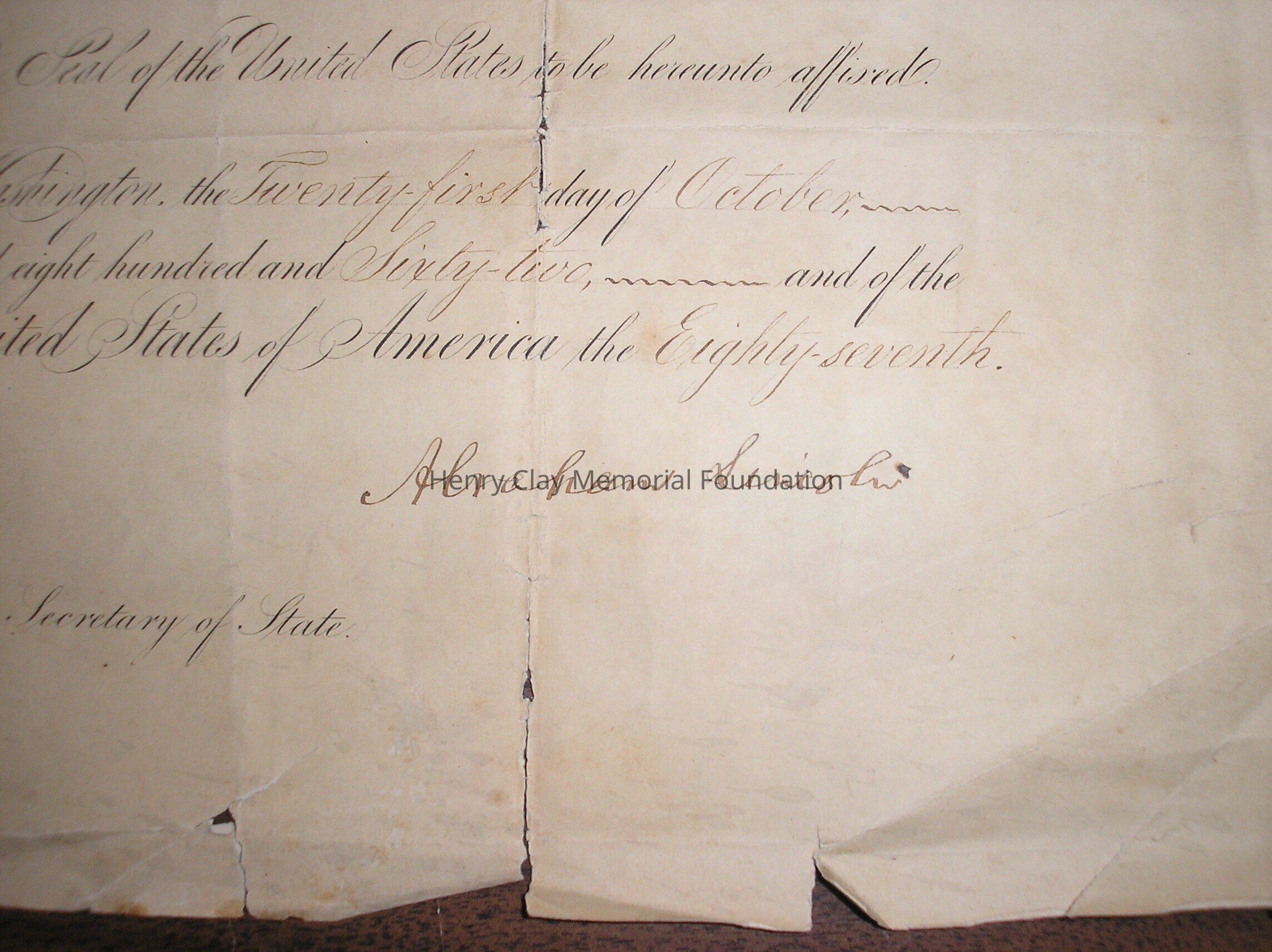 A Certificate of appointment to the post of Ambassador to Nicauragua for Thomas Hart Clay, signed by Abraham Lincoln and William Seward.