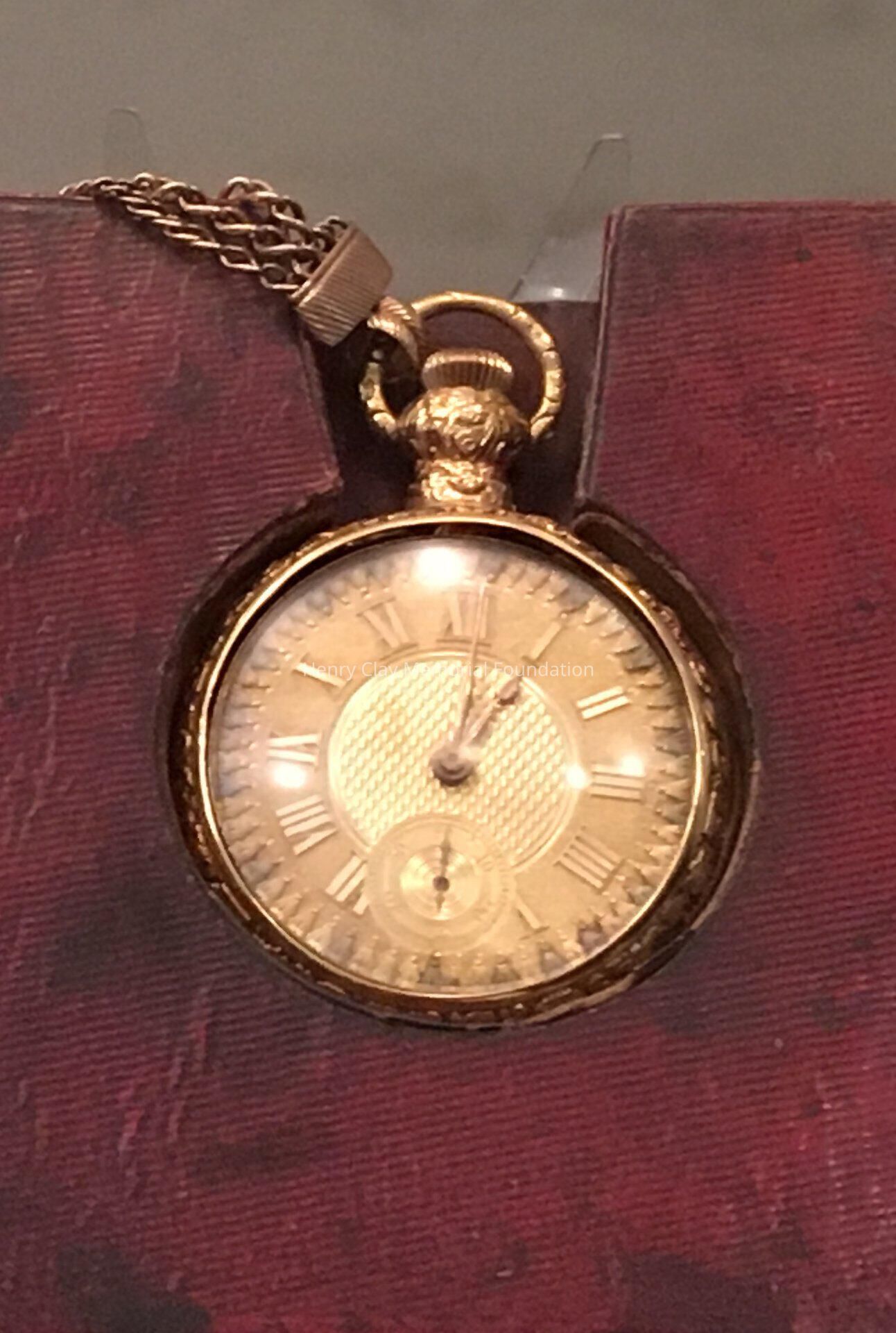A pocket watch with gold casing, gold chain, gold background, and gold roman numbers.