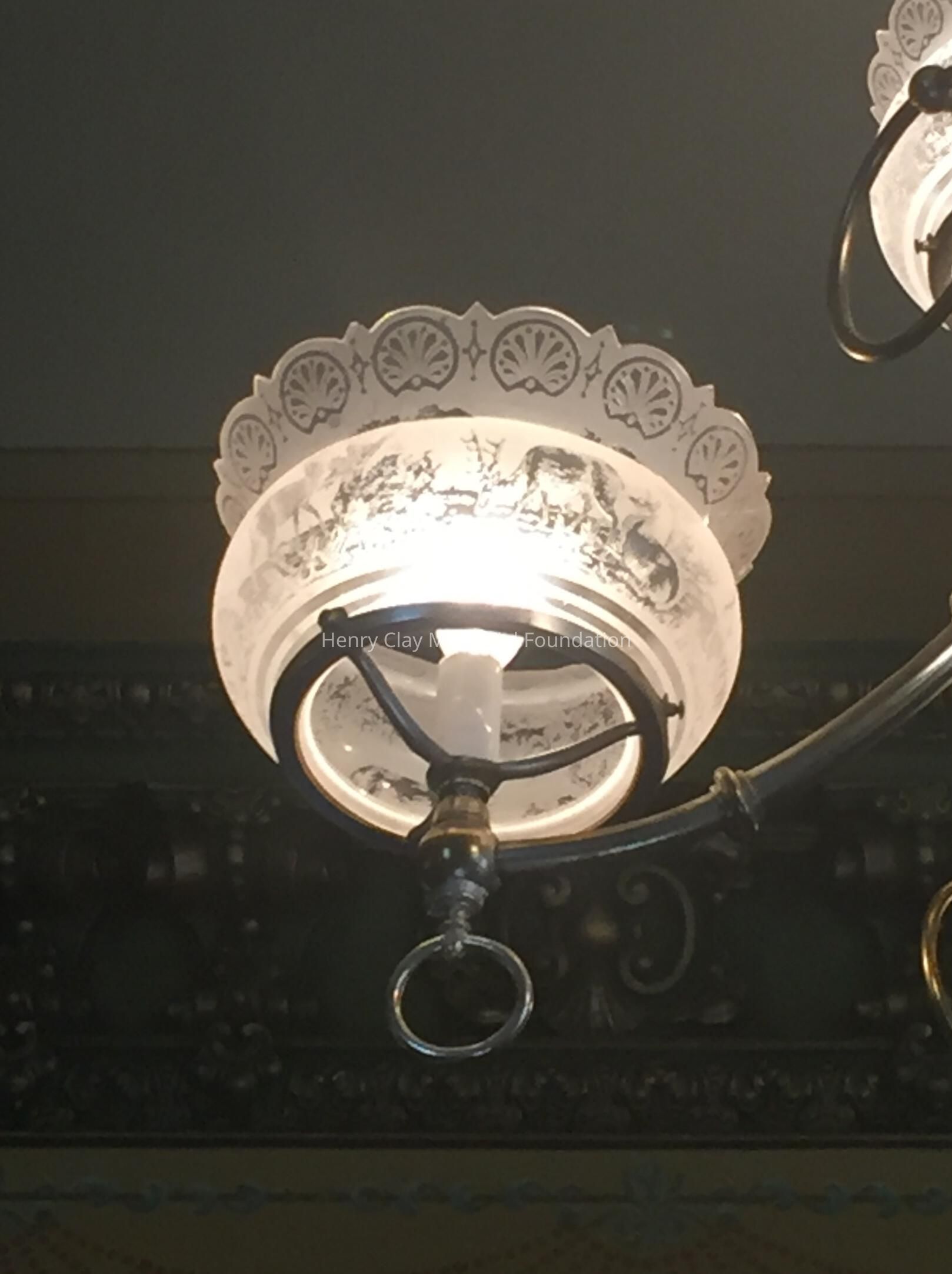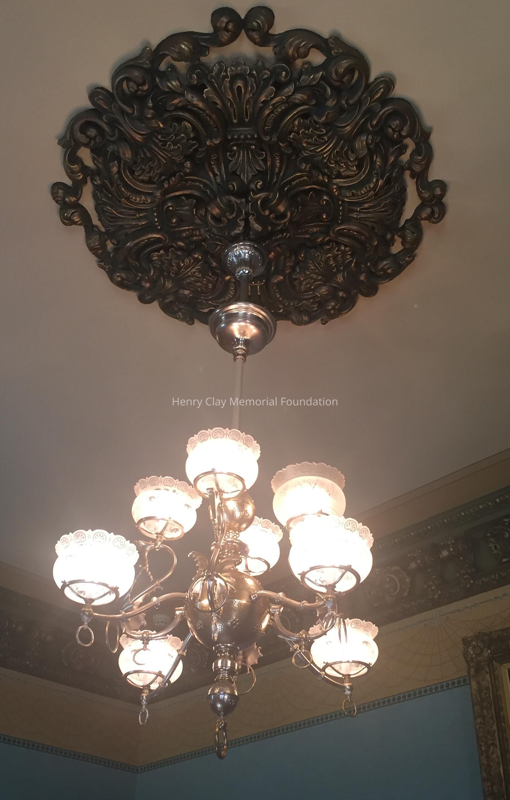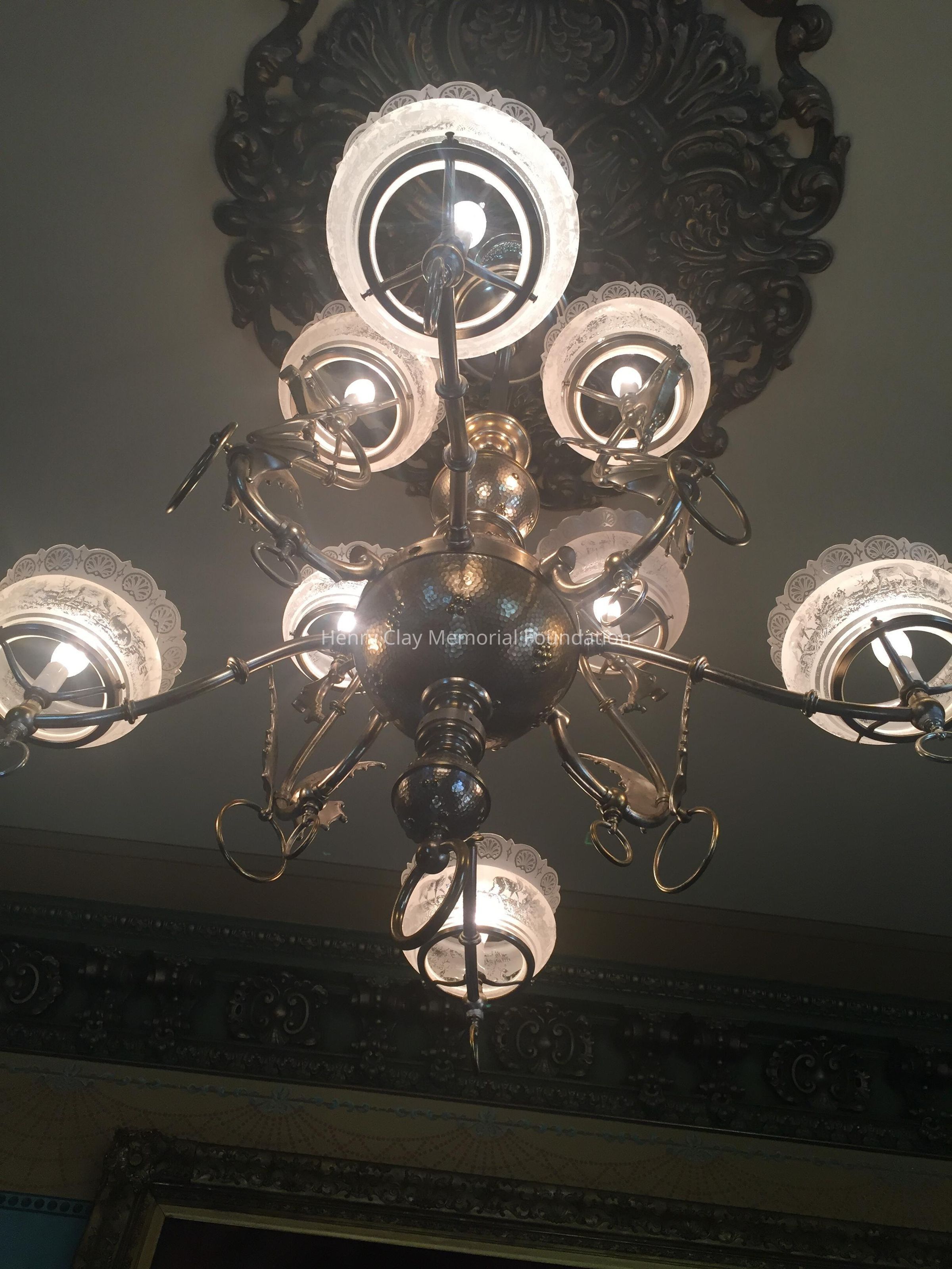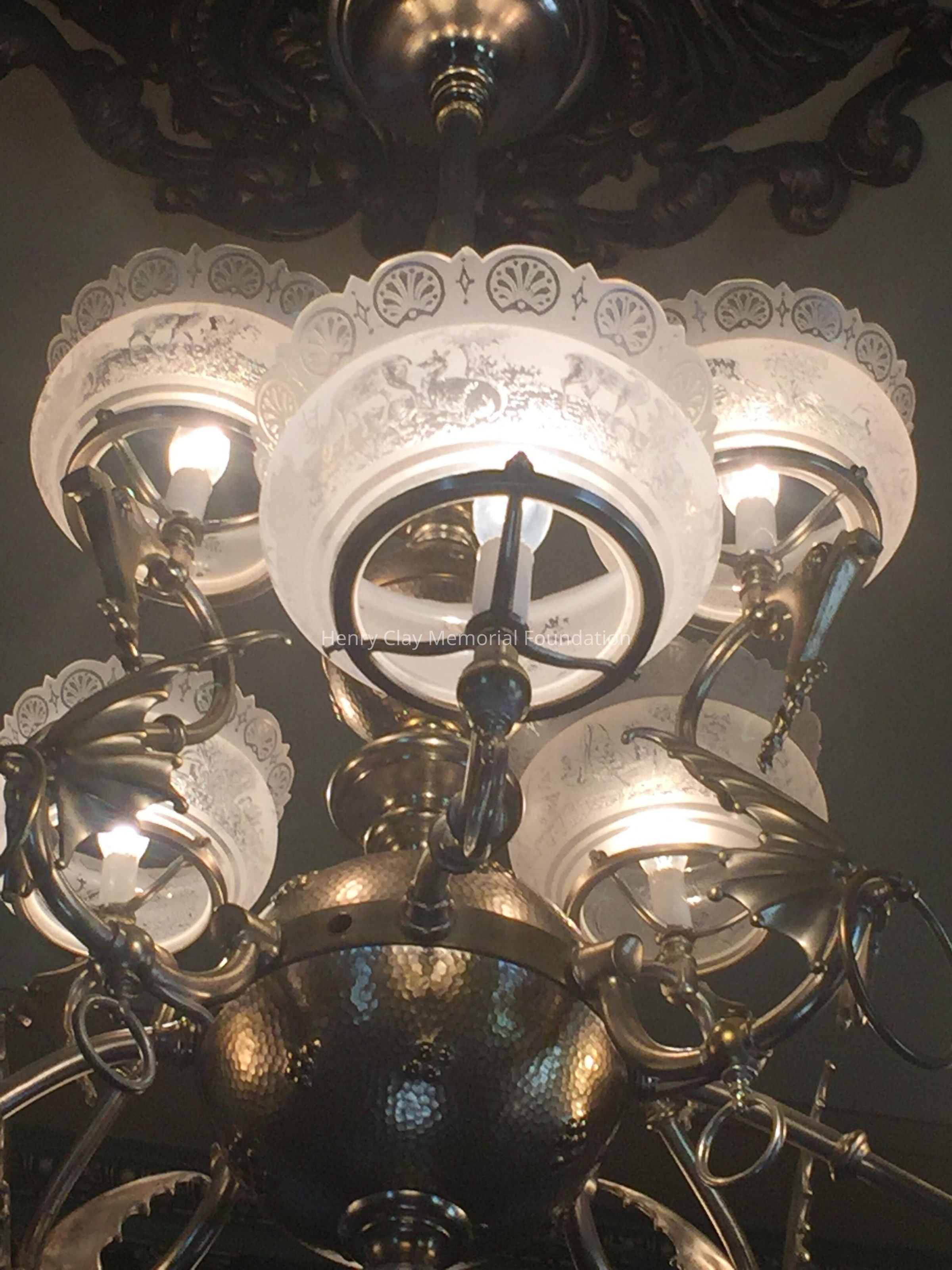 Metal, with etched glass globes, 8 arms on 2 tiers with butterfly decorations. Gas originally converted to electricity c.1904. Original silver finish is electroplated on brass.