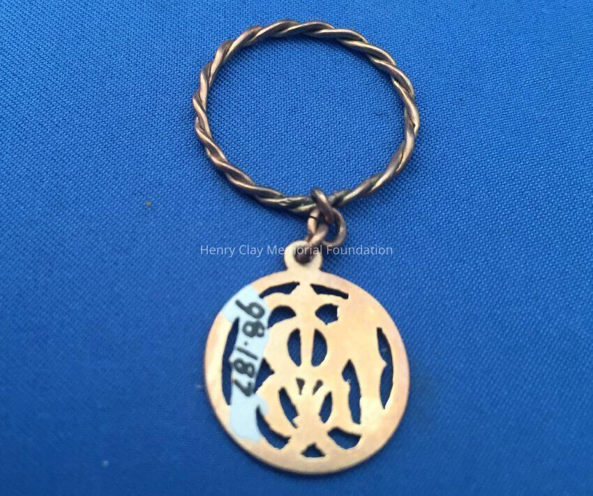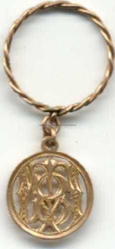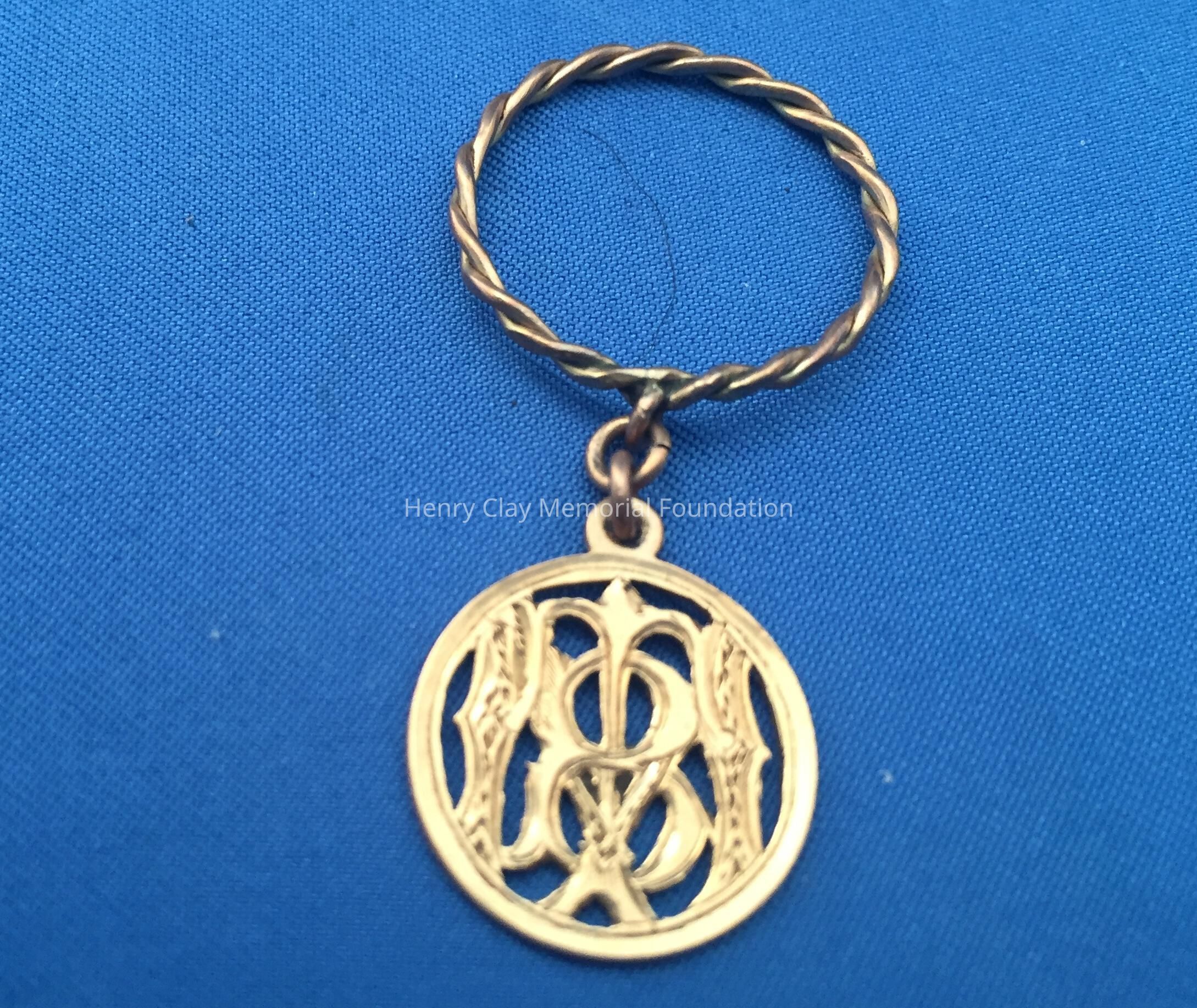 Round yellow metal charm with initials inside, looks like MB (?). Charm hangs from a twisted ring.
