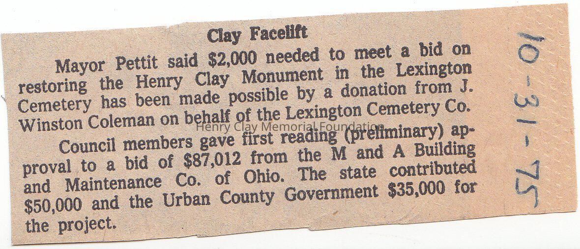 A small clipping regarding the need of $2000 to meet a bid on restoring Henry Clay Monument. The money was donated by J.Winston Coleman. The approval of a bid of $87012 was also accepted.