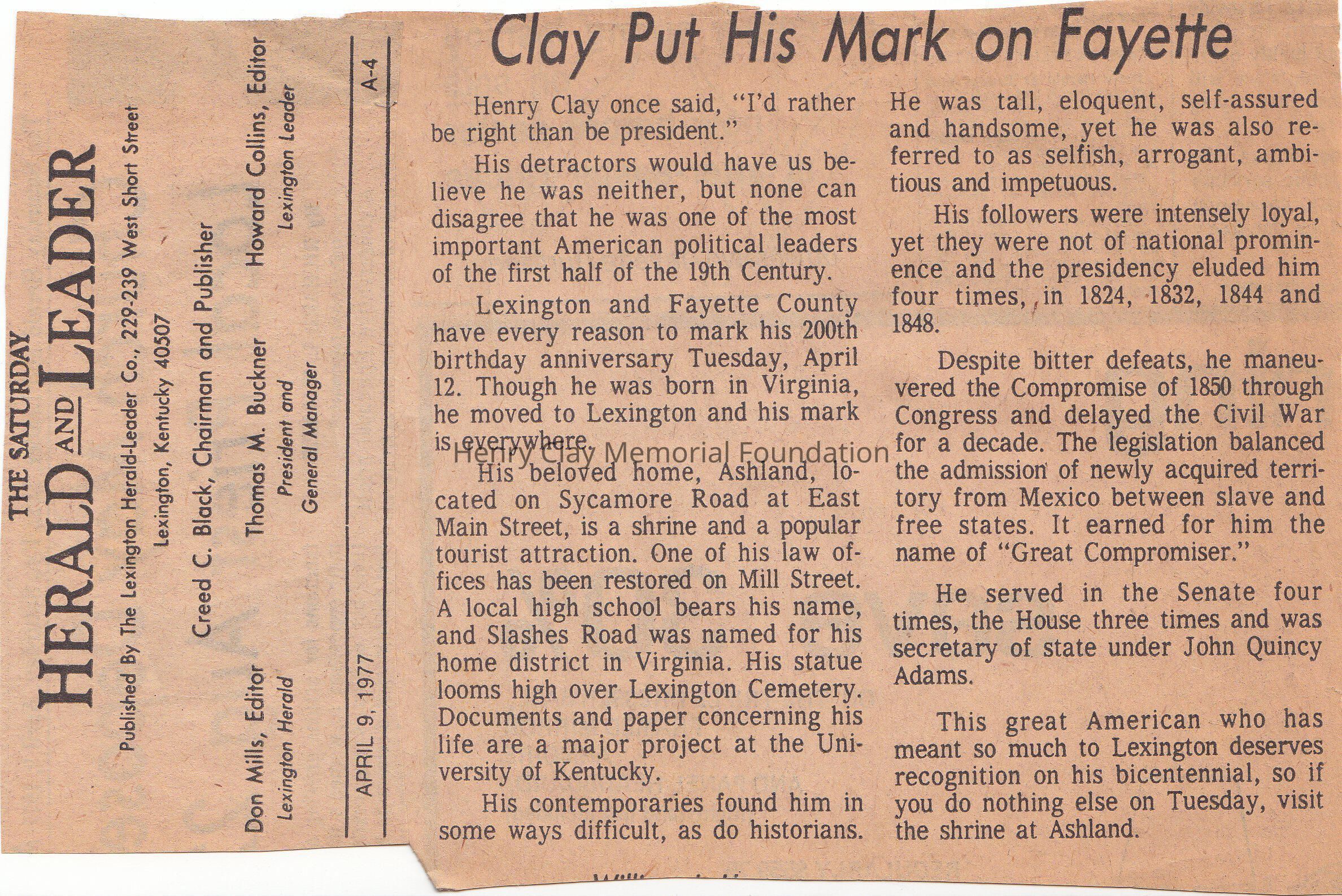 A small clipping about Henry Clay 200th birthday anniversary. The article talks about Henry Clay Ashland, his law office , his statue in the cemetery, his four attempt to presidency, in 1824, 1832, 1844, 1848