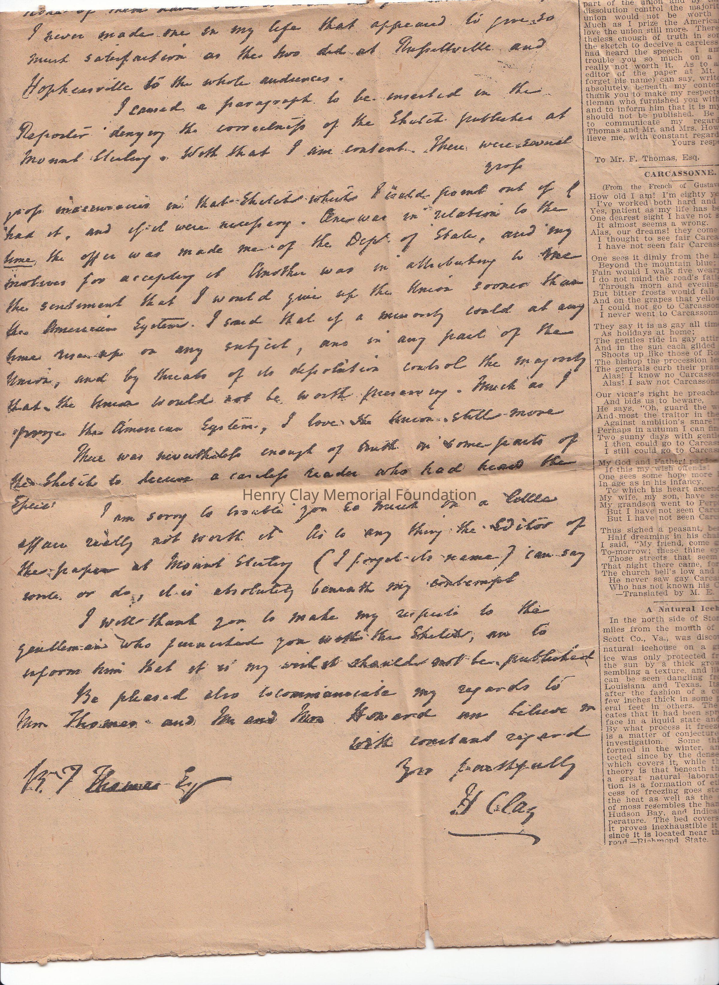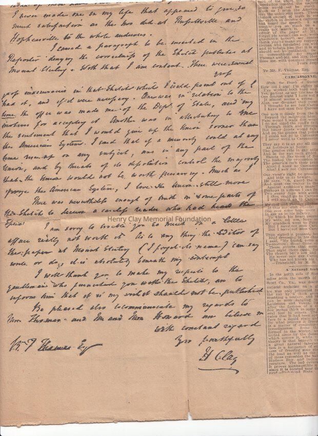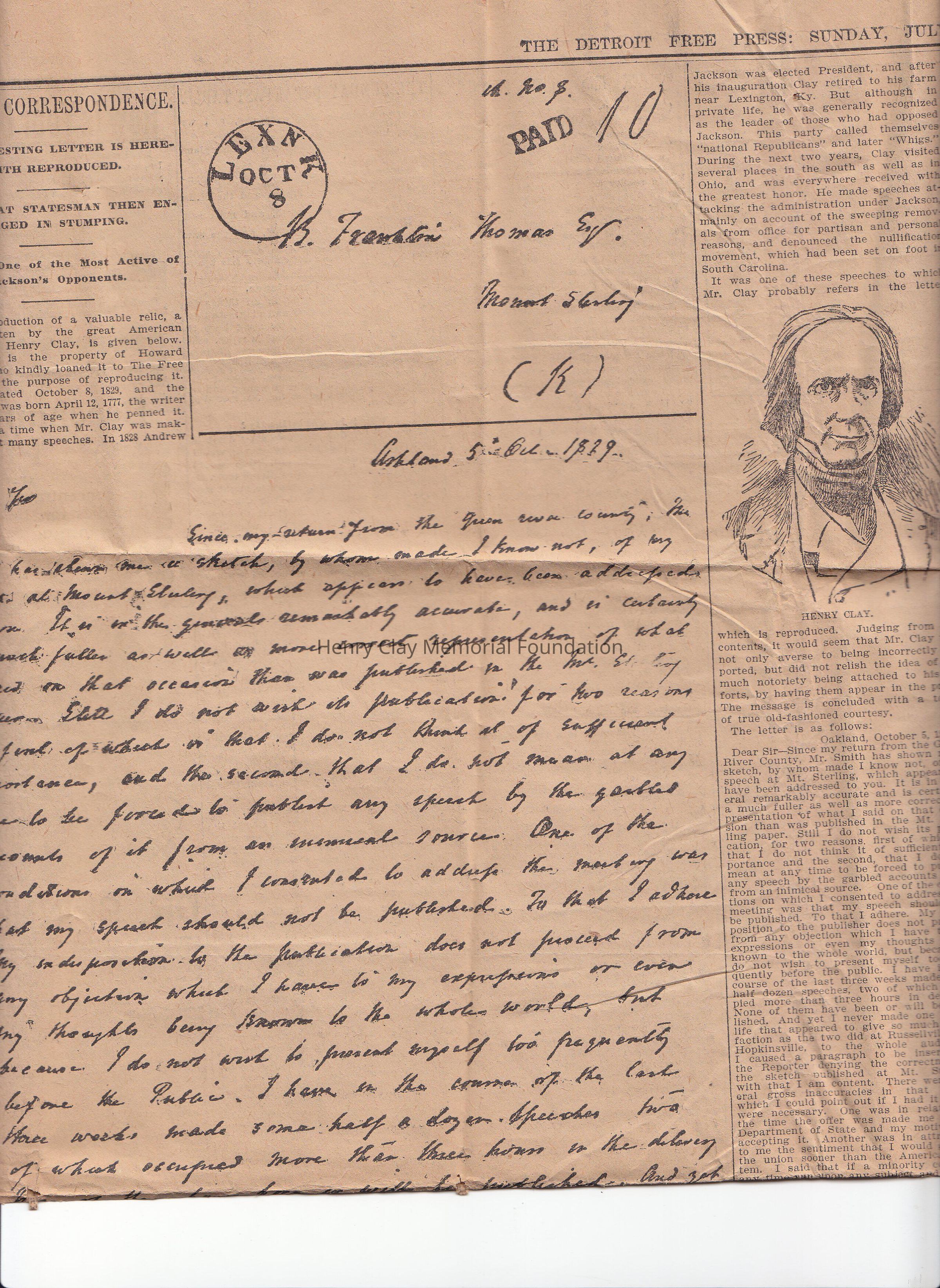 A reproduction of Henry Clay letter from October 5, 1829. The original was copied in large print, the transcription is typed on the right under henry Clay portrait.