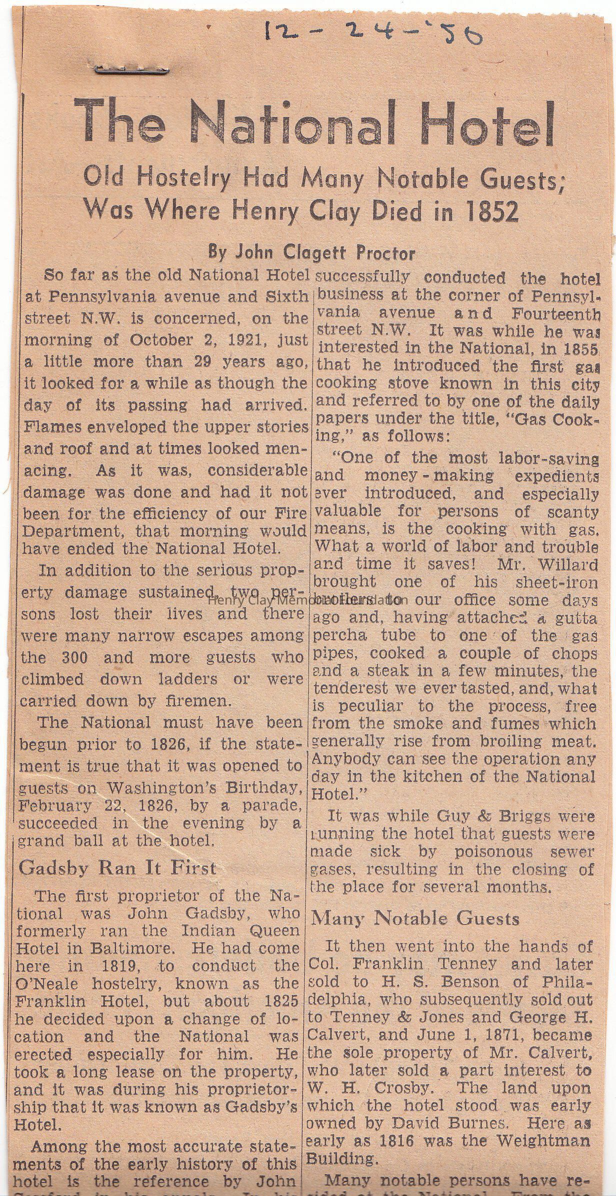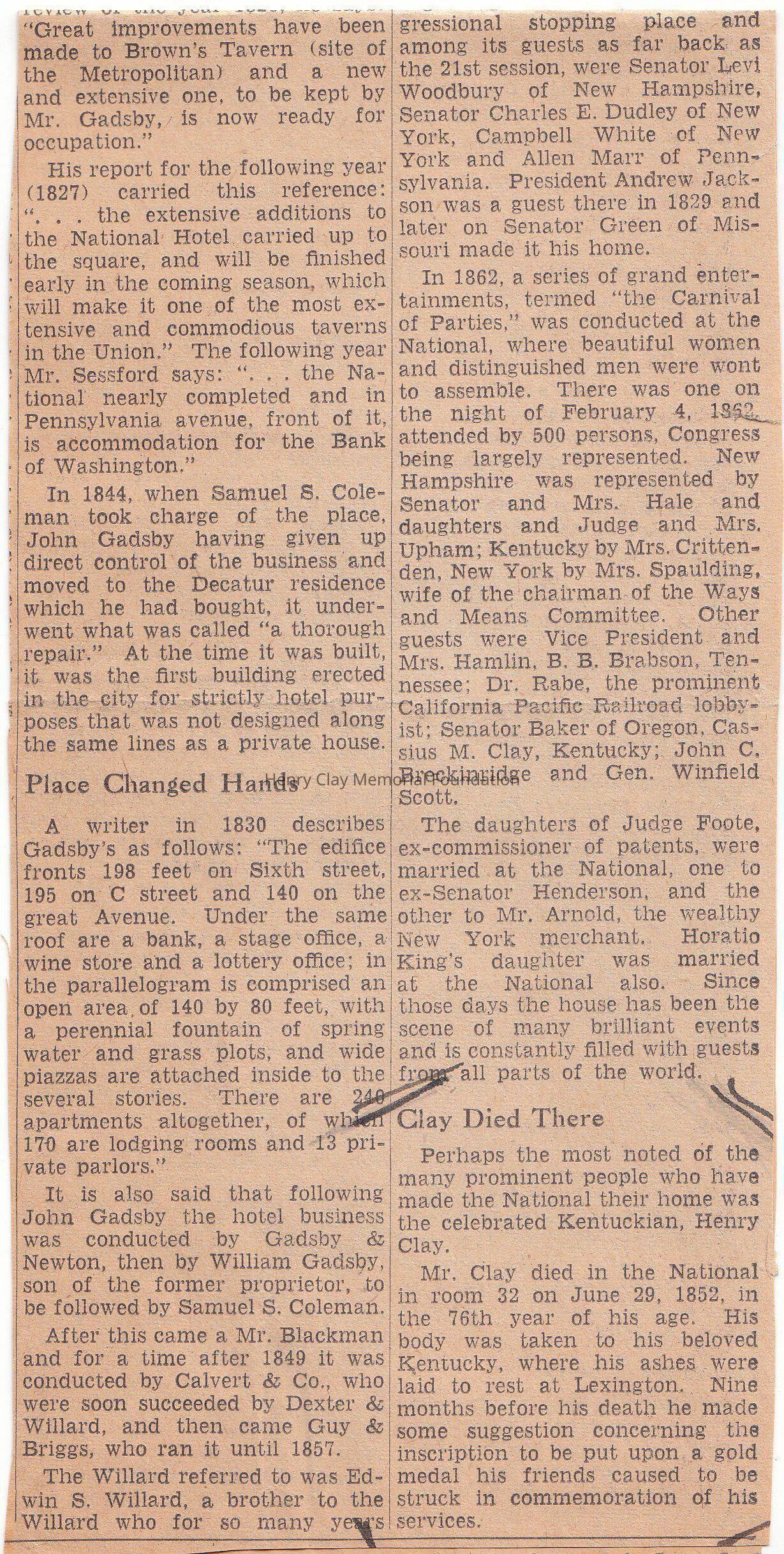 A long clipping about The National Hotel, Pennsylvania, many famous guests, but most likely one of the most important guests was Henry Clay, also the same hotel where Mr. Clay died in the room No. 32 on June 29, 1852 at age 76.