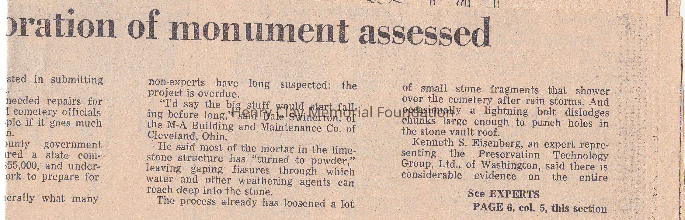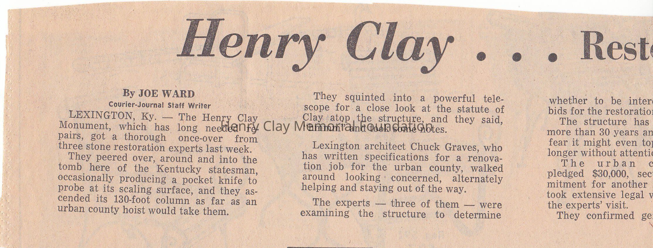 Clipping about the restoration of the monument of Henry Clay.