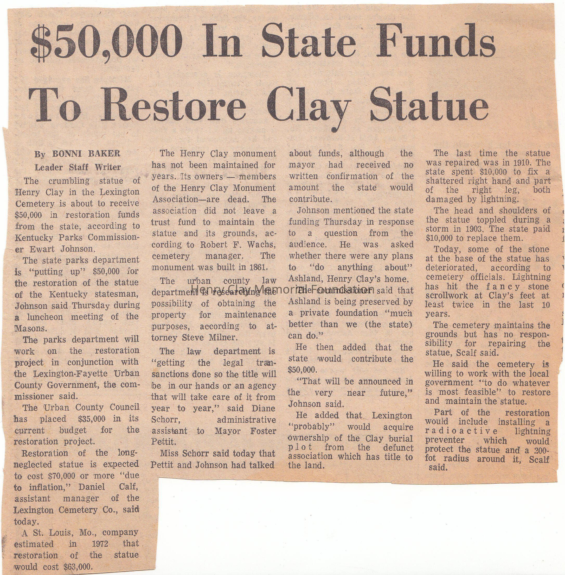 Two of the same clipping regarding a donation of $ 50000 from the State of Kentucky to restore Clay Statue. A St. Louis. Mo, company estimated in 1972 the cost of restoration to $63000. Due to inflation the cost went up to 70000