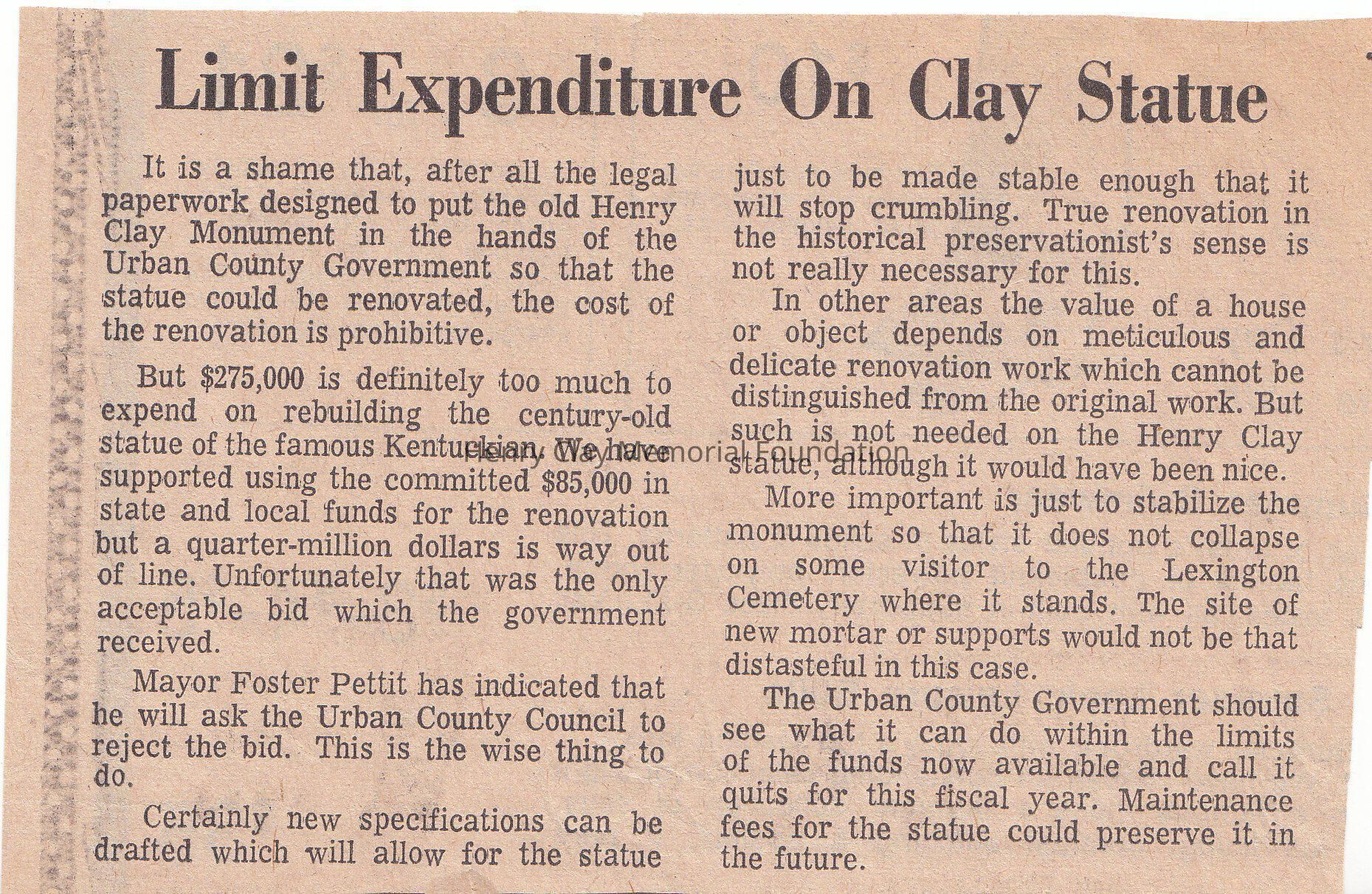 A clipping about the prohibitive cost of restoration for the statue of Henry Clay at the Lexington, Cemetery.