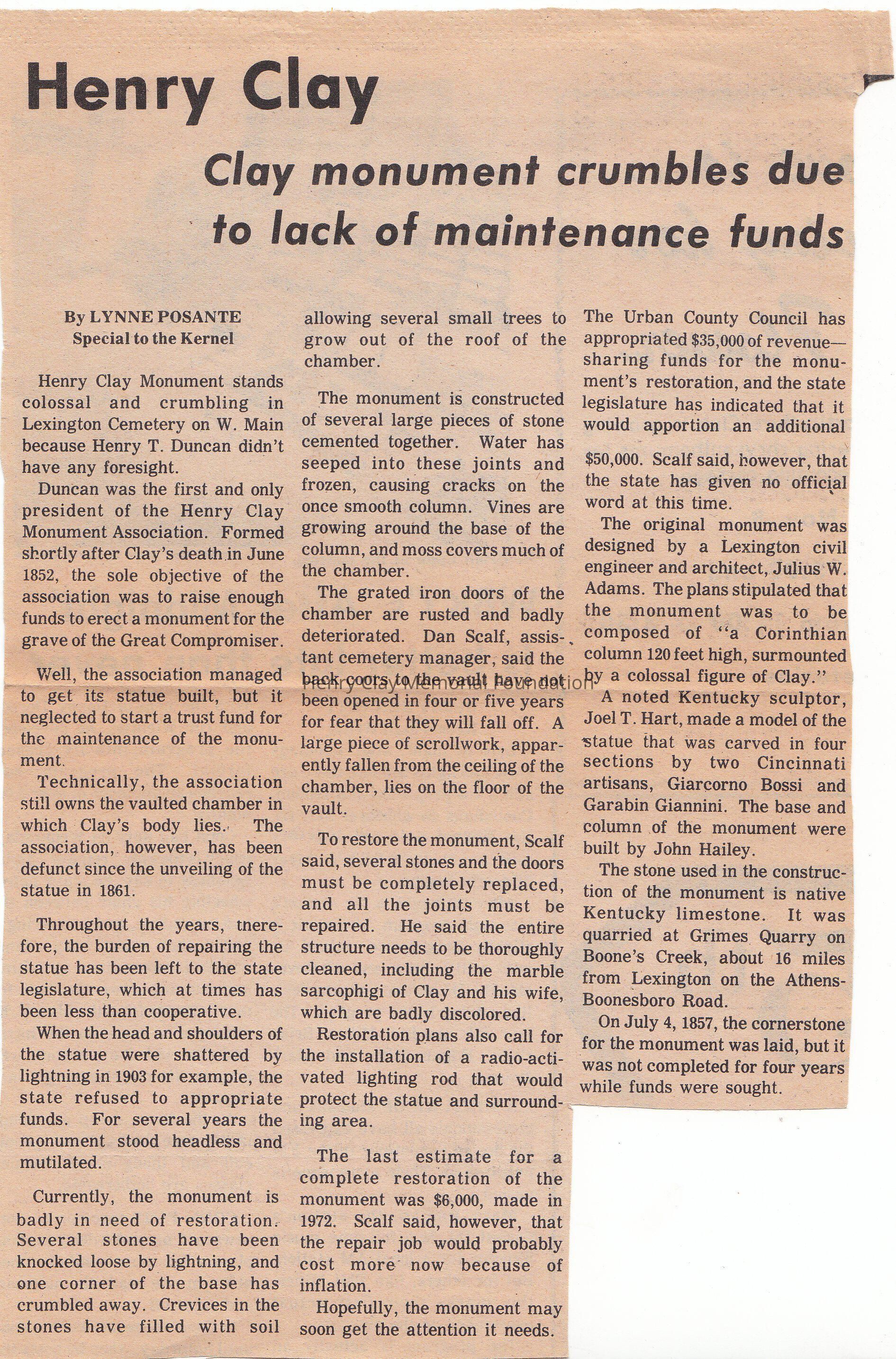 An article about the lack of maintenance funds for the Henry Clay memorial, which cause the monument to crumbles.