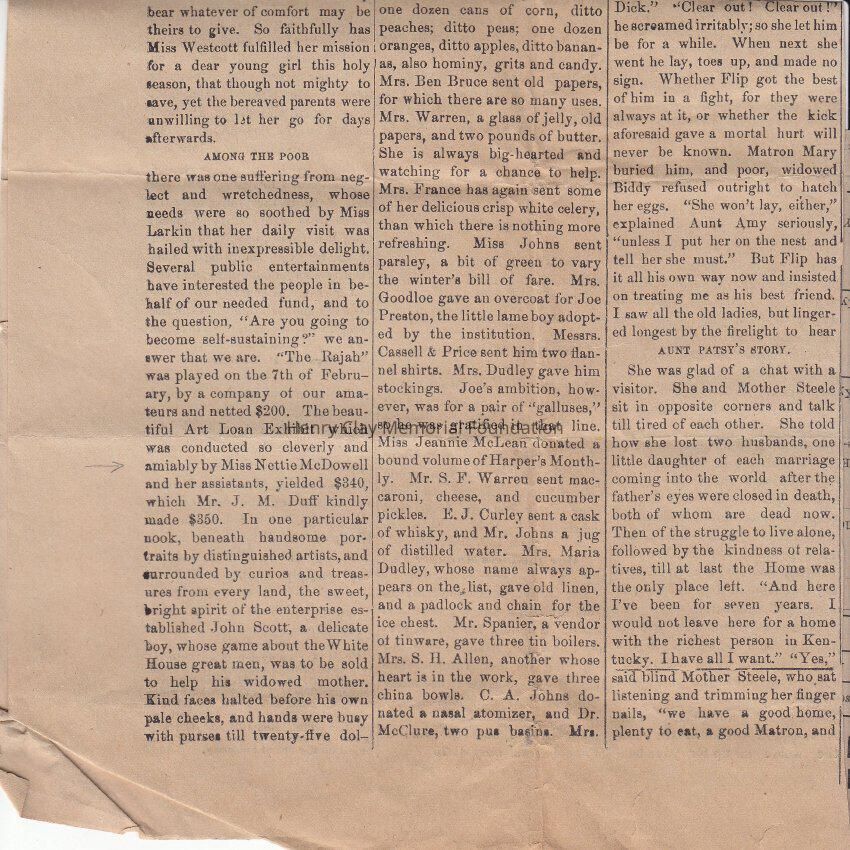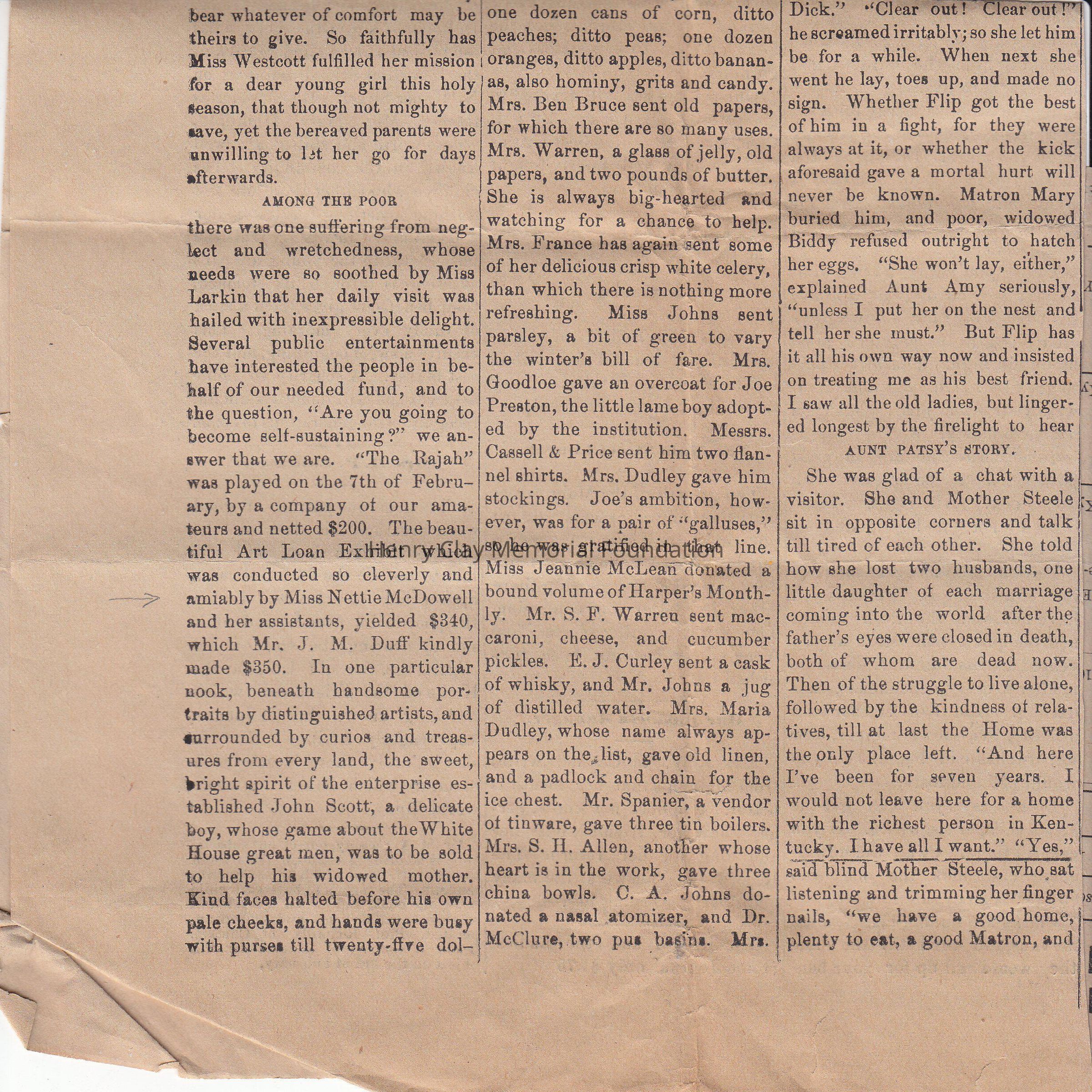 A clipping from the Lexington record, march 1891, lexington Ky. A small article regarding Mary Cecil Gratz, one of the founder of the Orphans Home. In her honor her son established a free kindergarten. In the rear a mention of Nettie McDowell which with her assistant yielded $340 with an Art Loan Exhbition, which she conducted.