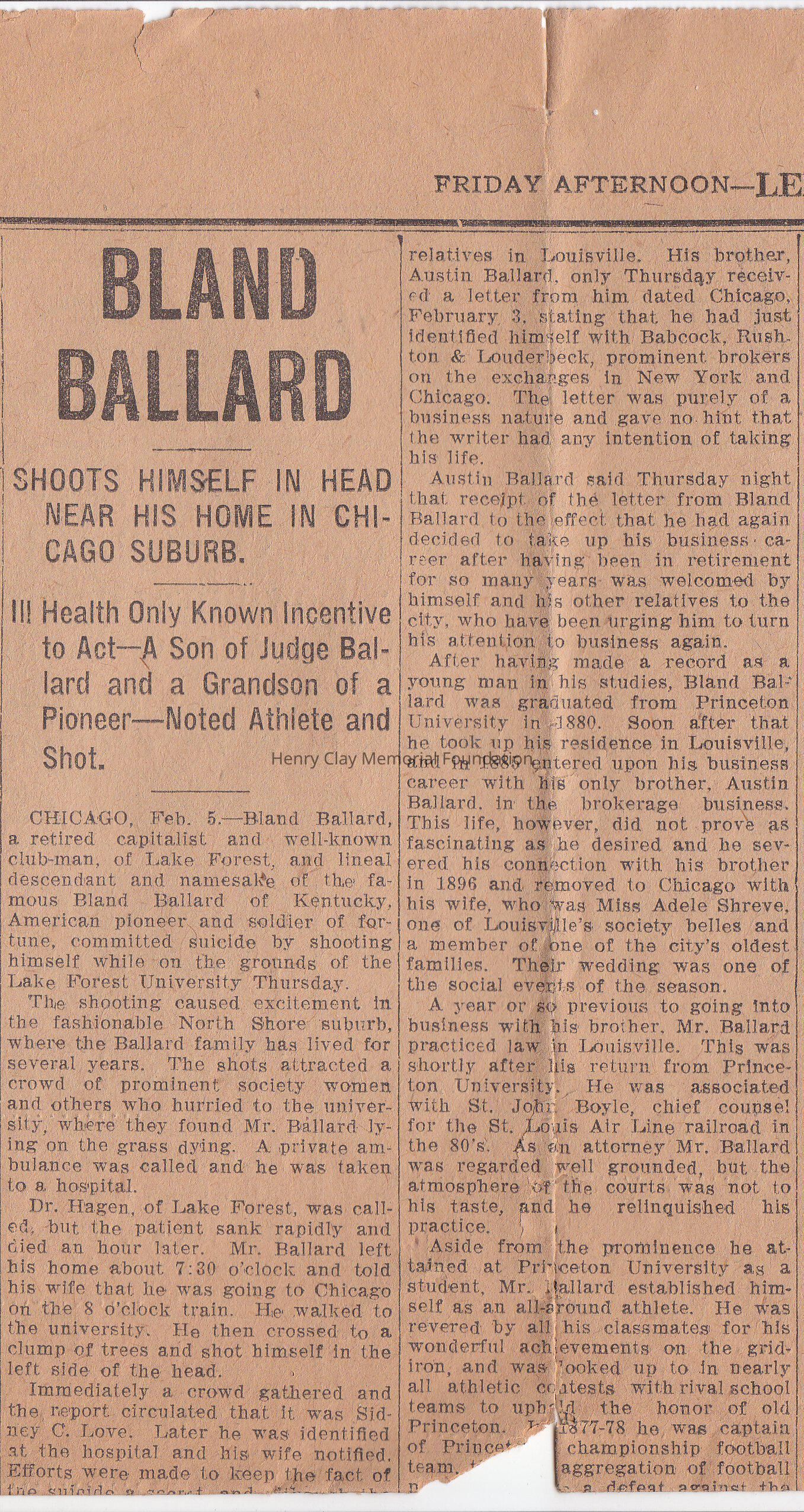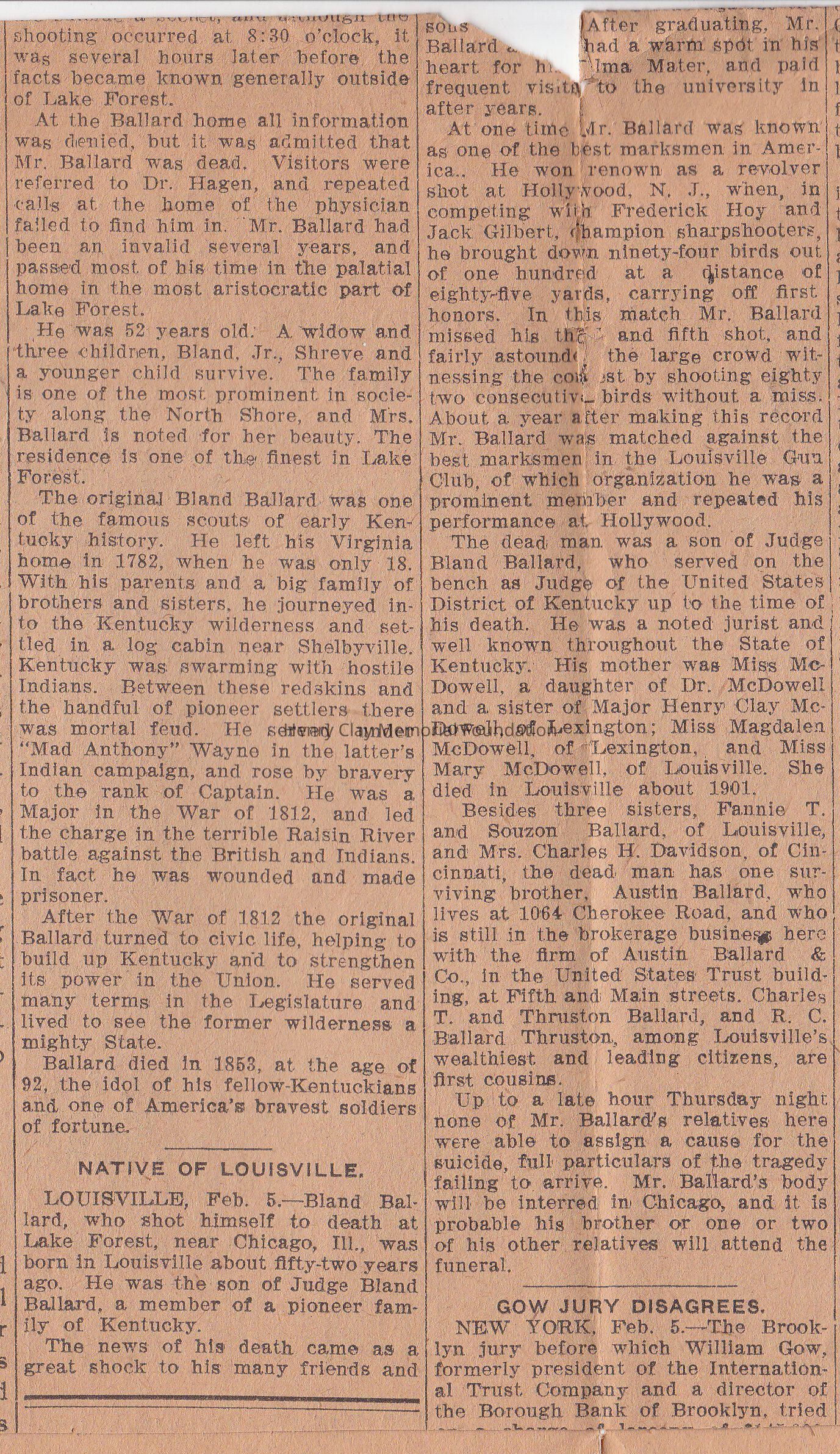 The page of the Newspaper talks about the suicide of Mr. Bland Ballard in 1909, February 5th. He was the son of Miss McDowell, daughter of Dr. McDowell.