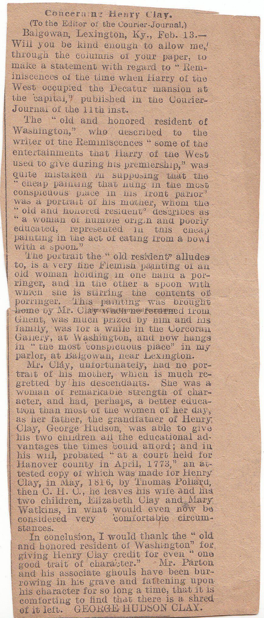 A small clipping in which Henry Clay his reminded by George Hudson Clay.
