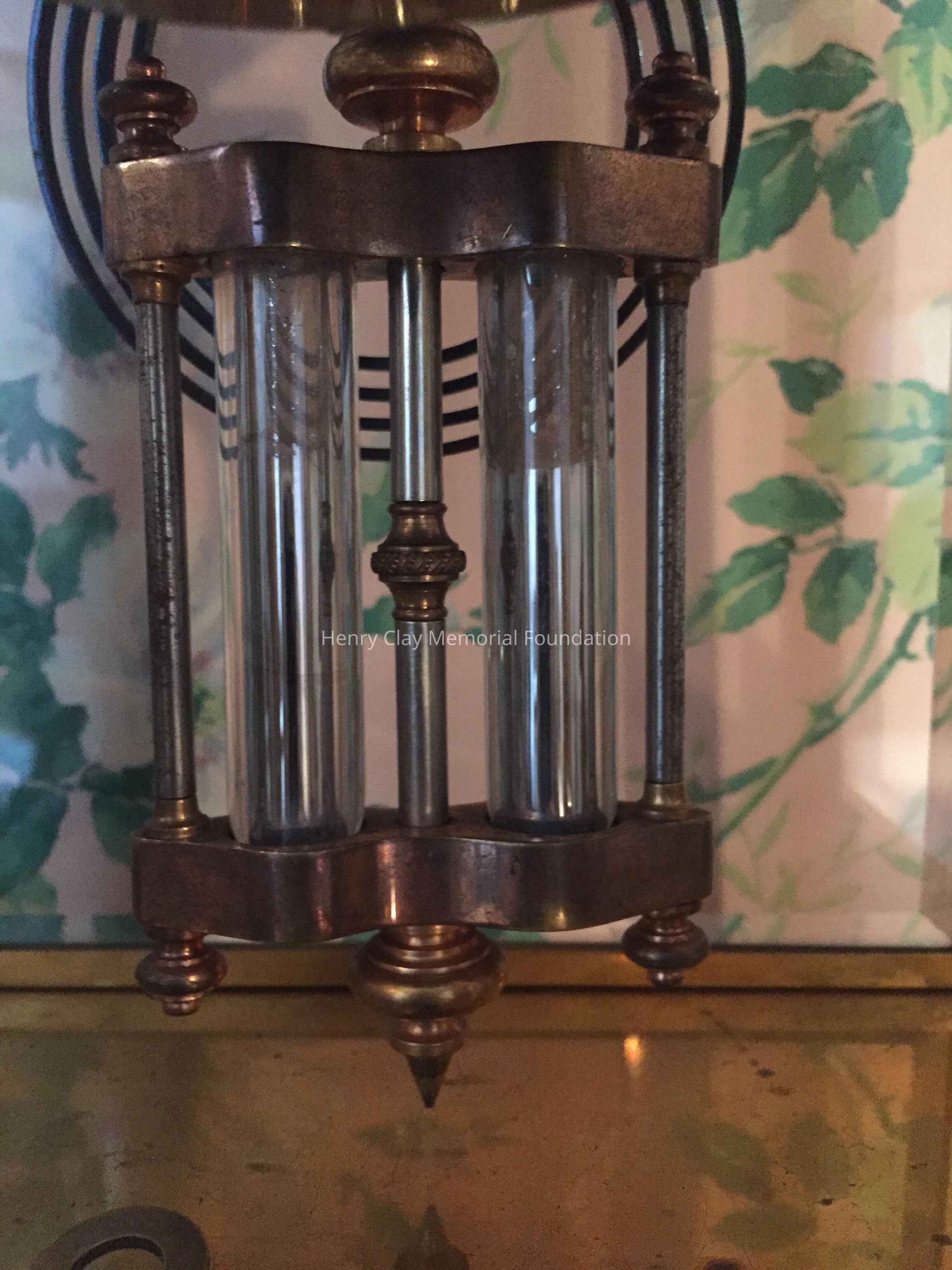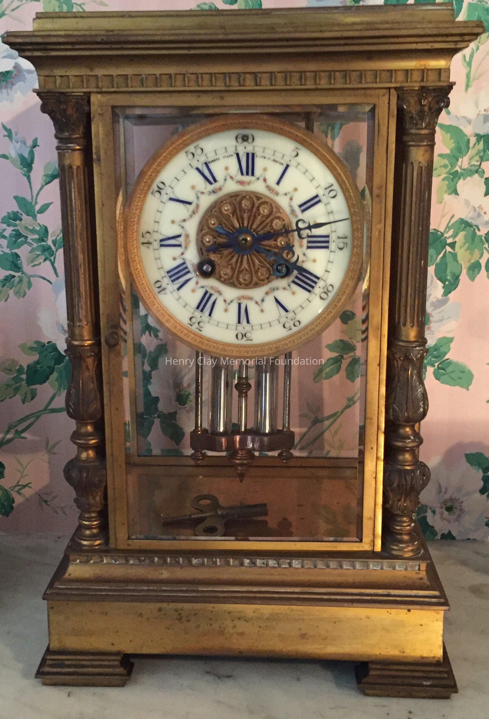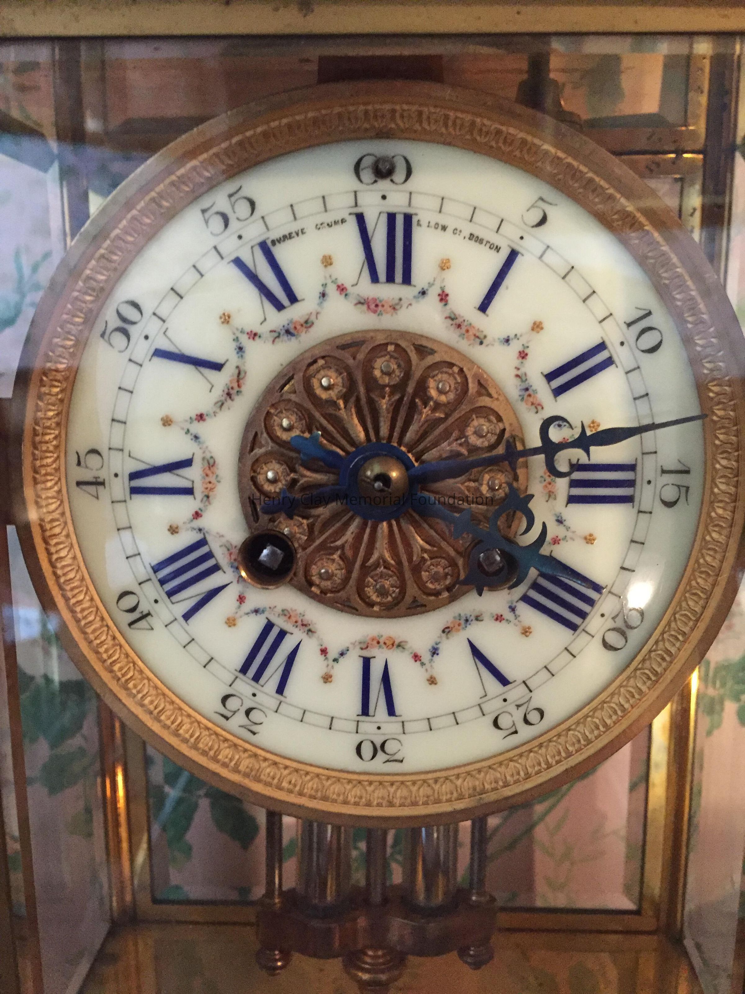 Metal with glass sides and front, porcelain face, mercury pendulum. Shreve & Lowe, Boston.