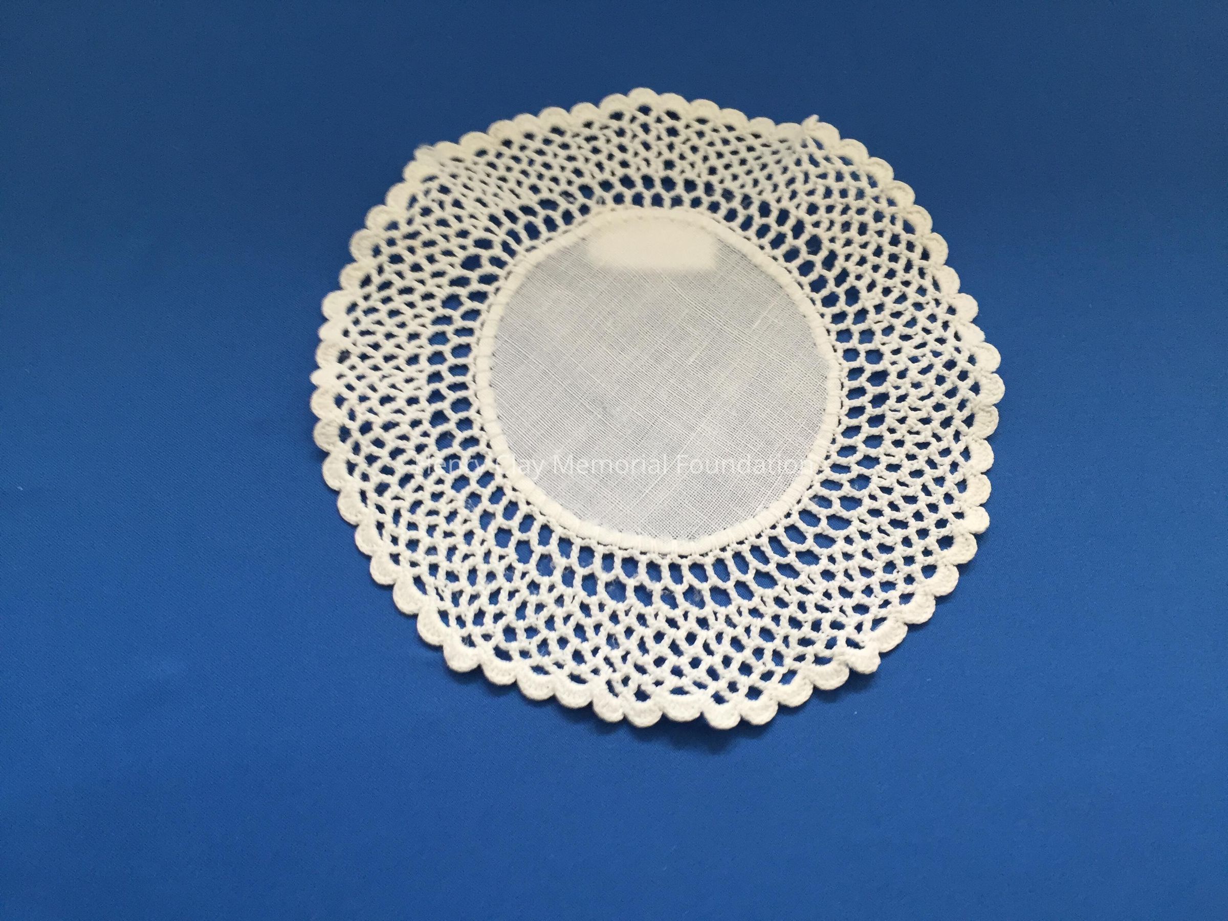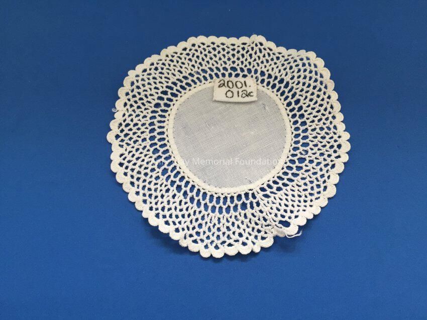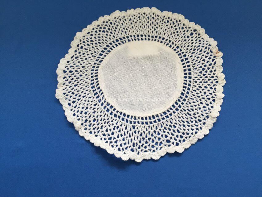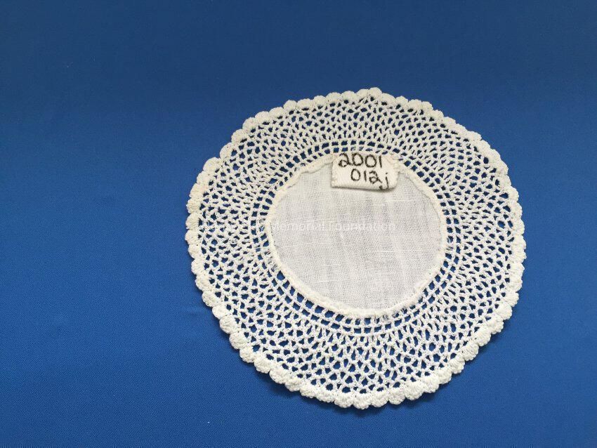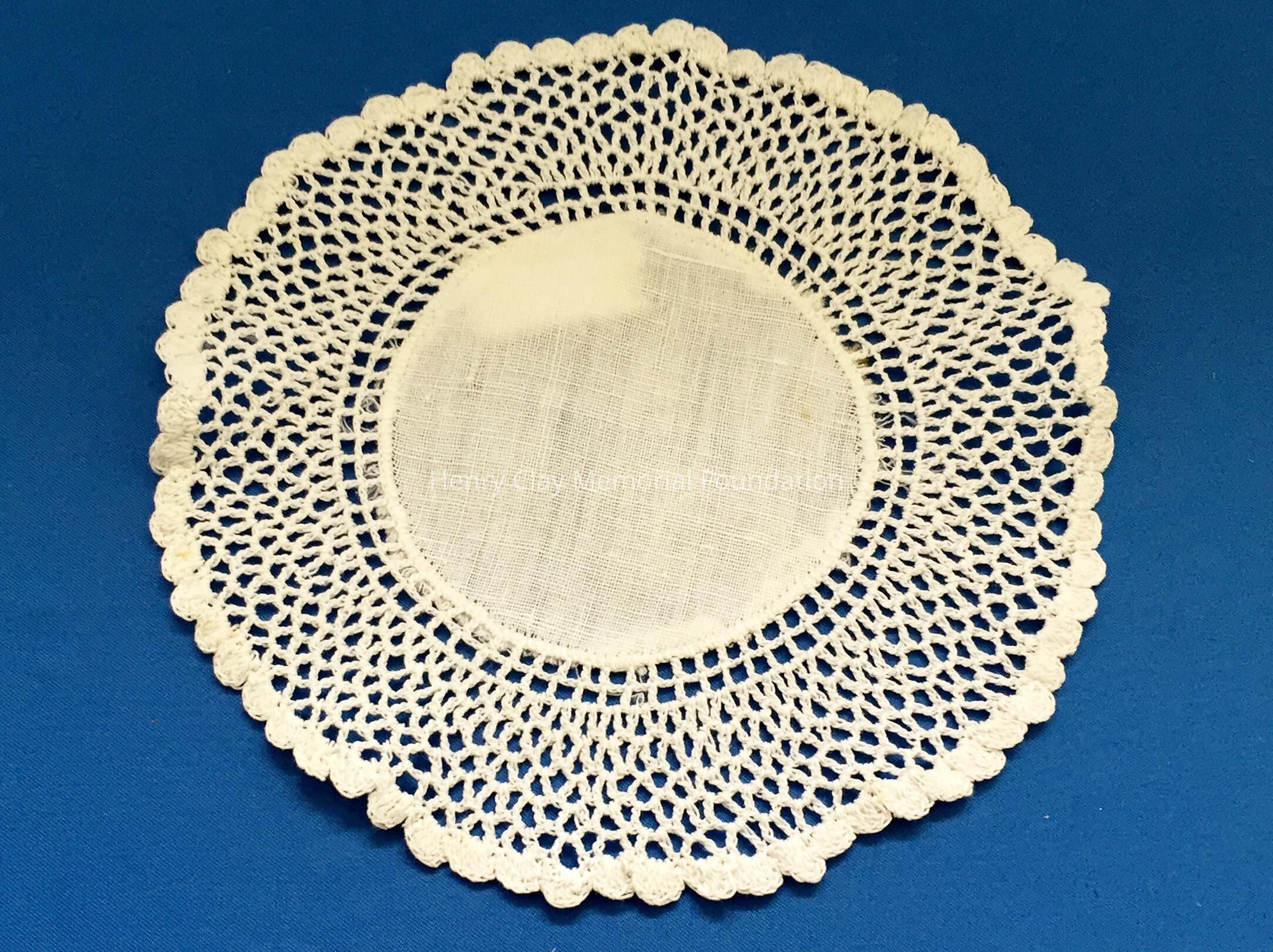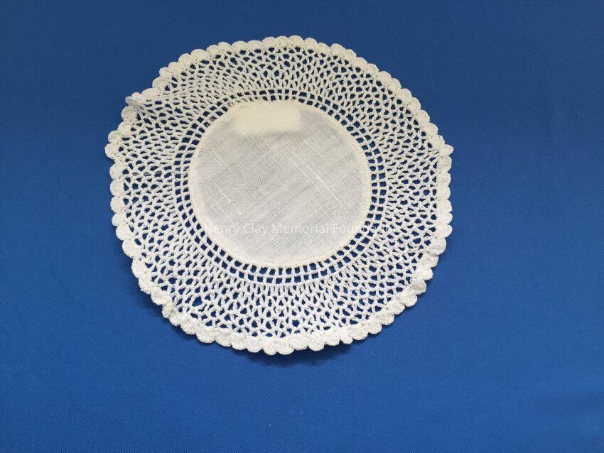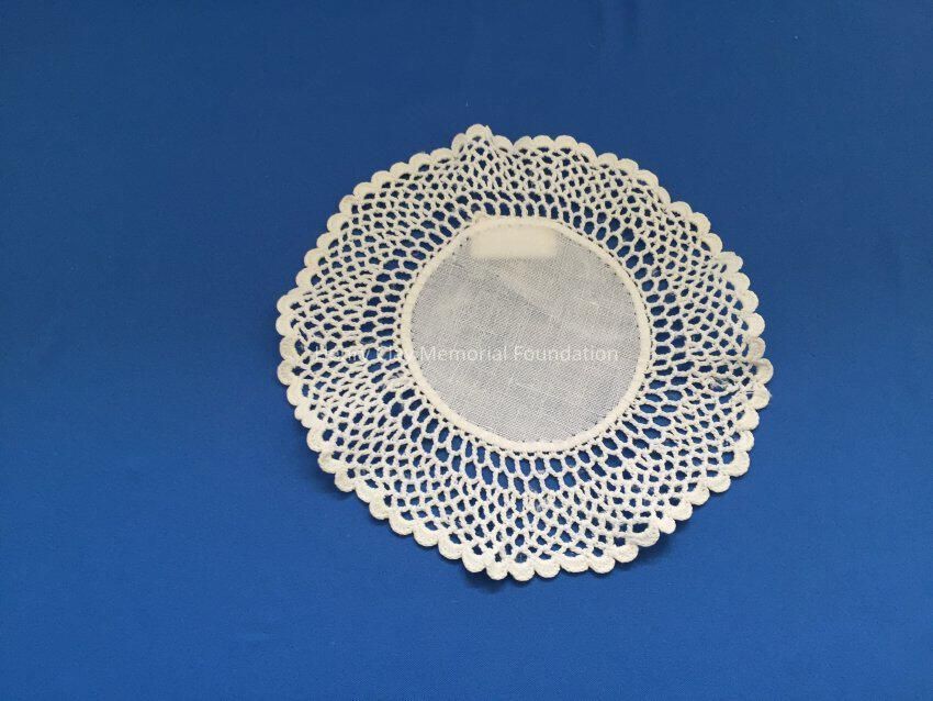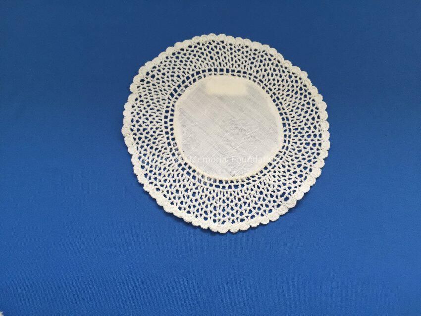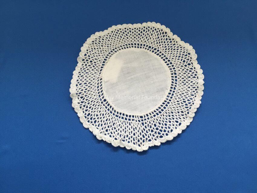These are small, round, off-white doilies. The center piece is linen with looped mesh lace all around. These are likely used to protect furniture from cold and hot drinks.Dimensions