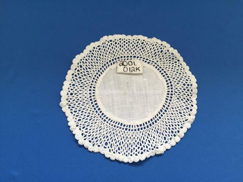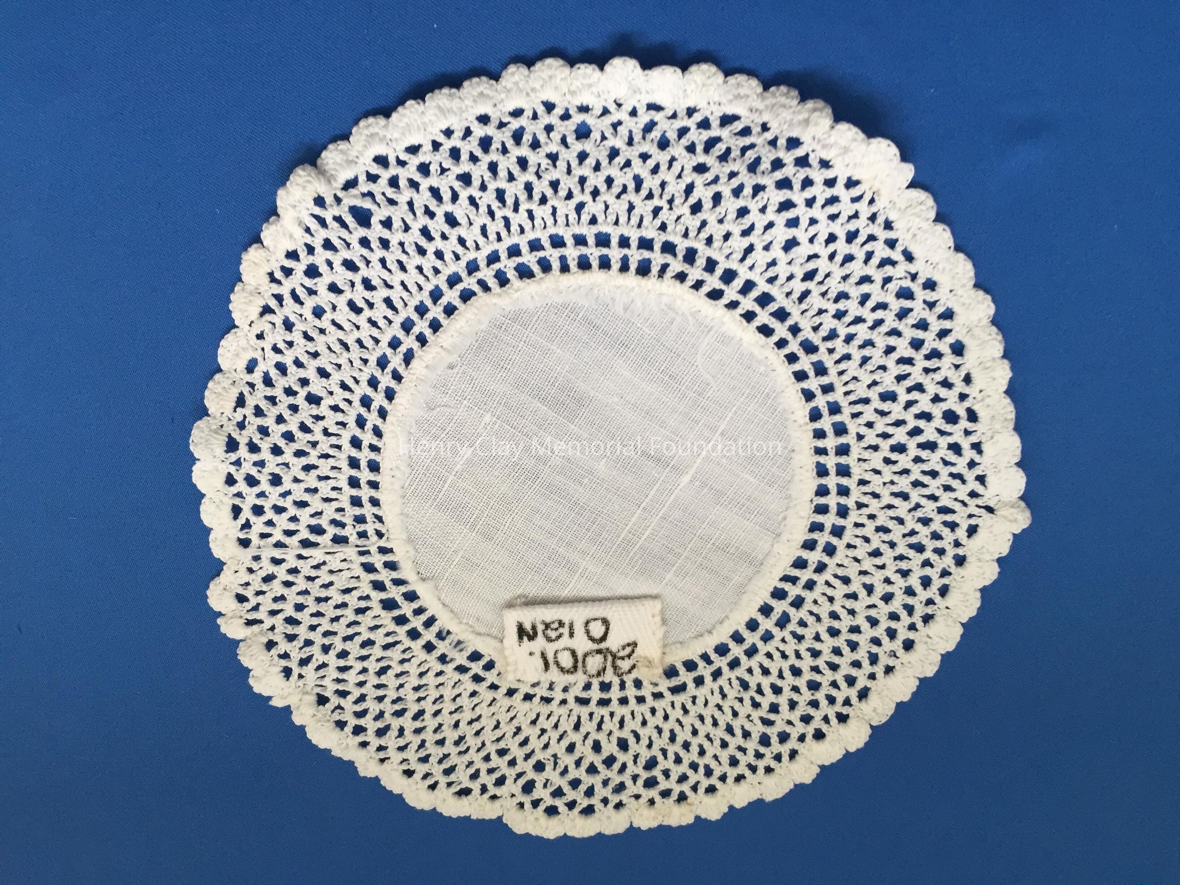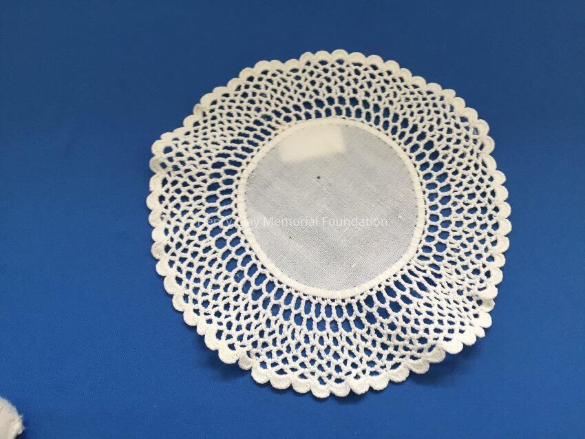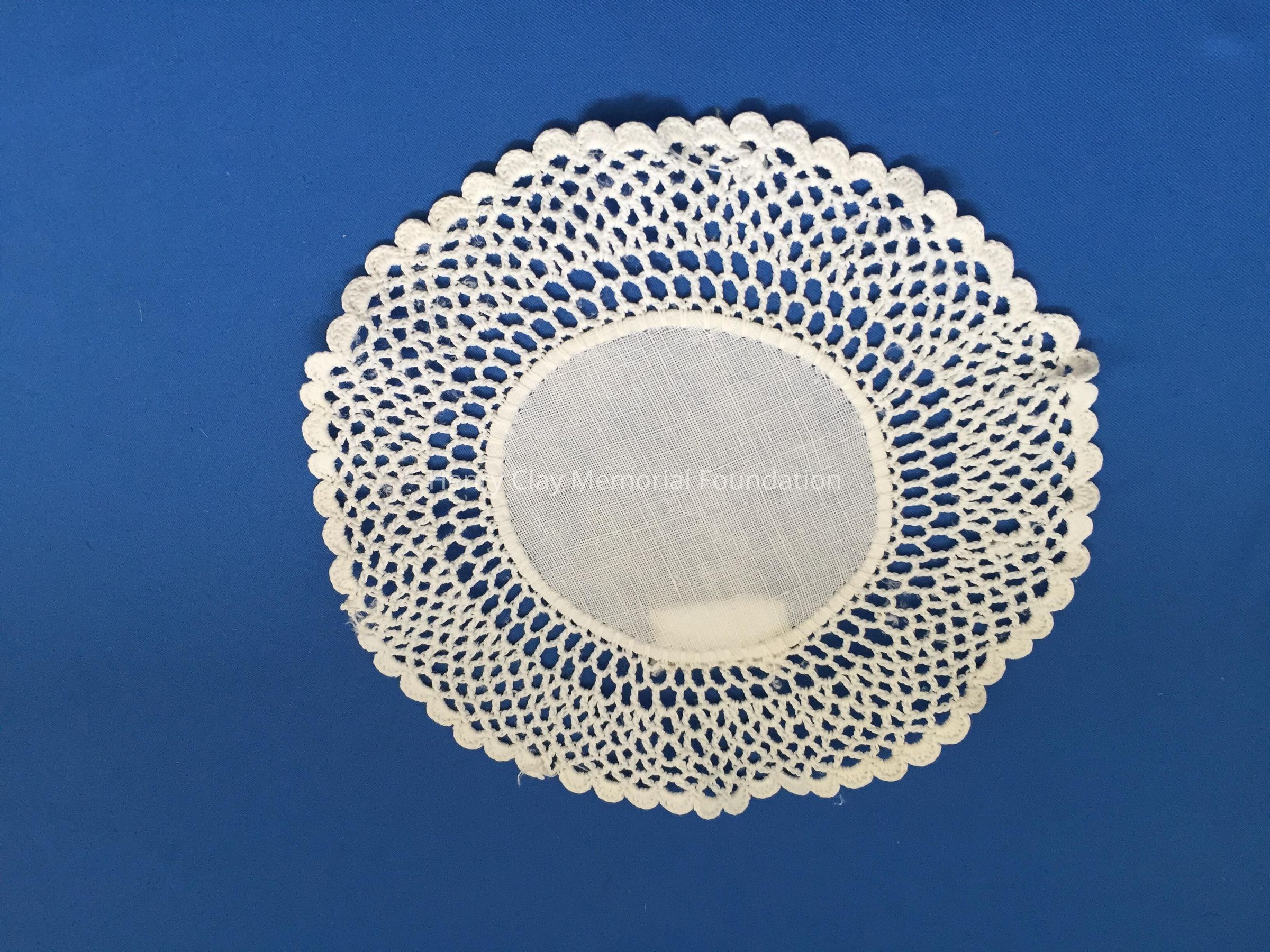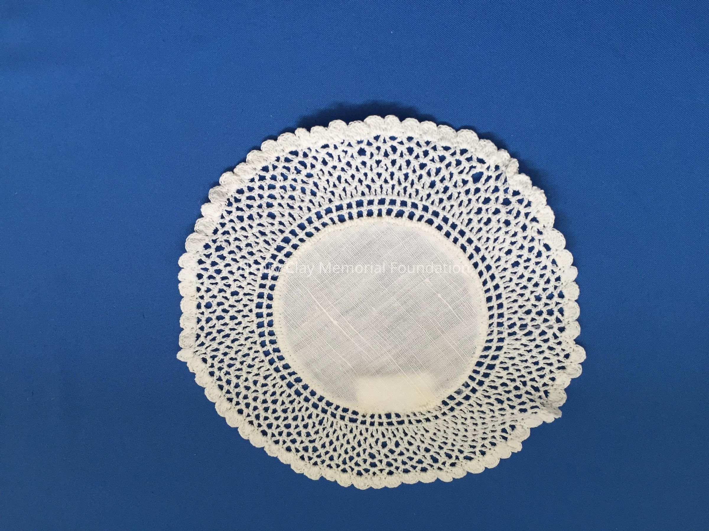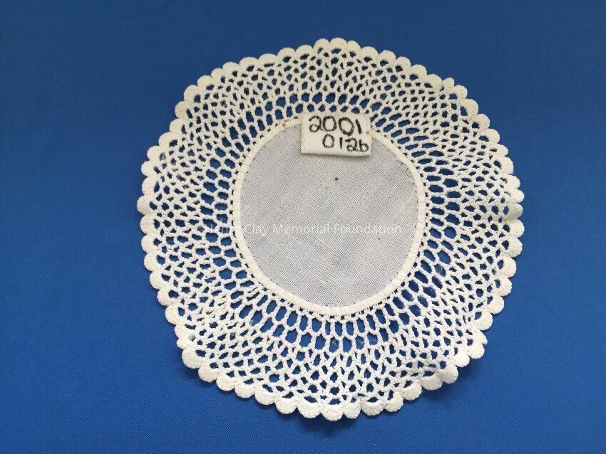 These are small, round, off-white doilies. The center piece is linen with looped mesh lace all around. These are likely used to protect furniture from cold and hot drinks.Dimensions