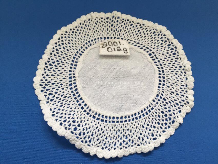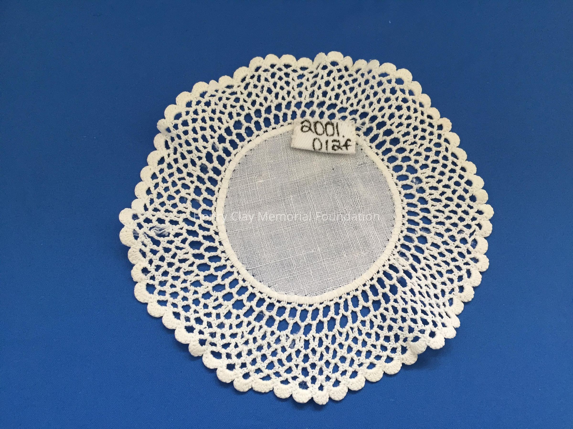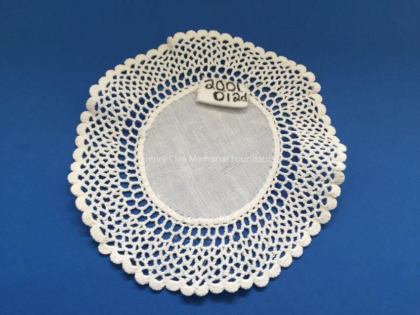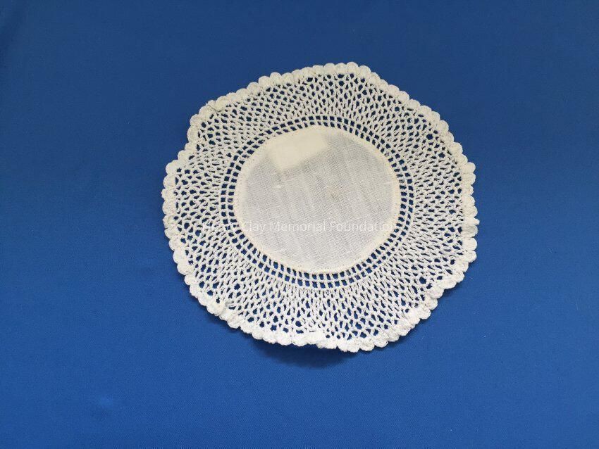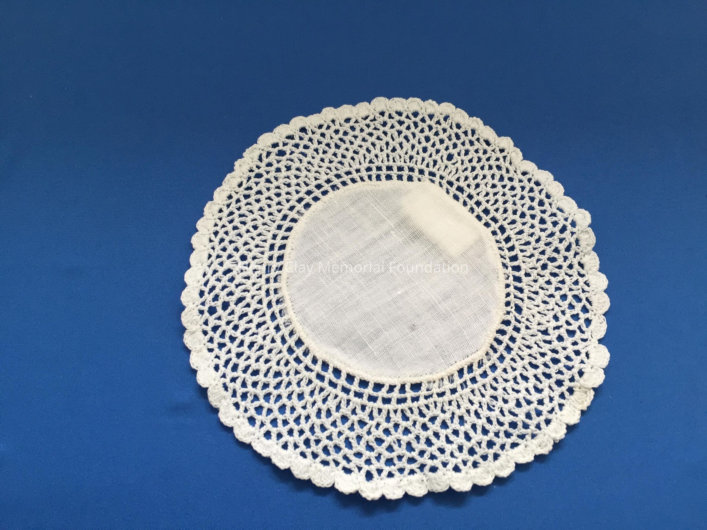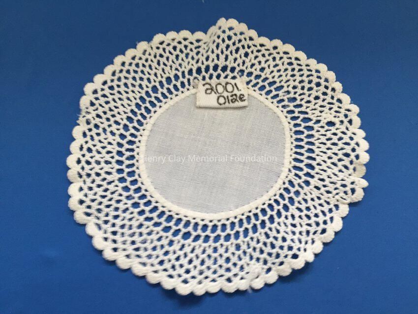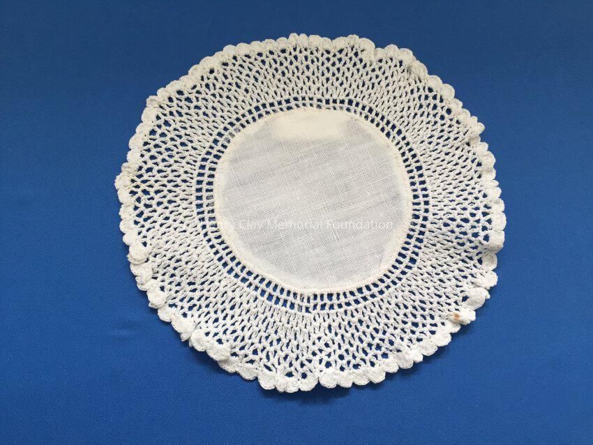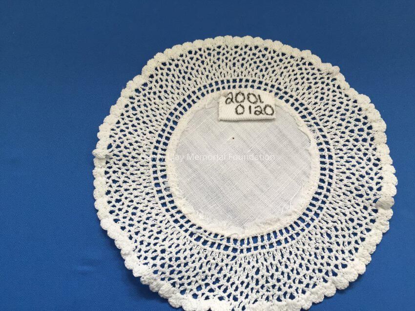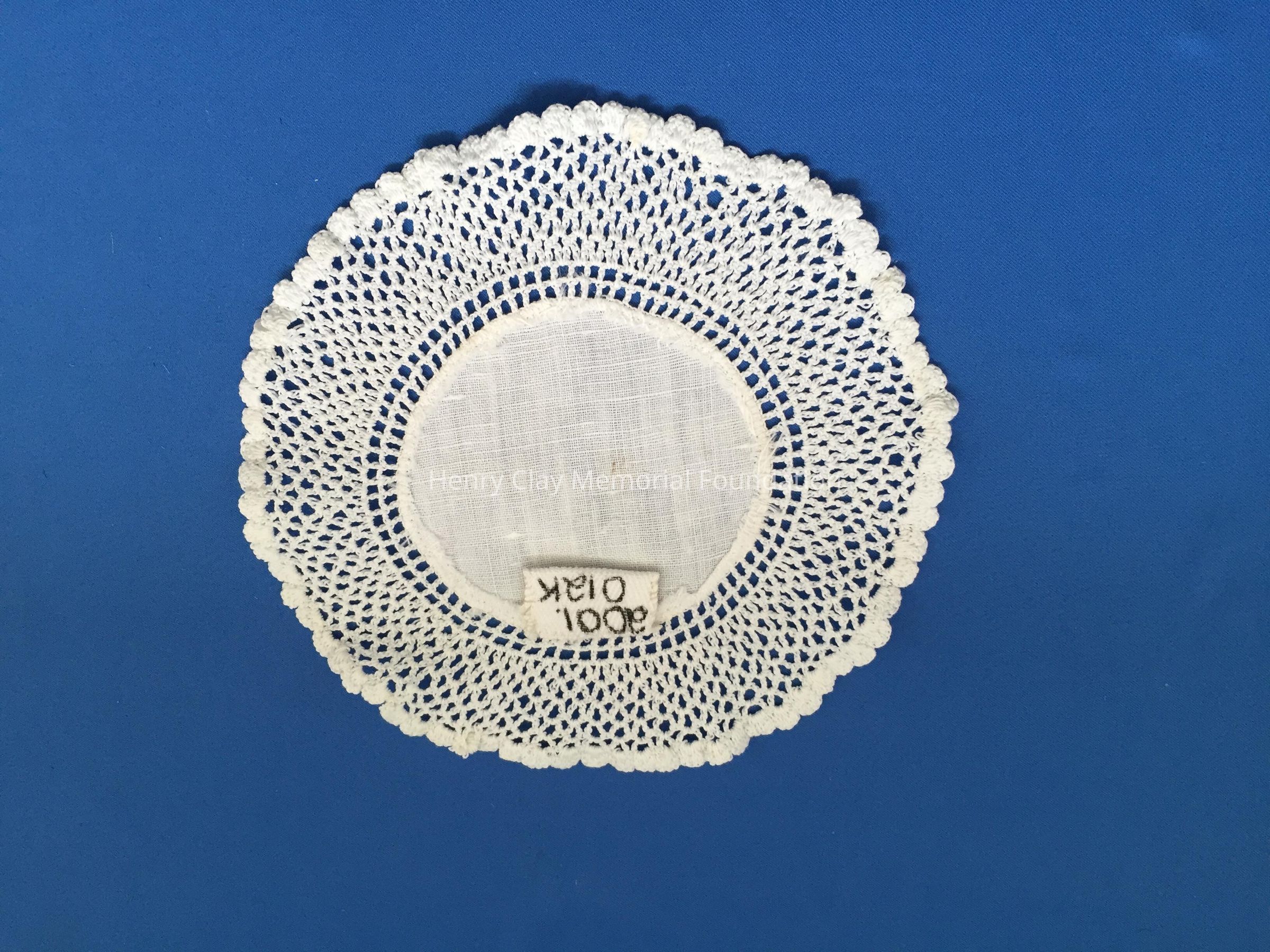 These are small, round, off-white doilies. The center piece is linen with looped mesh lace all around. These are likely used to protect furniture from cold and hot drinks.Dimensions