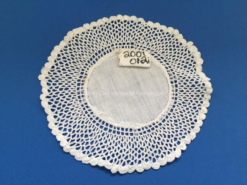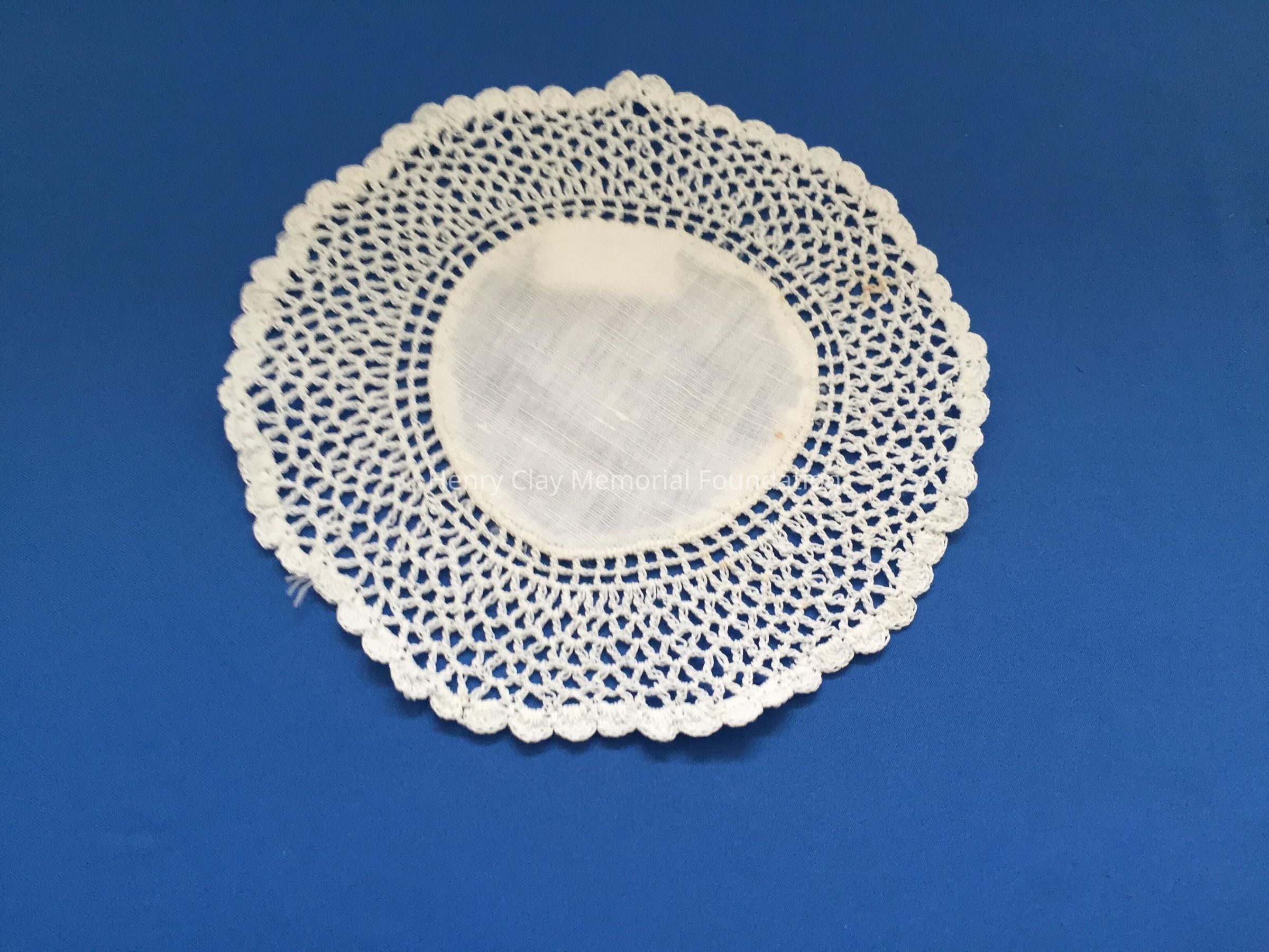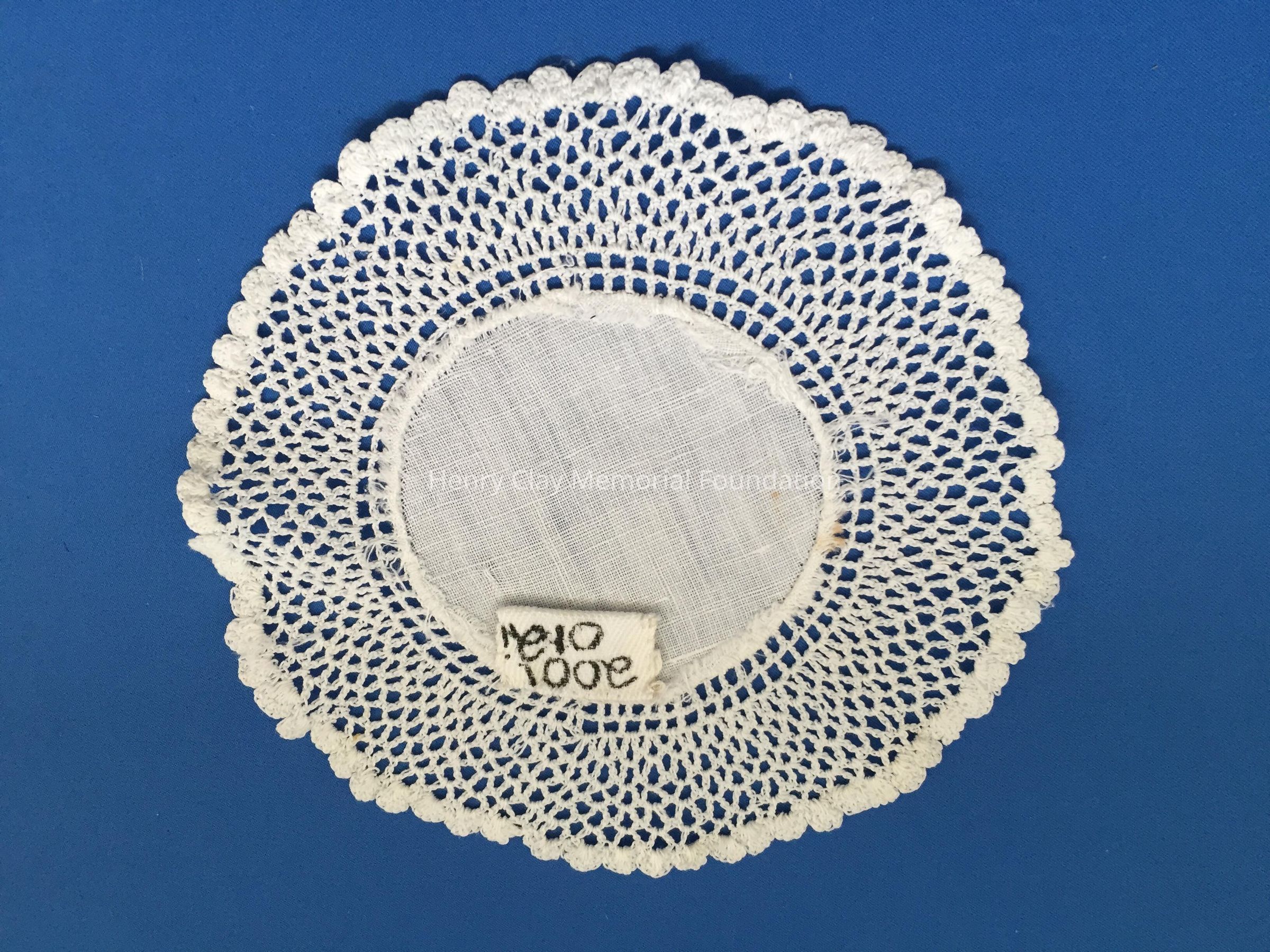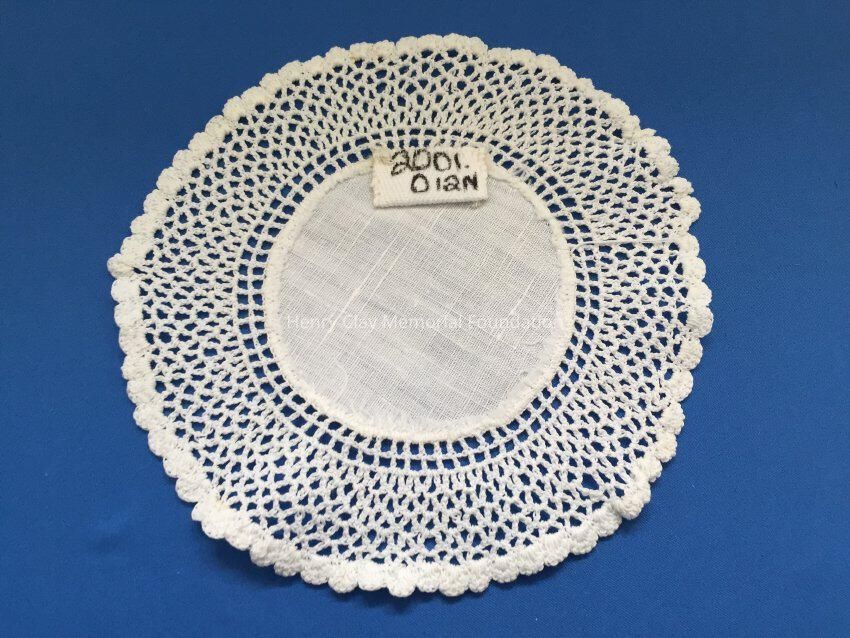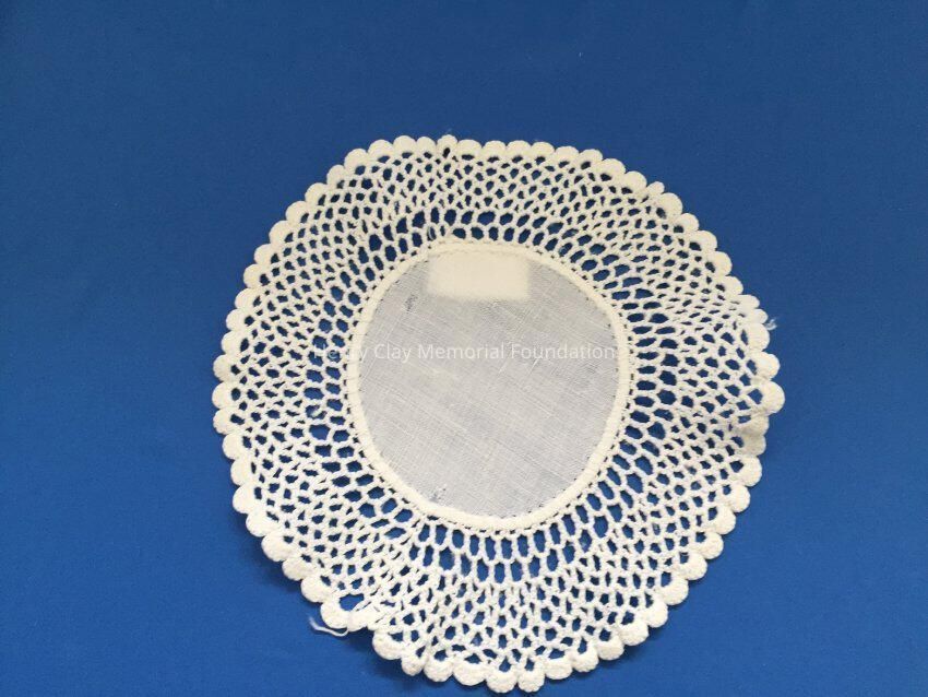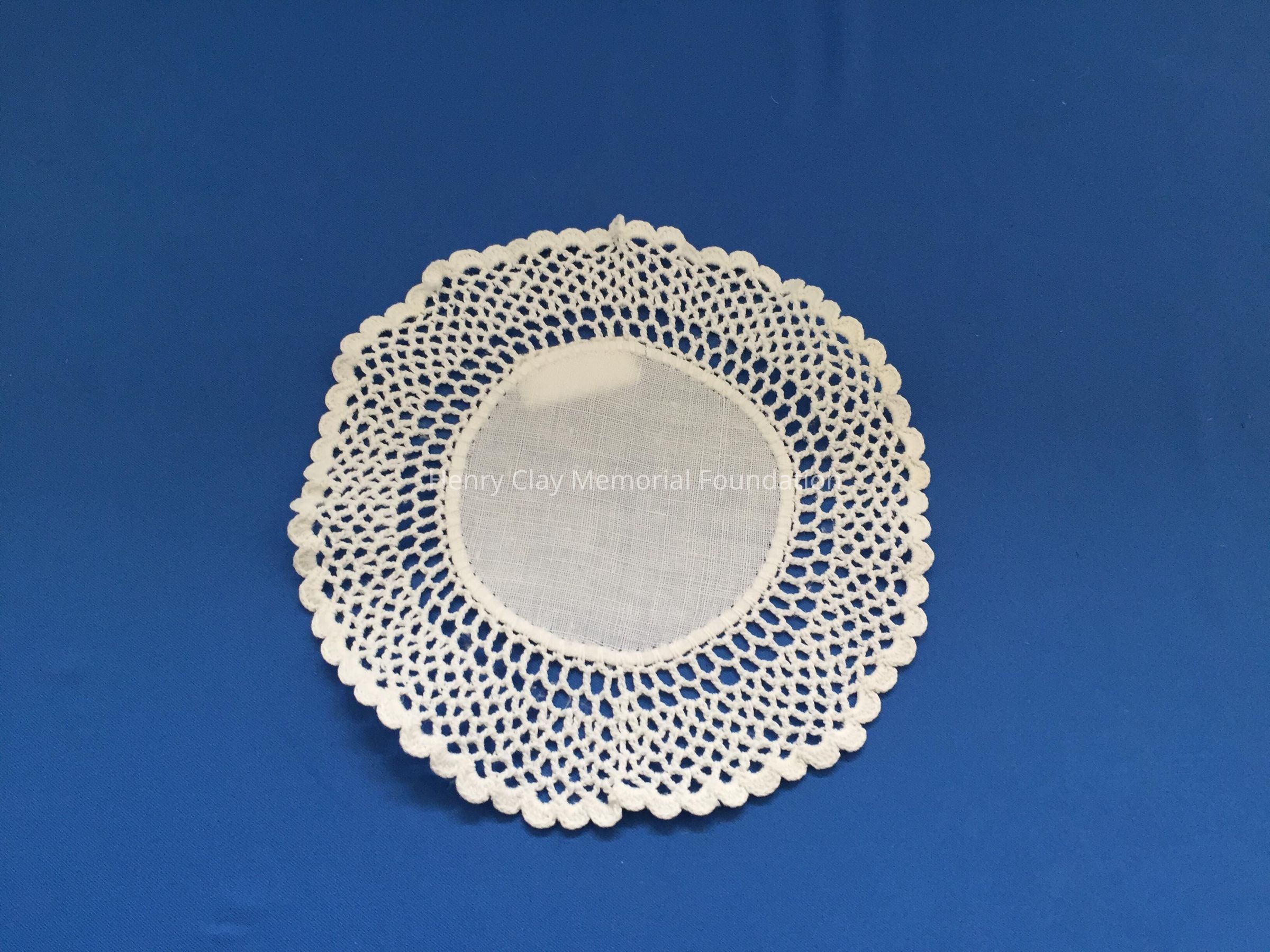These are small, round, off-white doilies. The center piece is linen with looped mesh lace all around. These are likely used to protect furniture from cold and hot drinks.Dimensions