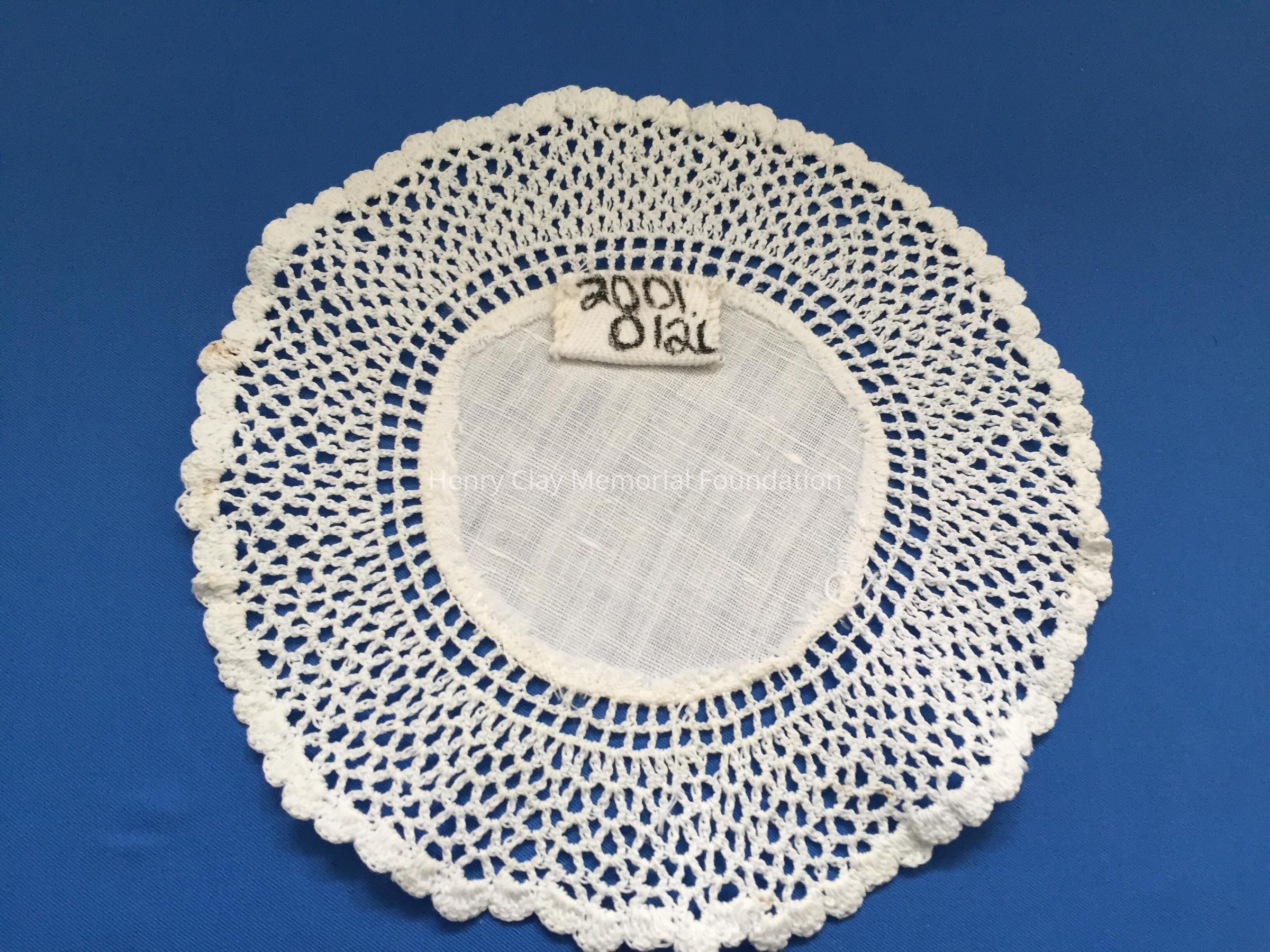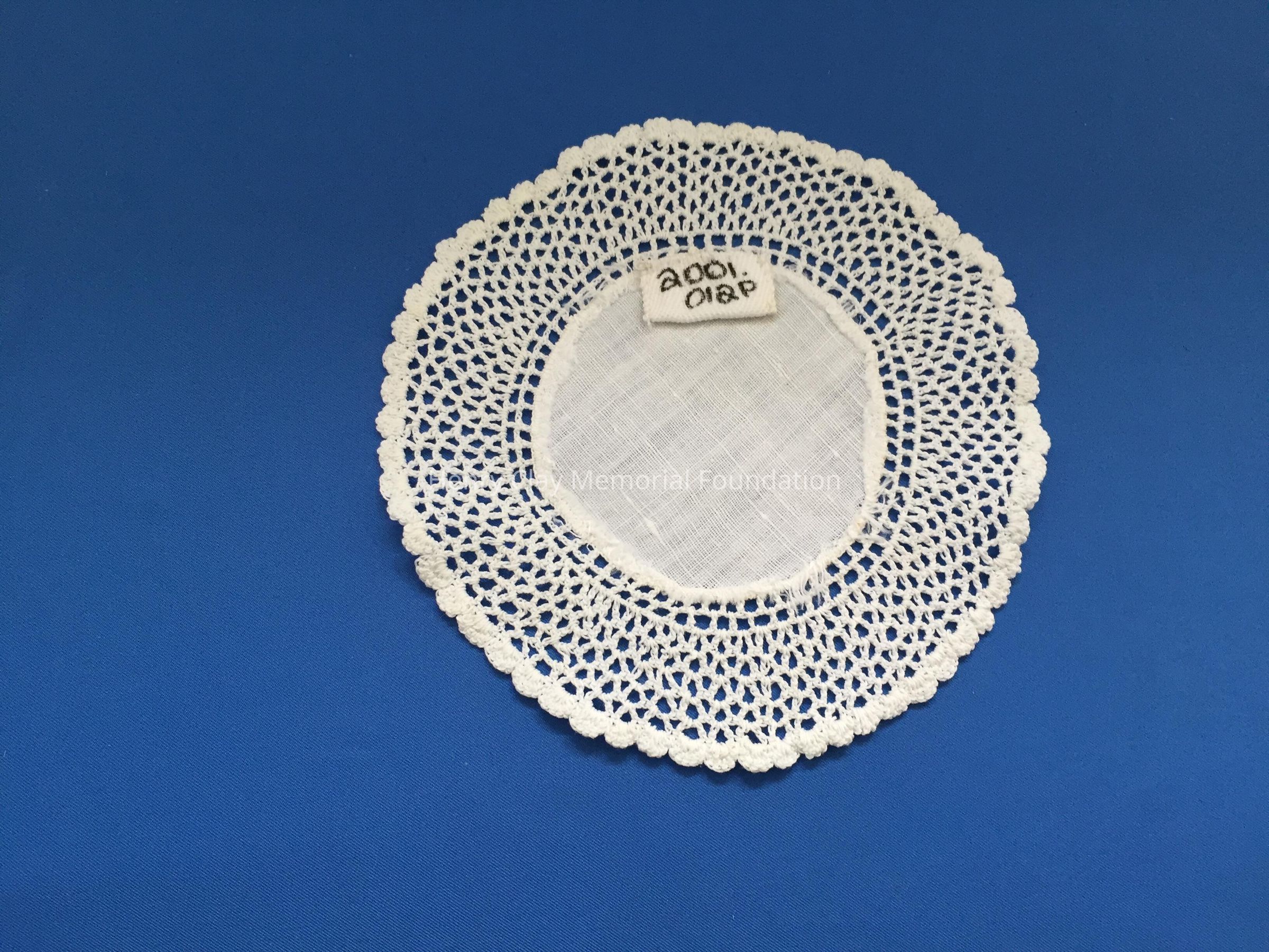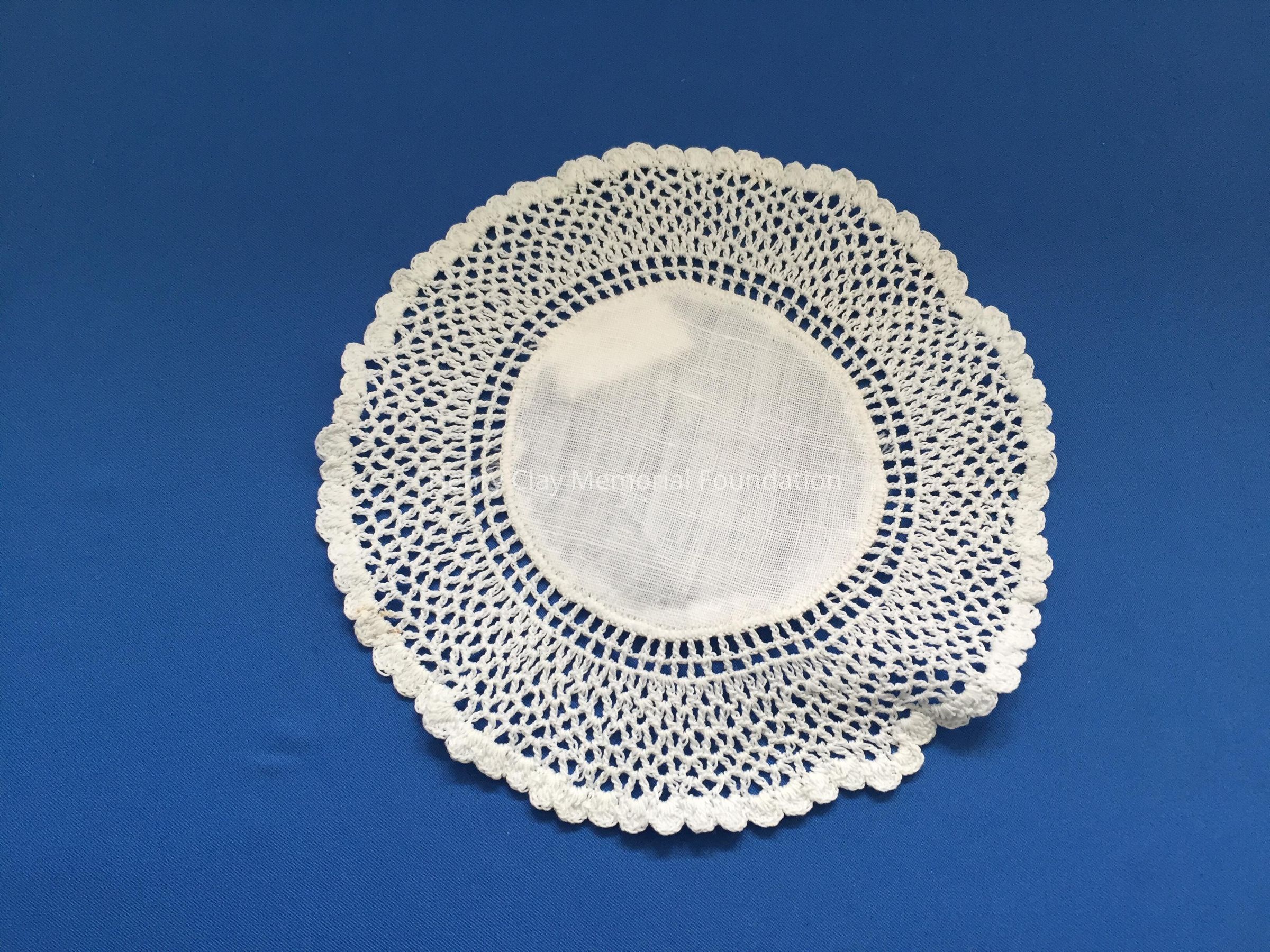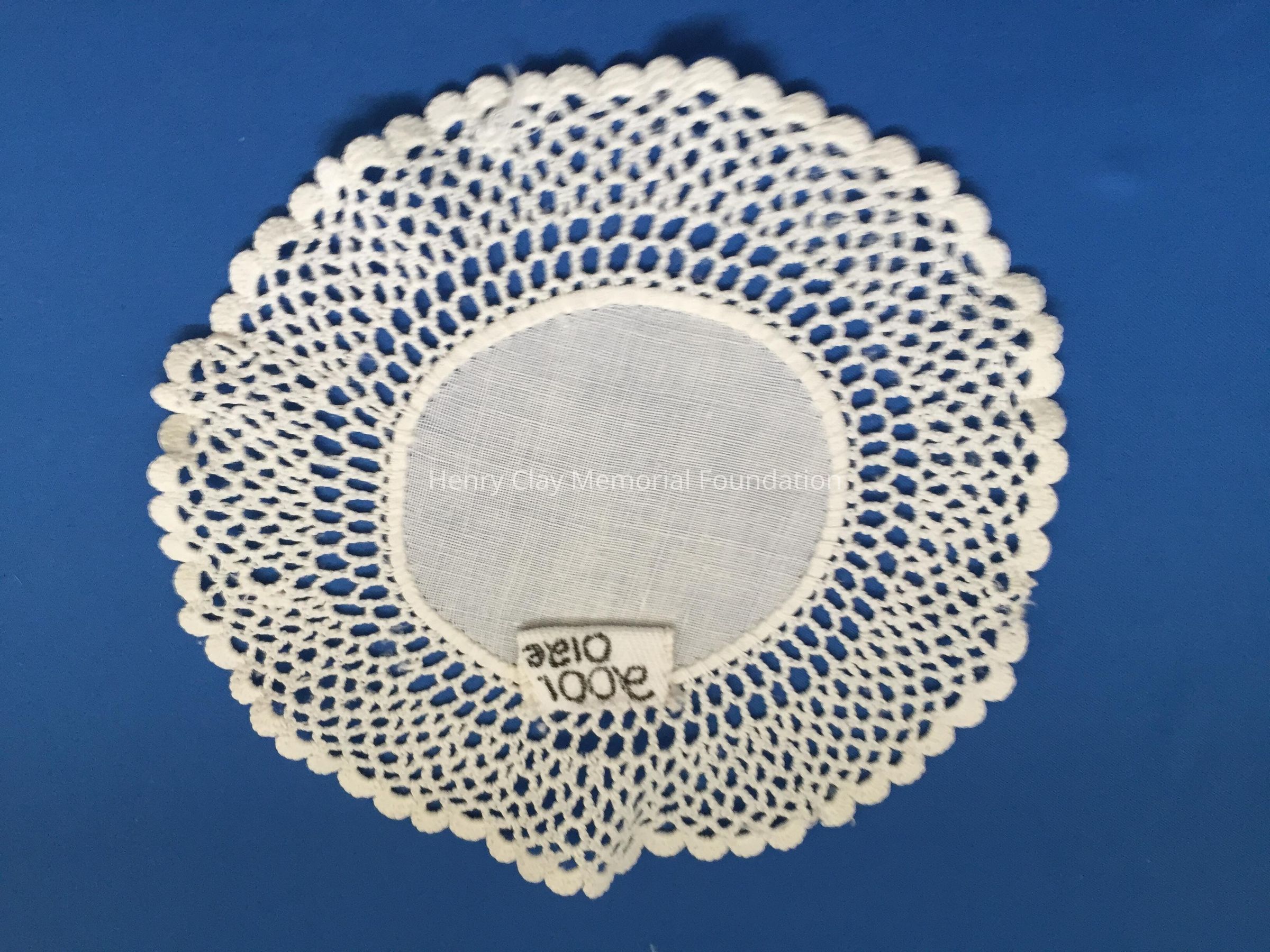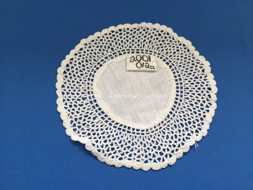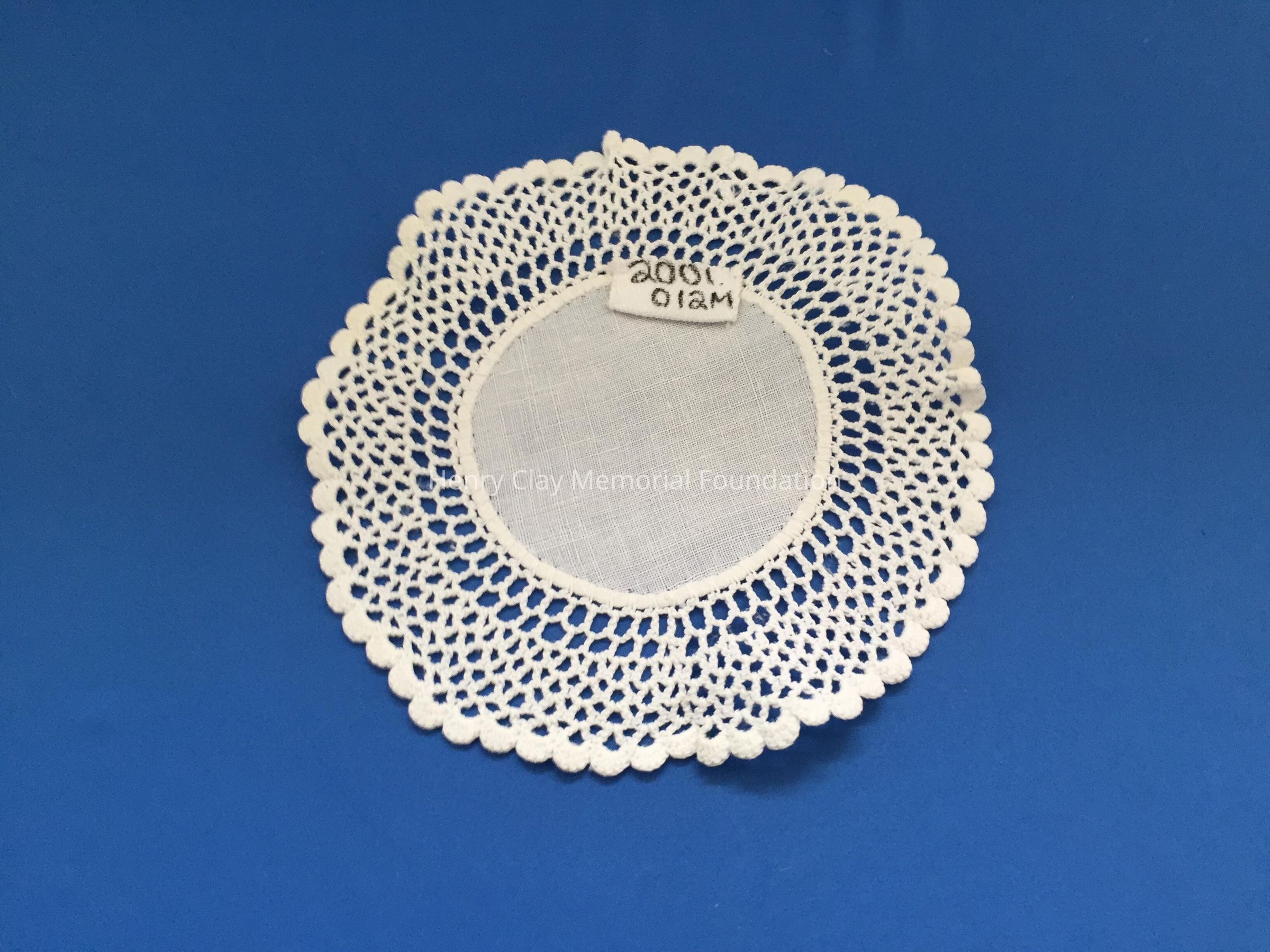 These are small, round, off-white doilies. The center piece is linen with looped mesh lace all around. These are likely used to protect furniture from cold and hot drinks.Dimensions