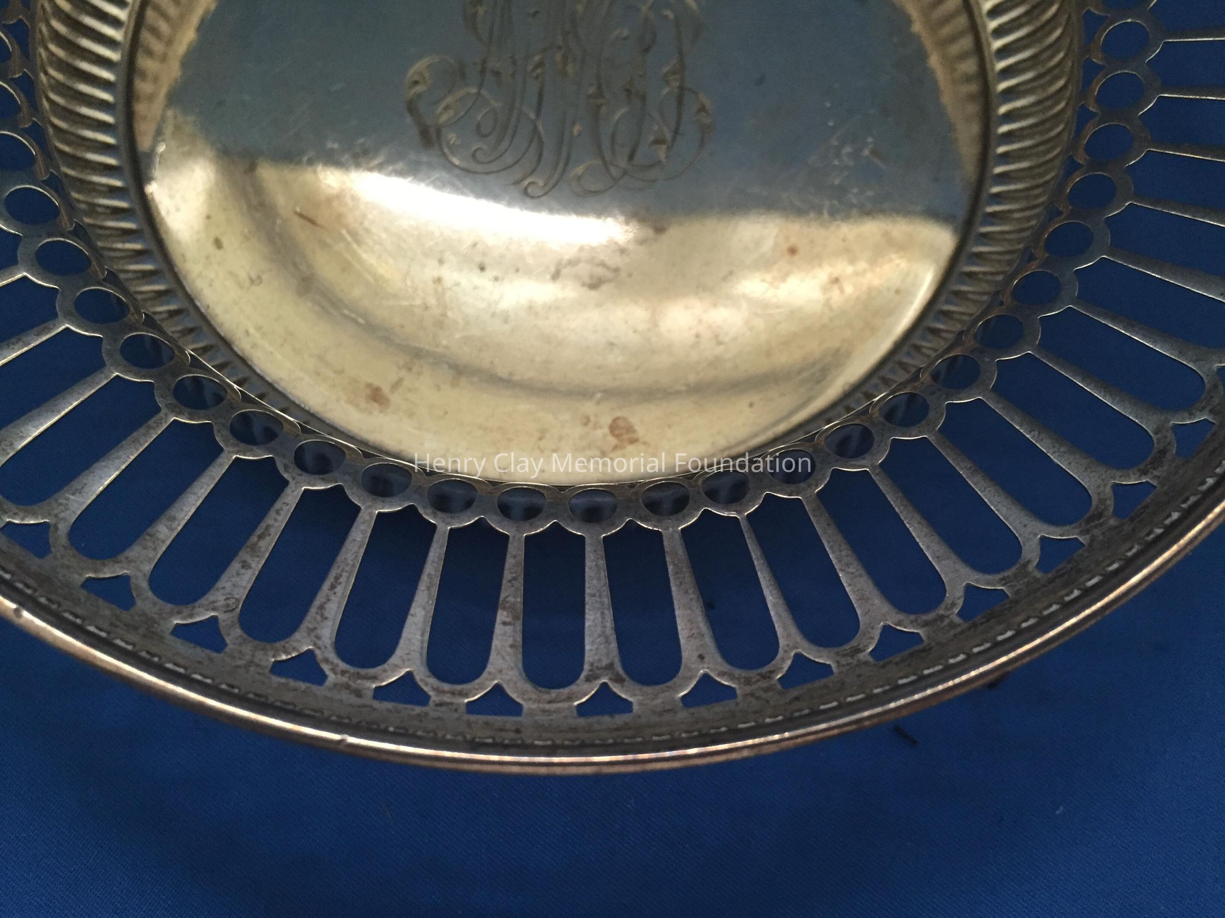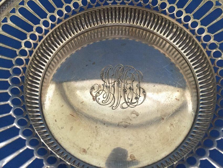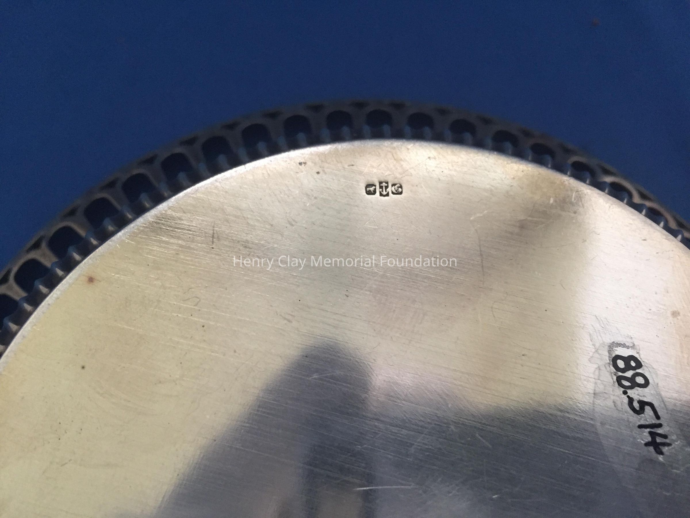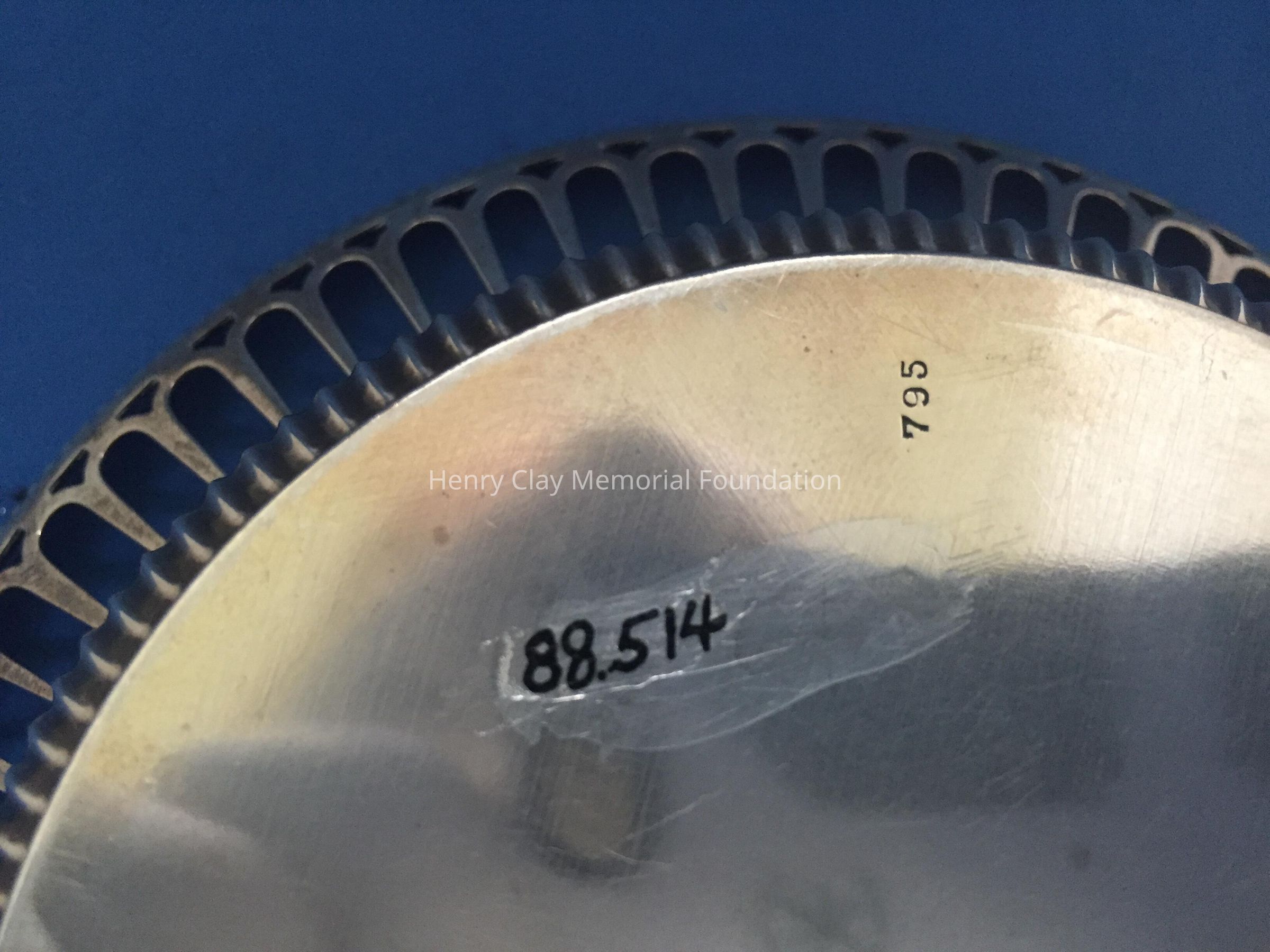 Sterling, pierced ribbing, beaded band at top. Engraved "NMcD" on inside bottom. Maker's mark on bottom and "795."