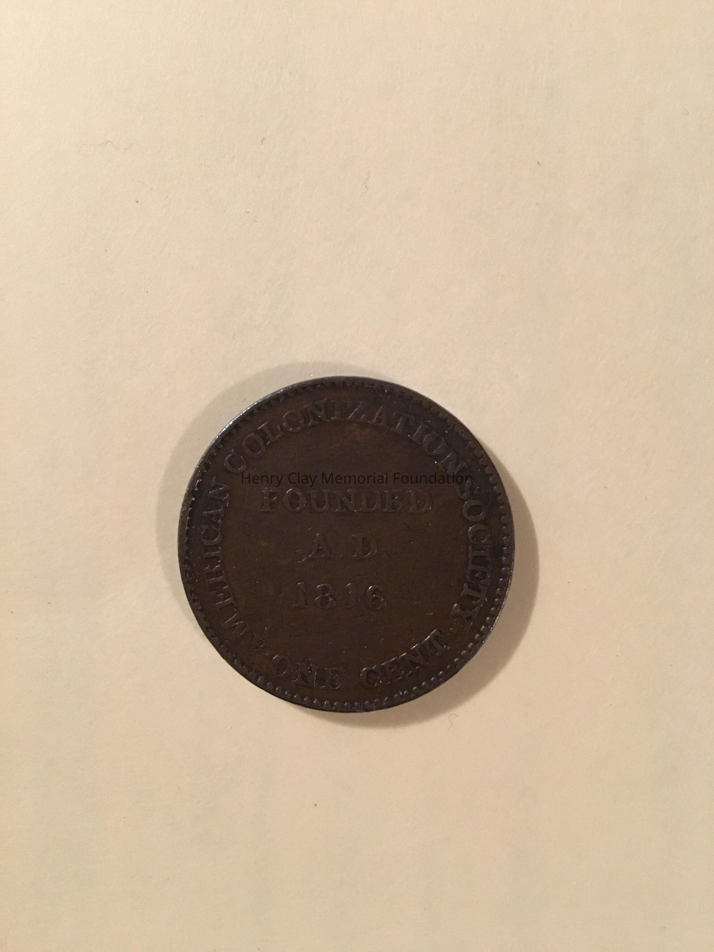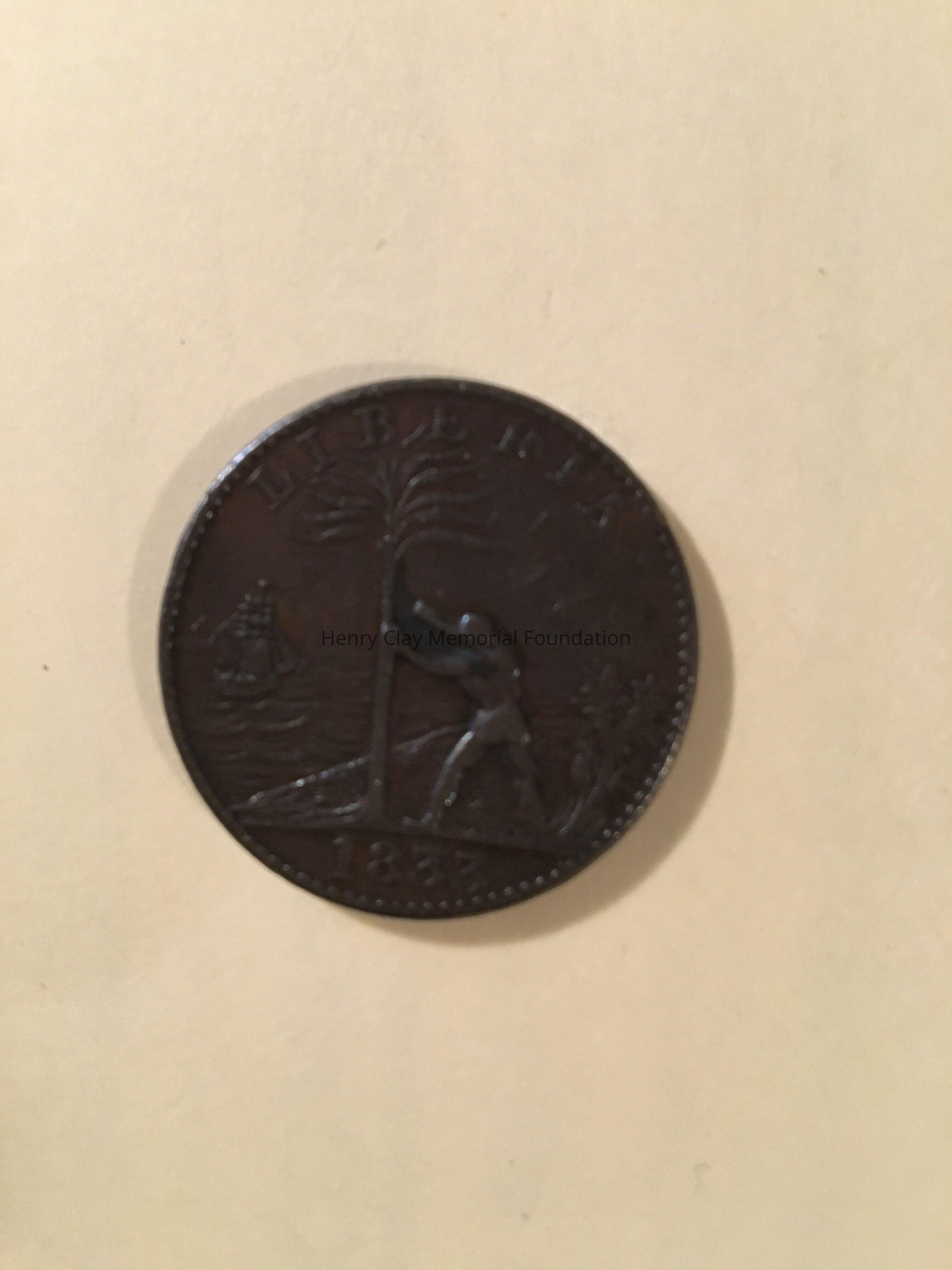 On the front of this coin there are the words "Liberia" and "1835". The front shows a ship in the sea with a man standing on shore holding onto a tree. The back side of the coin has the words "Founded A.D. 1816" in the middle surrounded by "American Colonization Society. One Cent."