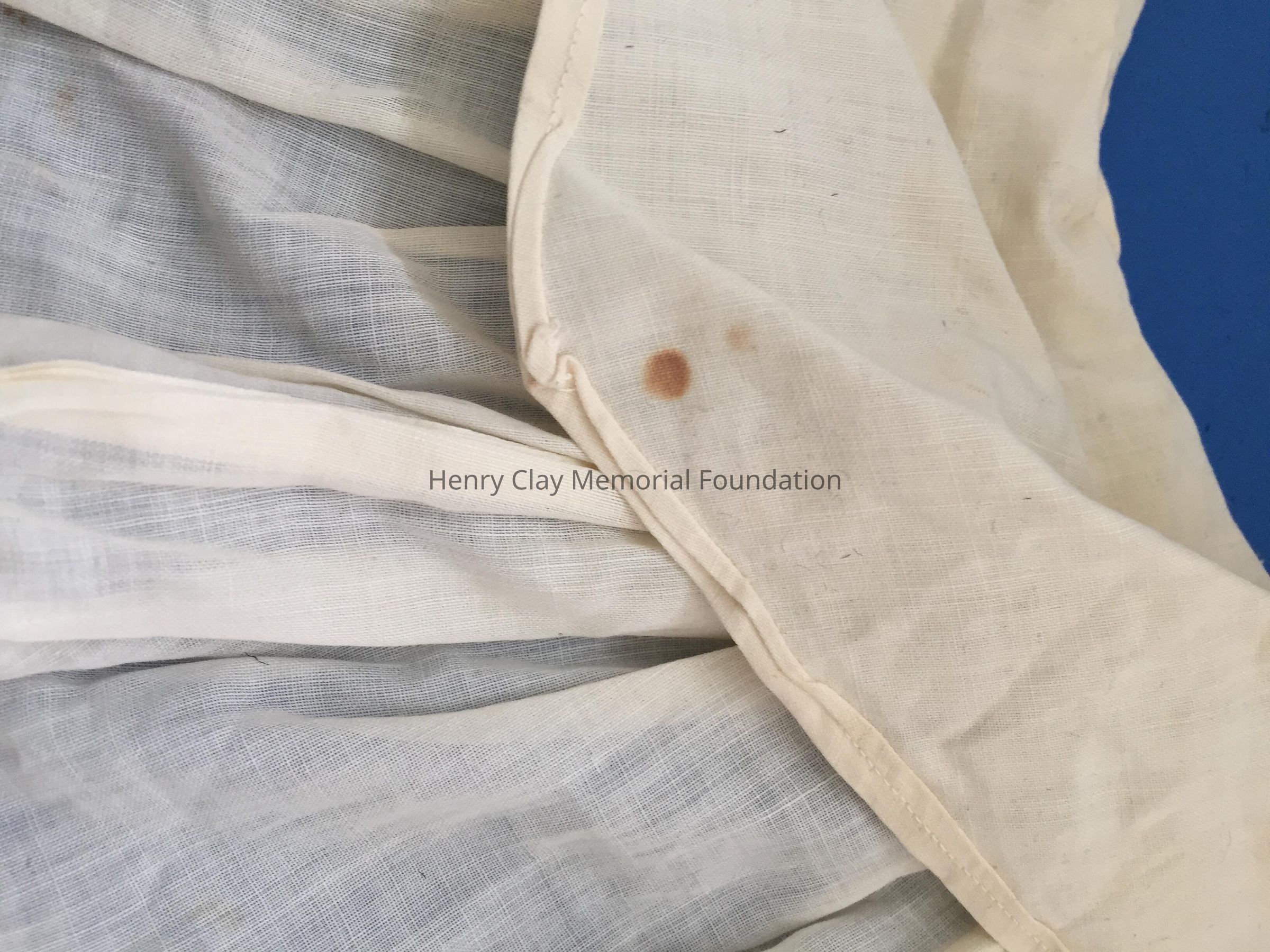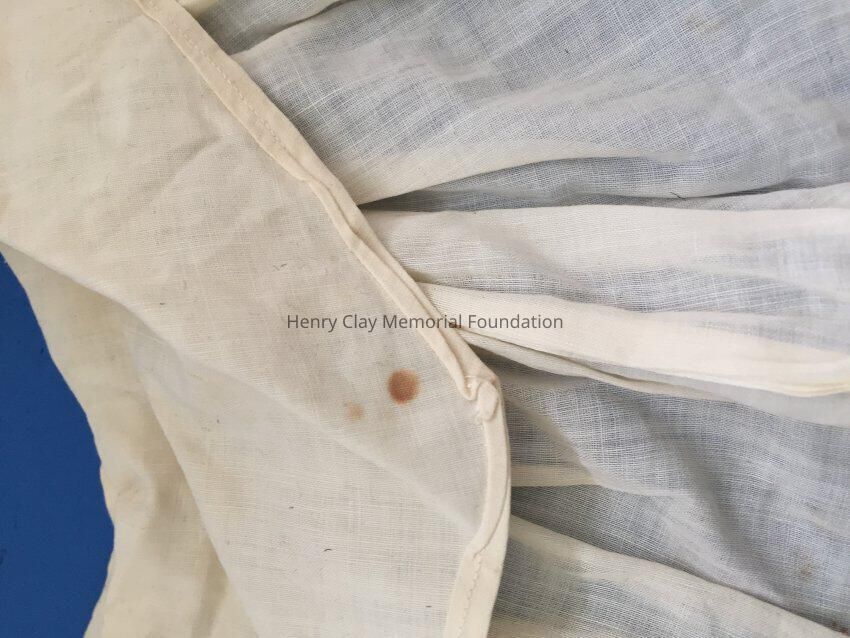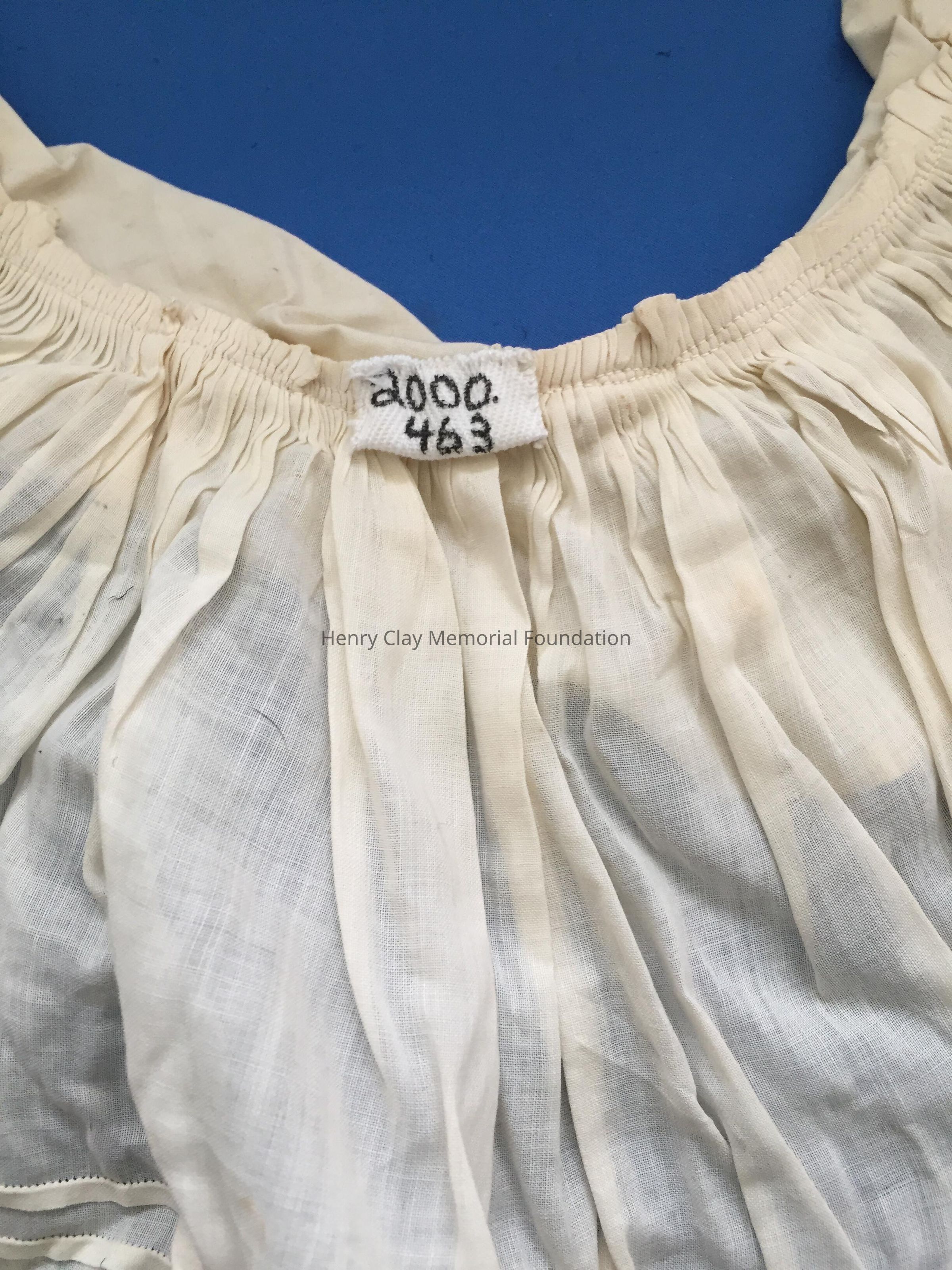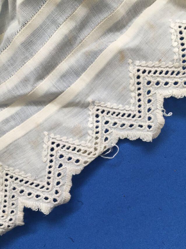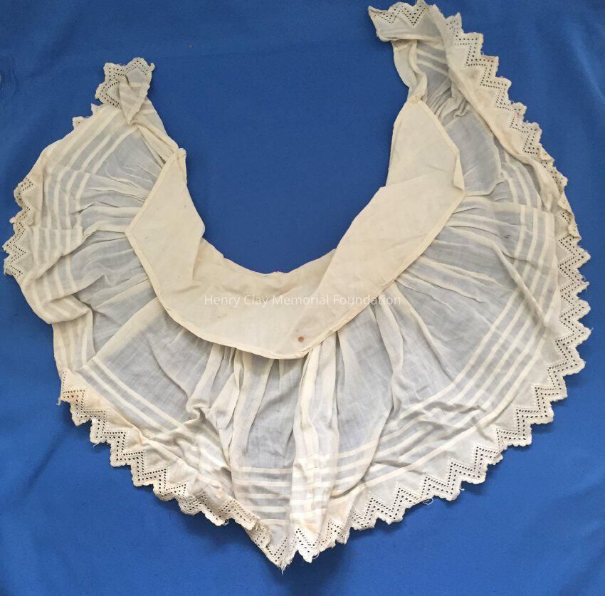 This is an off-white cotton collar. It is in a semi-circle shape. The inside edge goes around the eck. It has a lip forming height, then on the same area that comes to a point in the back. It is gathered at the neck. At the other edge there are four gathers, then there is a pointy, scalloped edge that has eyelet cut-outs all along the edge.