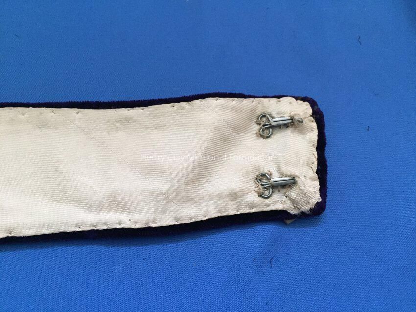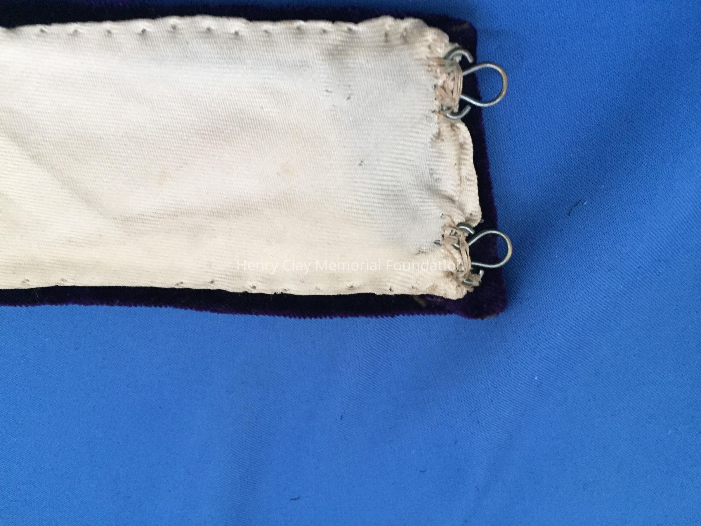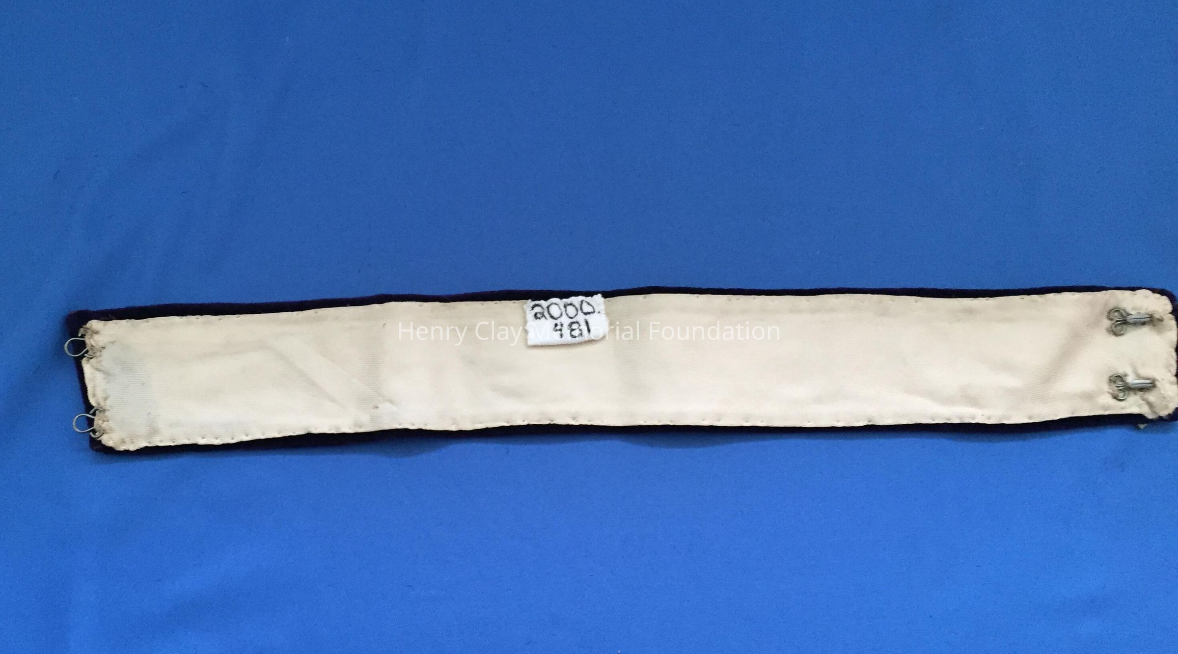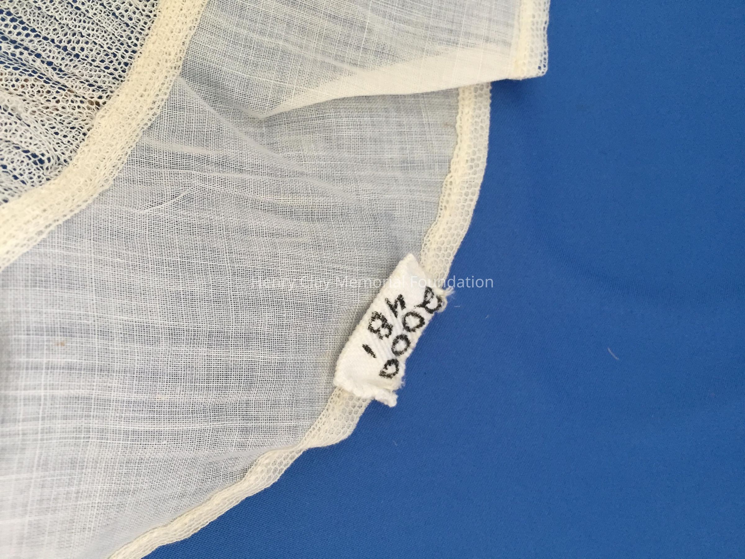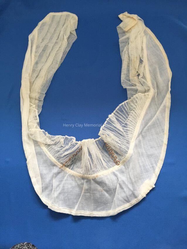 Off-white neck collar made of sheer linen and netting. The shape is long and narrow with the thickest piece in the center. It is divided into two sides. One side has toile that is pleated on the ends. The other side is linen with a finished edge. The toile side has a collar with curly "q" shape. Also has pleats on toile side and the collar is a bit ruffled.Material