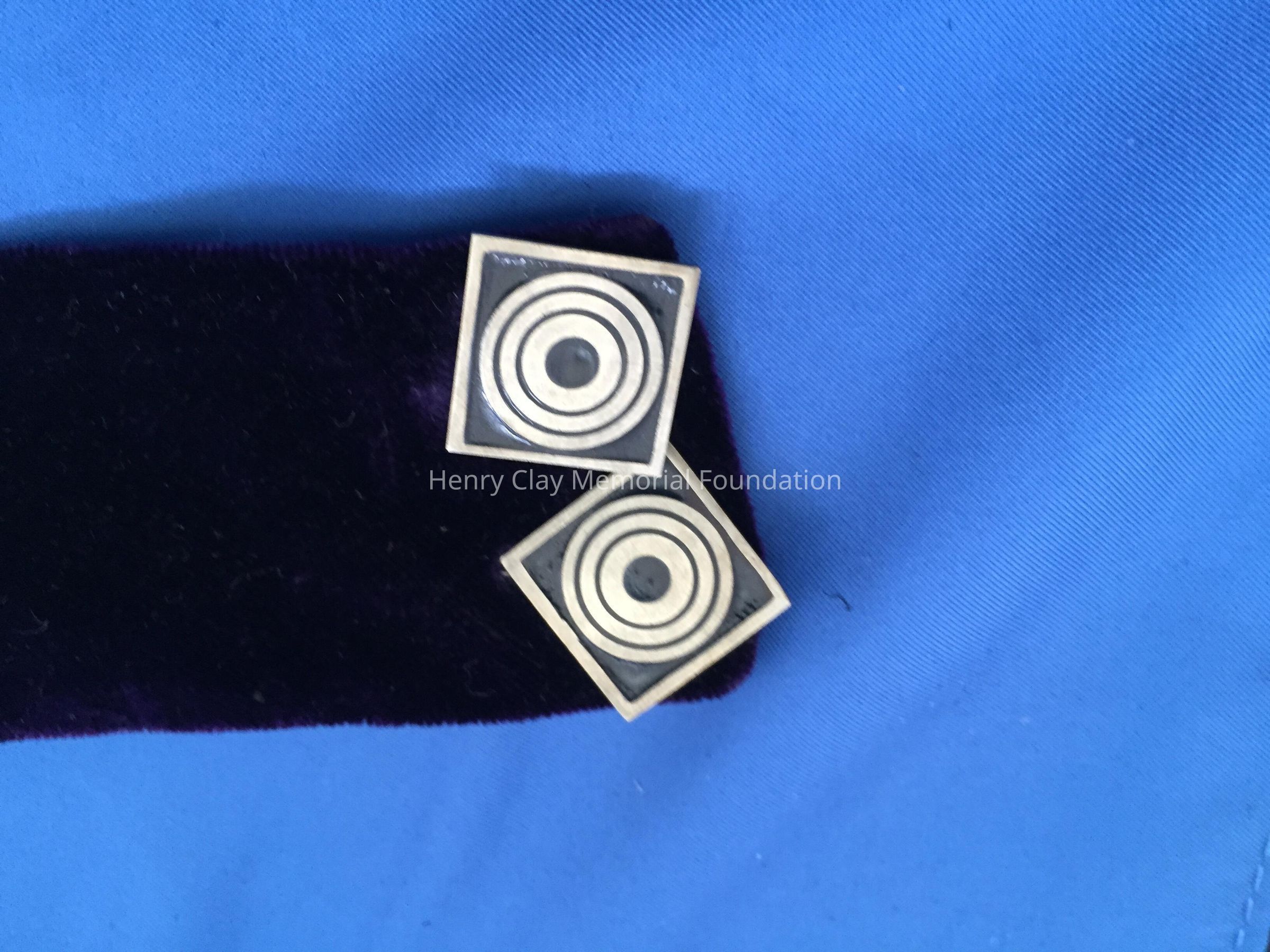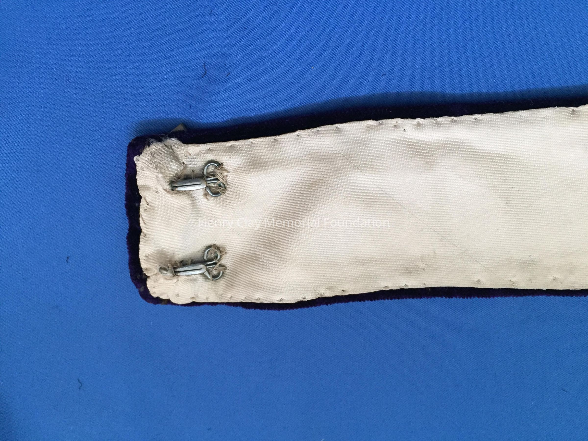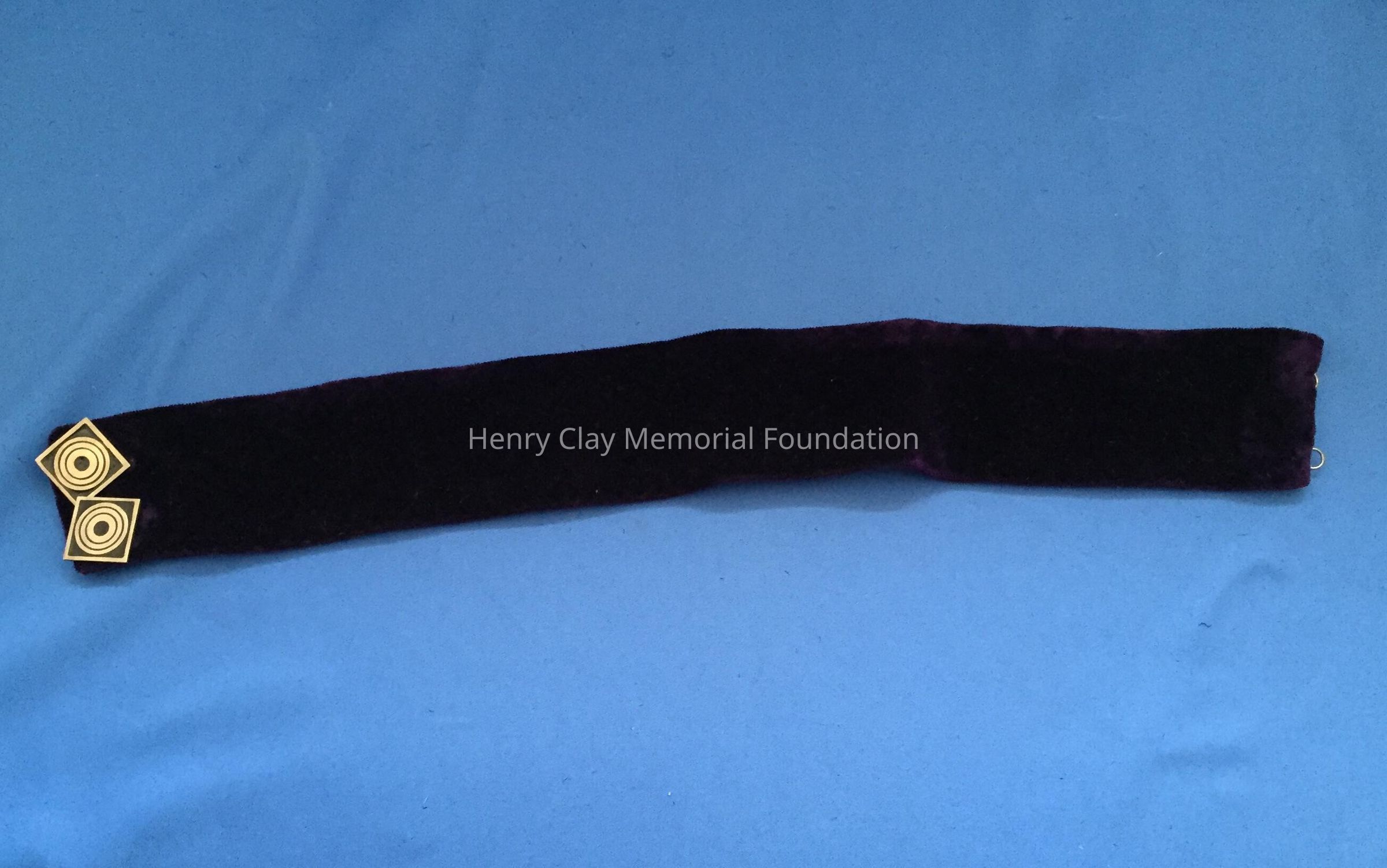 Small neck collar made of purple velvet. Inside is made of grosgrain. Connected with two large hook and eye closures. Two black square buttons with a design of three circles traced in gold, sewed onto center of collar. Collar fabric is wedged on the sides.Material