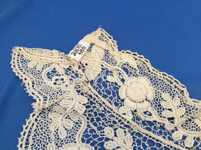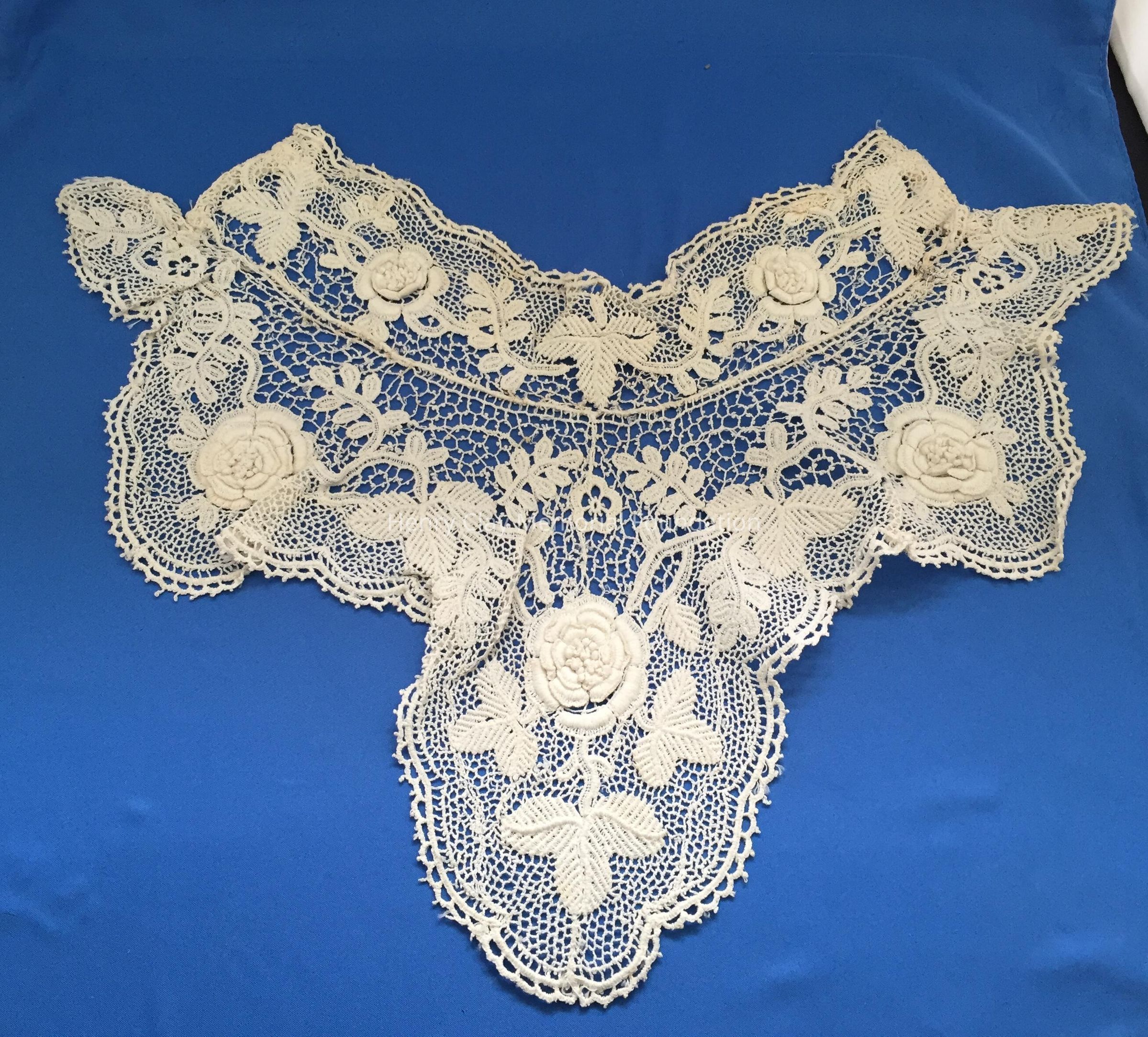 This is an off-white neck and chest collar. It is inserted into a garment by hook and eyes. It is made up of crocheted lace with five rosettes. It seems to come up high at the neck, then has a scalloped edge with a extended piece in the center.Dimensions