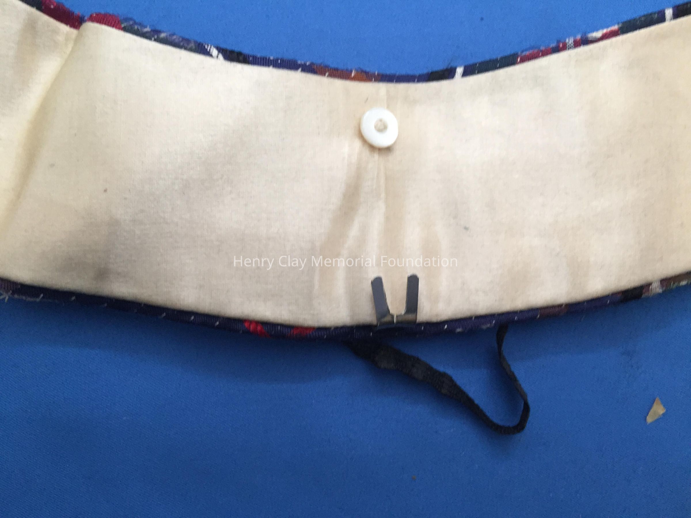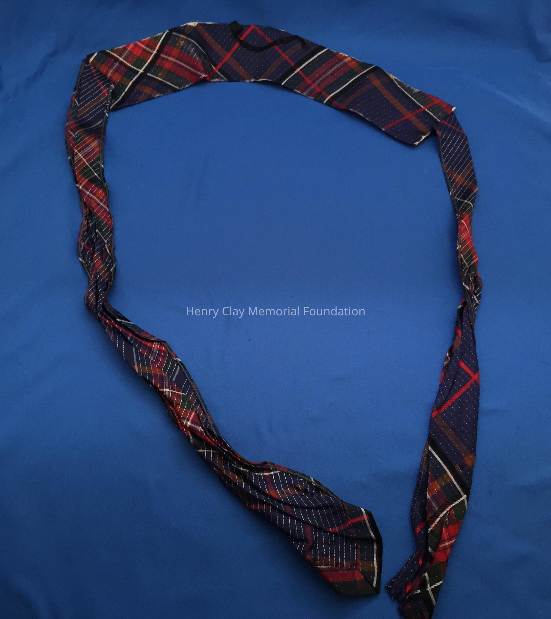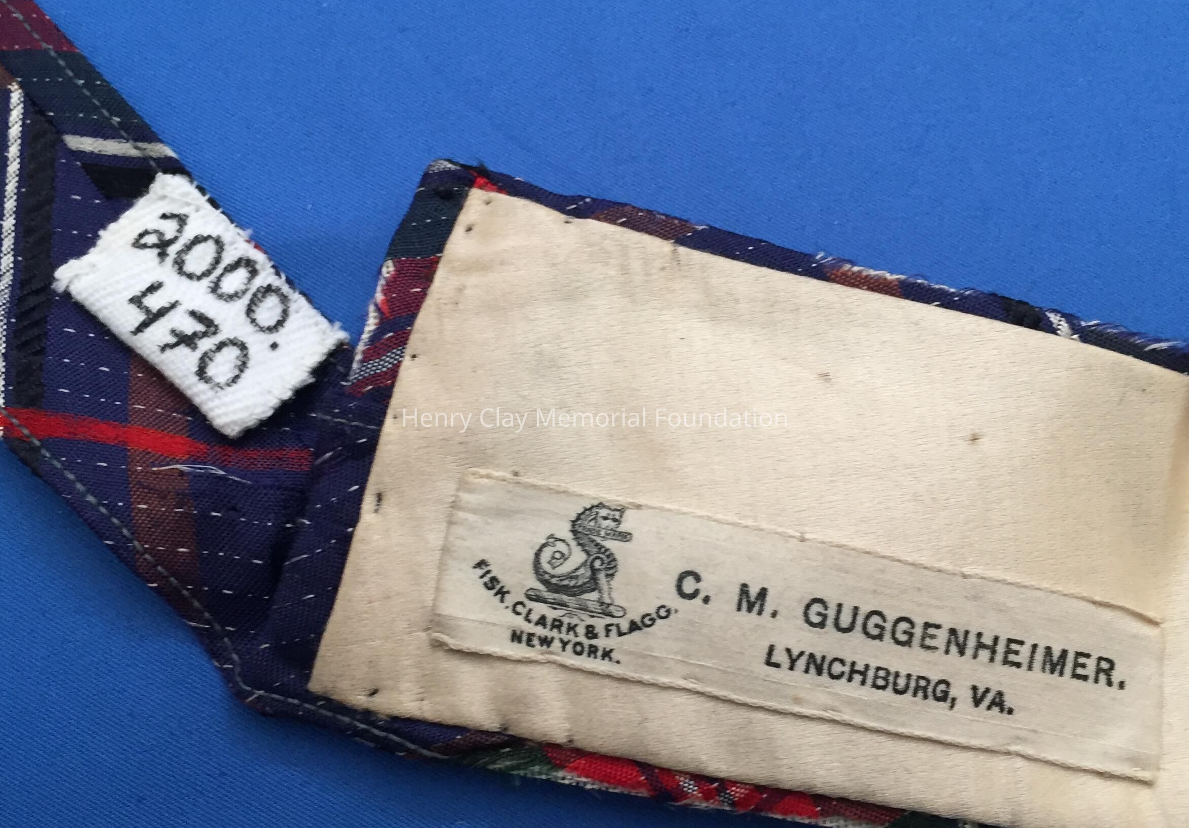 This collar consist of a stiff neck with two long pieces to tie into a bow. The material is a navy plaid that is striated with a white thread. The colors involved are pinks, oranges, reds, blue, white, black, green, and brown. The inside lining is satin. Found inside are a small button and metal hook. There is a label that reads: "FISK, CIAK & FLAGG/NEW YORK/C.M. Guggenheimer/Lynchburg, VA." The back has a small black ribbons connected to hang collar. Hook and eye closures.