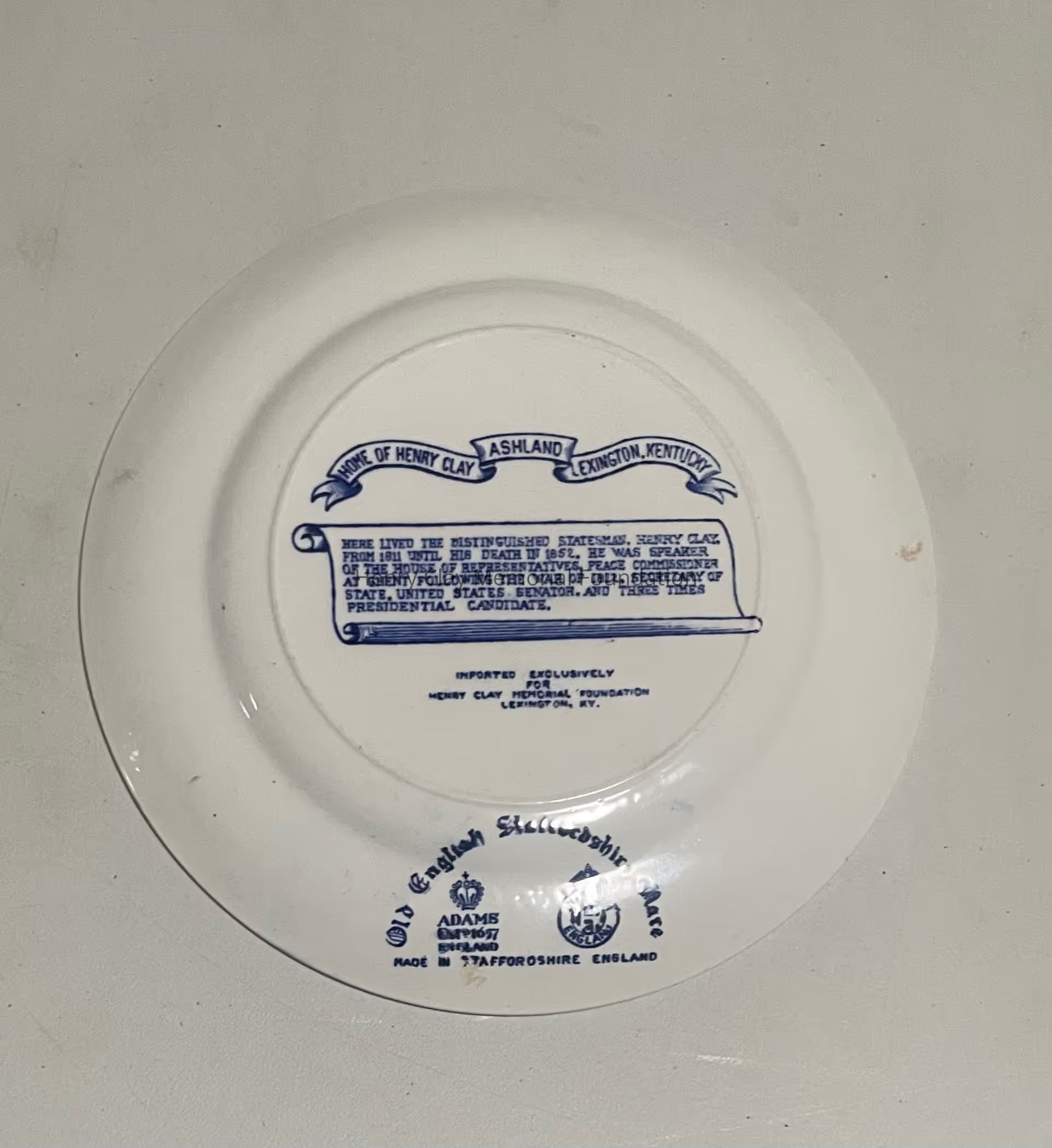 A blue and white decorative plate depicting ashland with information about ashland on the reverse side.