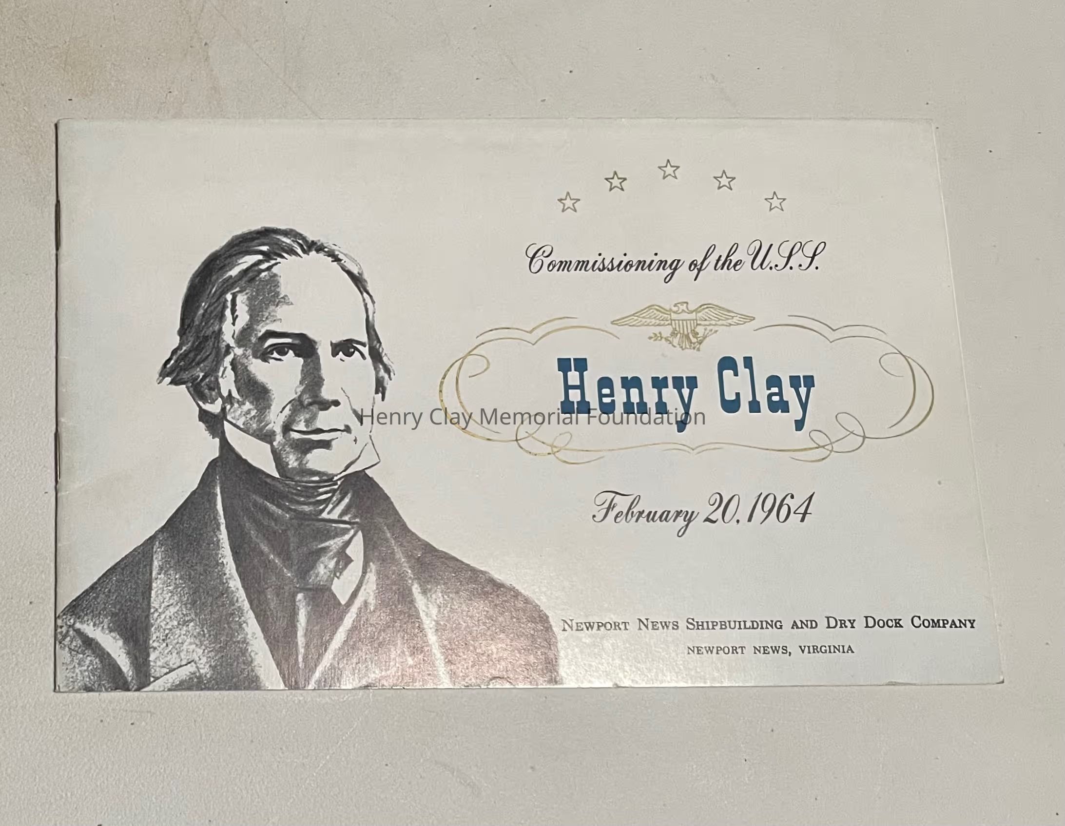 A program from the Commisioning of the USS Henry Clay Submarine on February 20, 1964. Found inside the booklet is an invitation to the commissioning. The booklet cover is pale blue and contains an image of Henry Clay.Dimensions