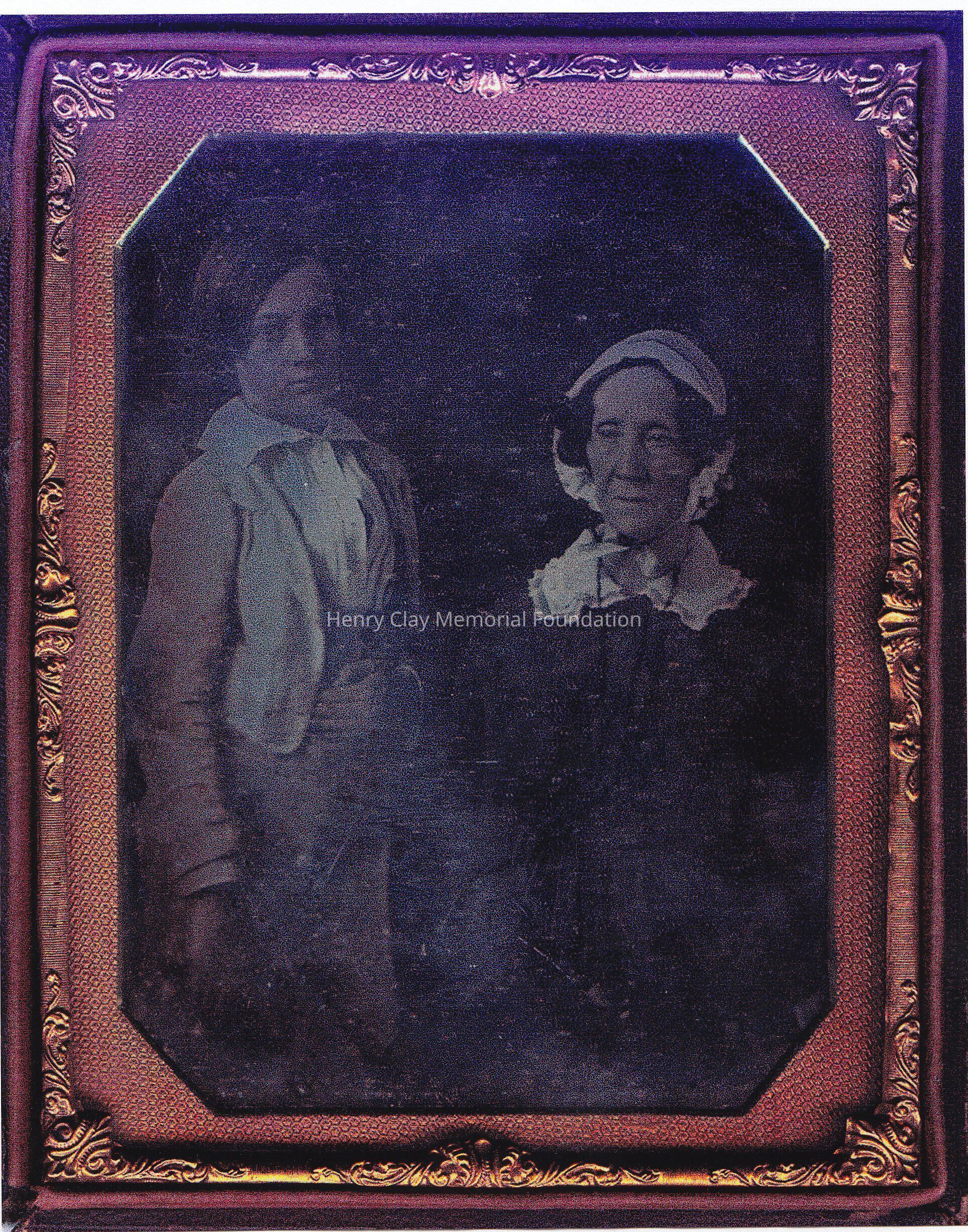 A copy of a daguerrotype of a grandmother and grandchild.