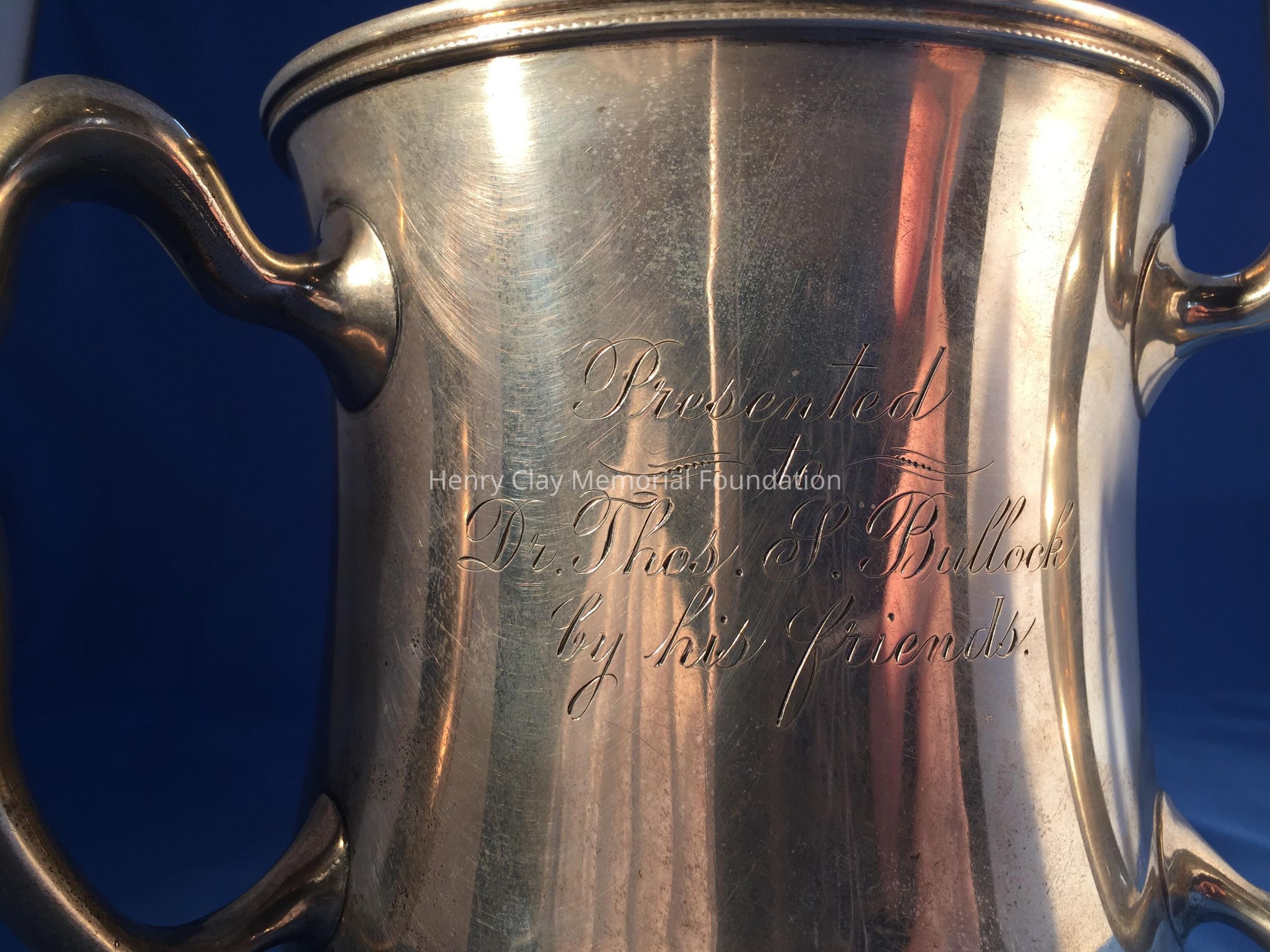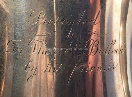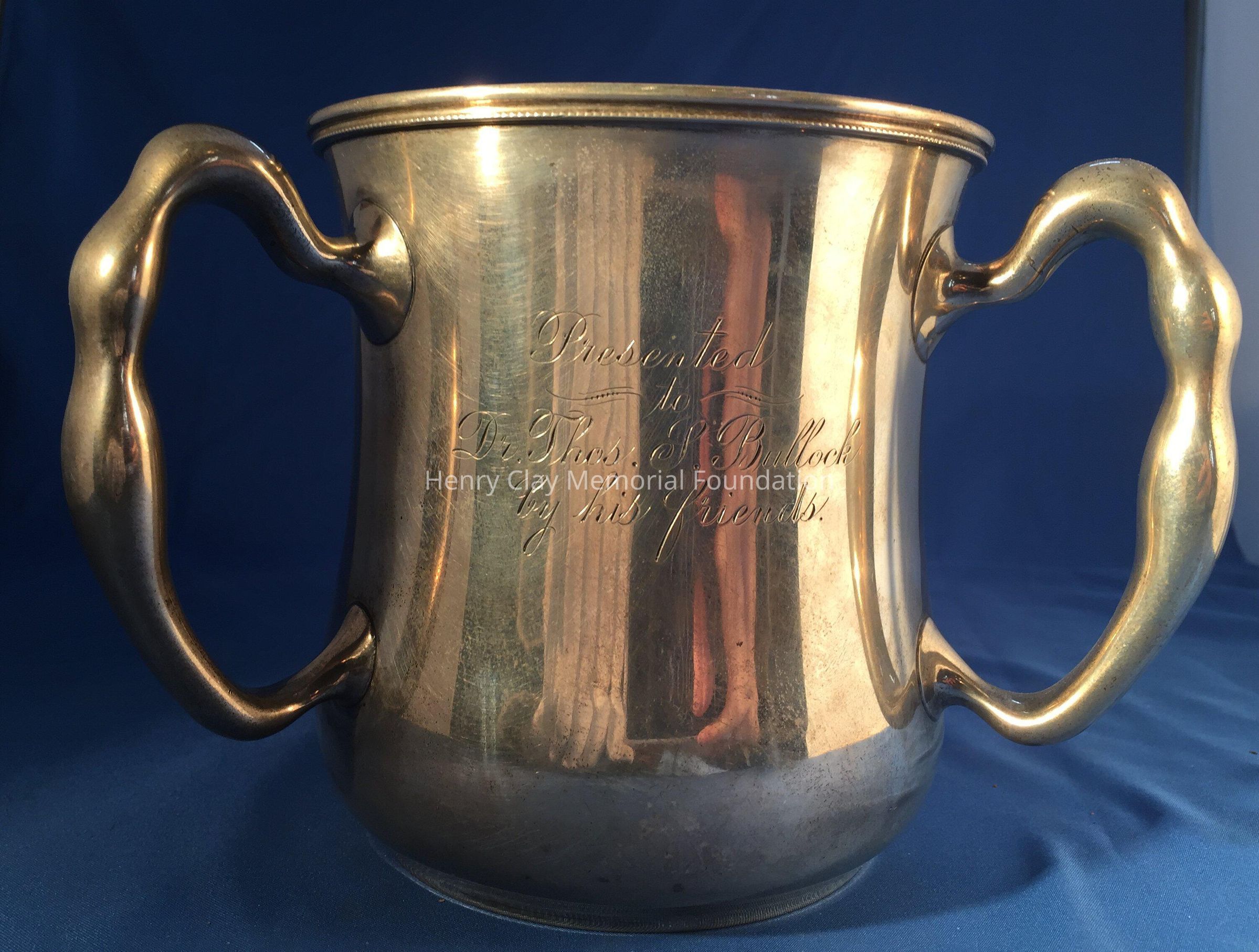 Sterling silver with three handles, engraved: "Presented to Dr. Thomas S. Bullock by his friends." "T.L. McDermott, Jno. G. Cecil, F.C. Simpson, T.F. Starks, J.M. Ray, Louis Franks, A.M. Cartledge, T.C. Evans, Morgan Vance, W. Cheatham."