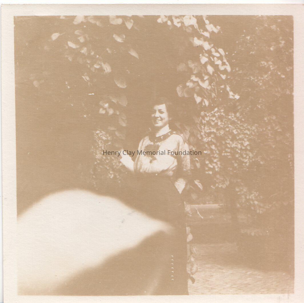 A black and white photograph of a woman outside in a garden, wearing a dark long skirt and a white blouse with a dark decoration in front, and dark collar