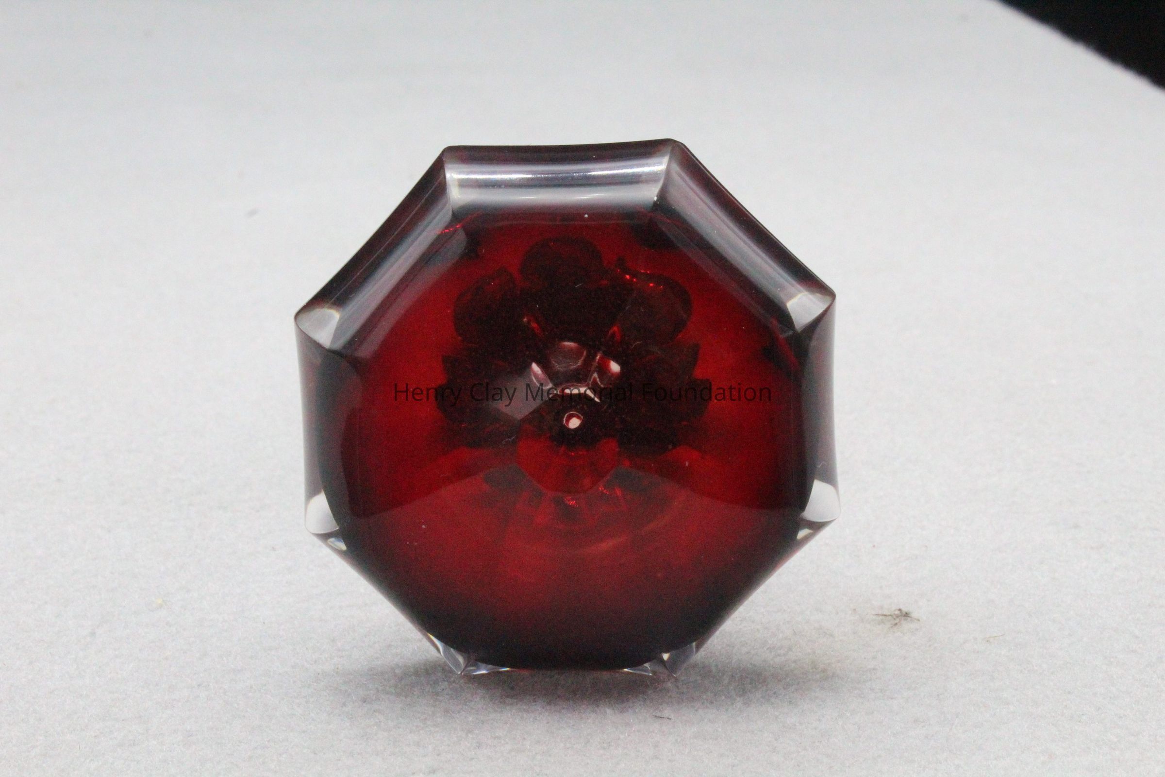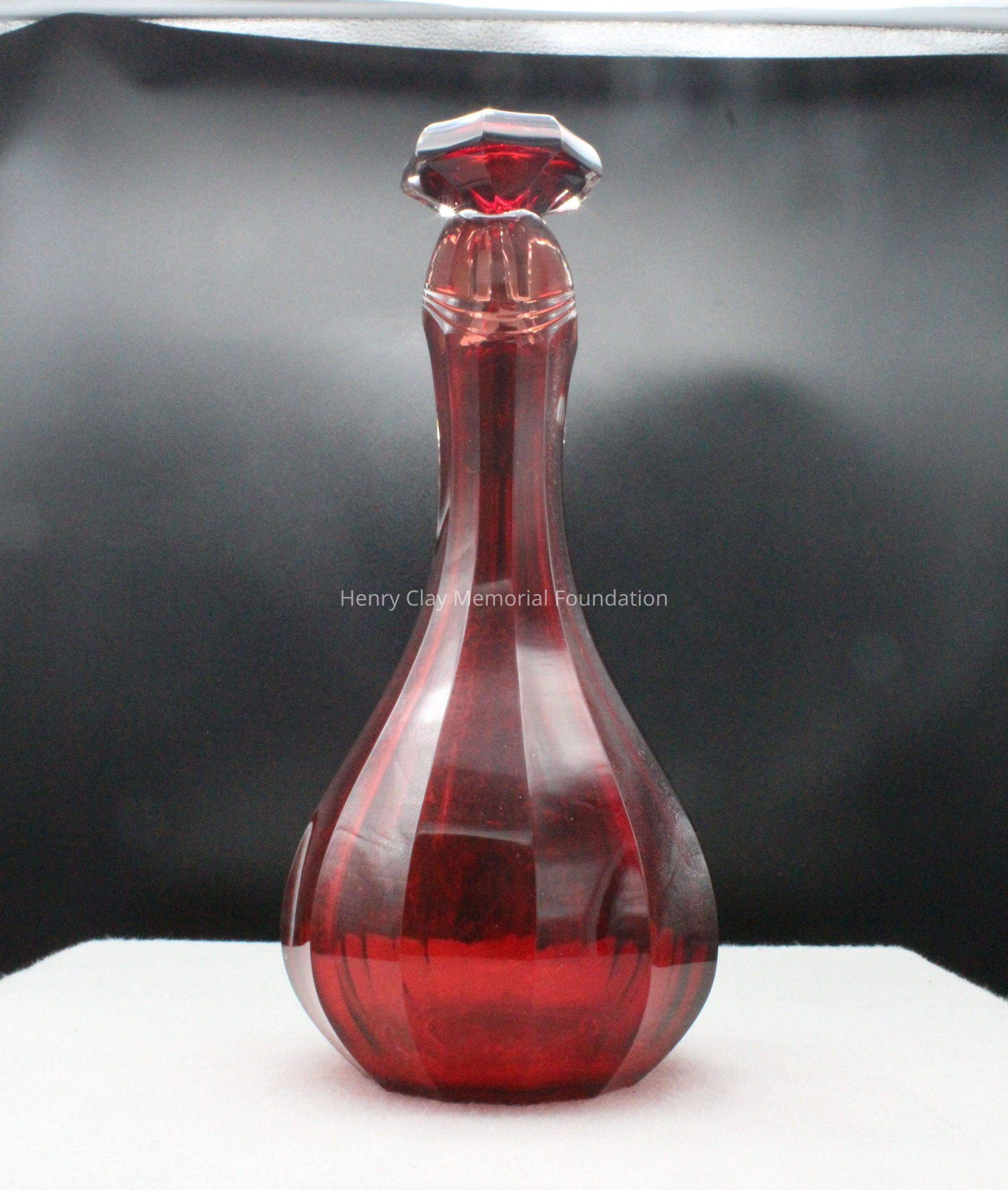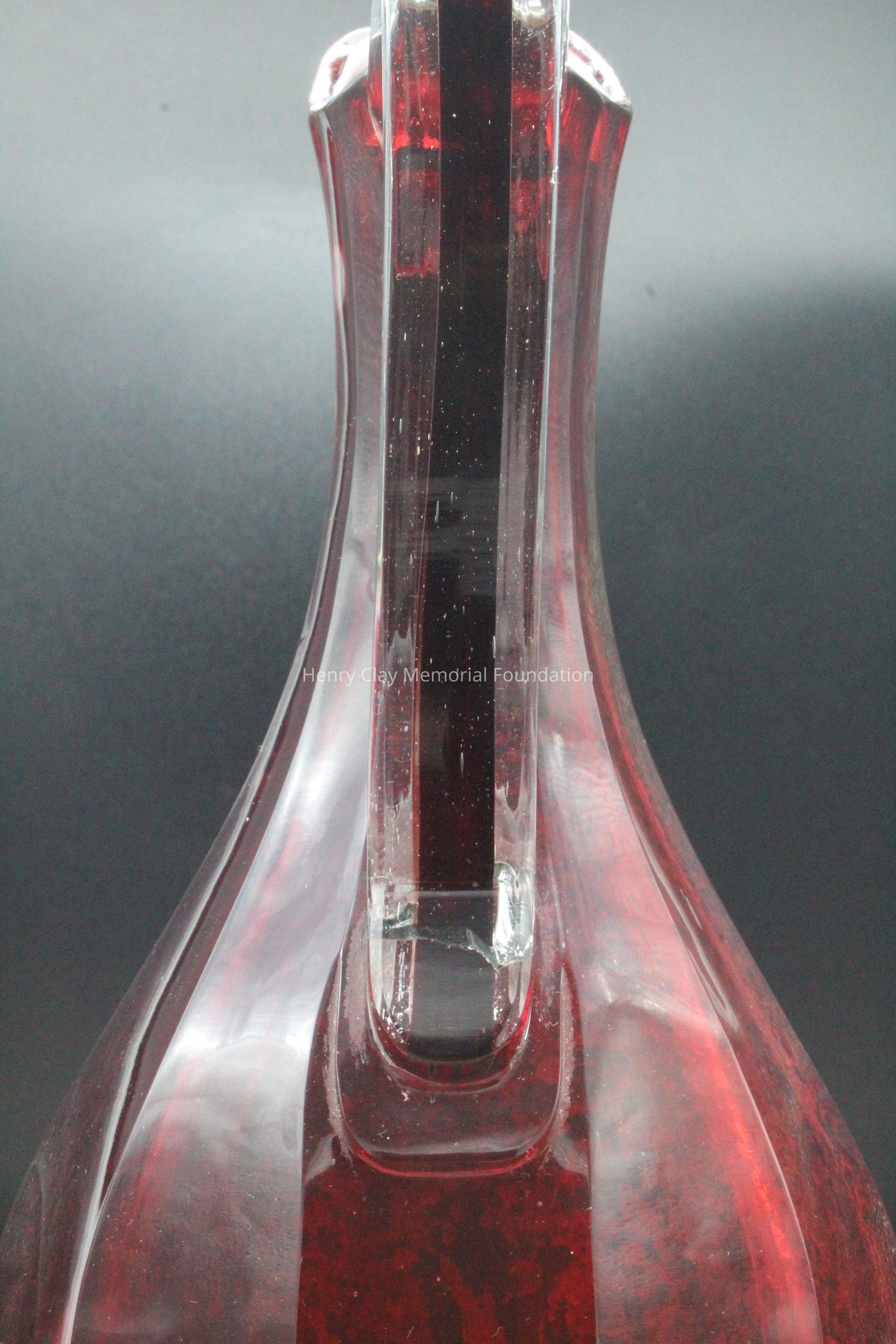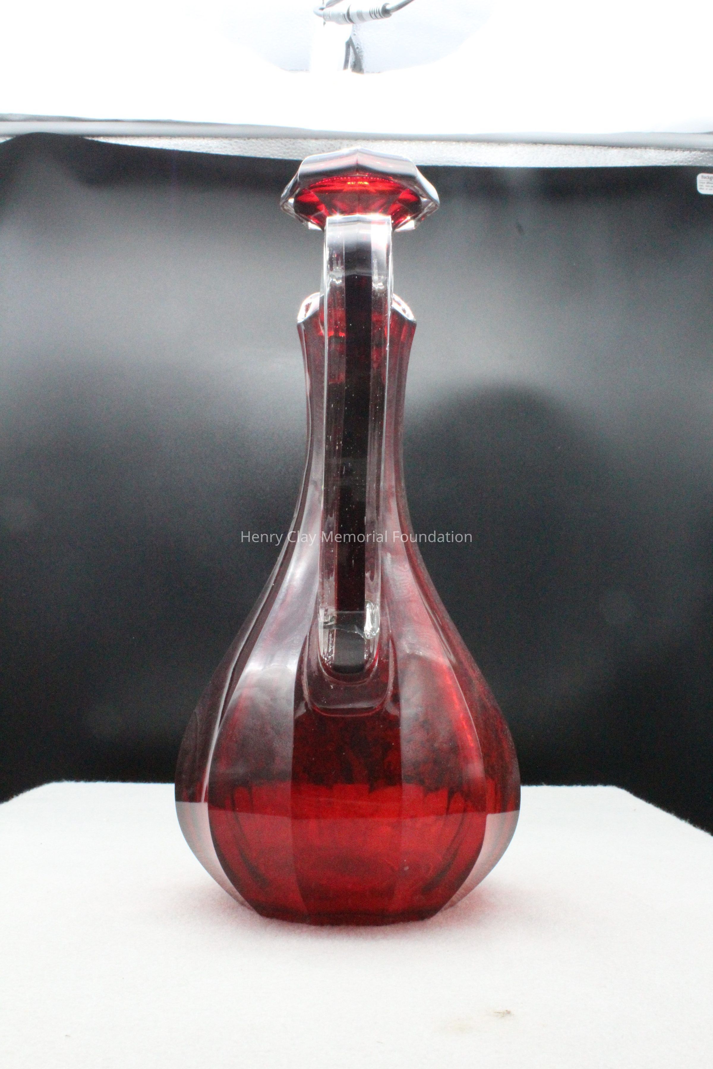 Two red glass pitchers with stoppers. The pitchers are faceted with narrow necks and bulbous bodies. The handles are separate and have been heated and attached. Each handle is clear with red glass in the center. The stoppers are faceted with mushroom tops and narrow necks that end in tapered cylindrical bases. There are three ridges beneath the spouts of each.Dimensions