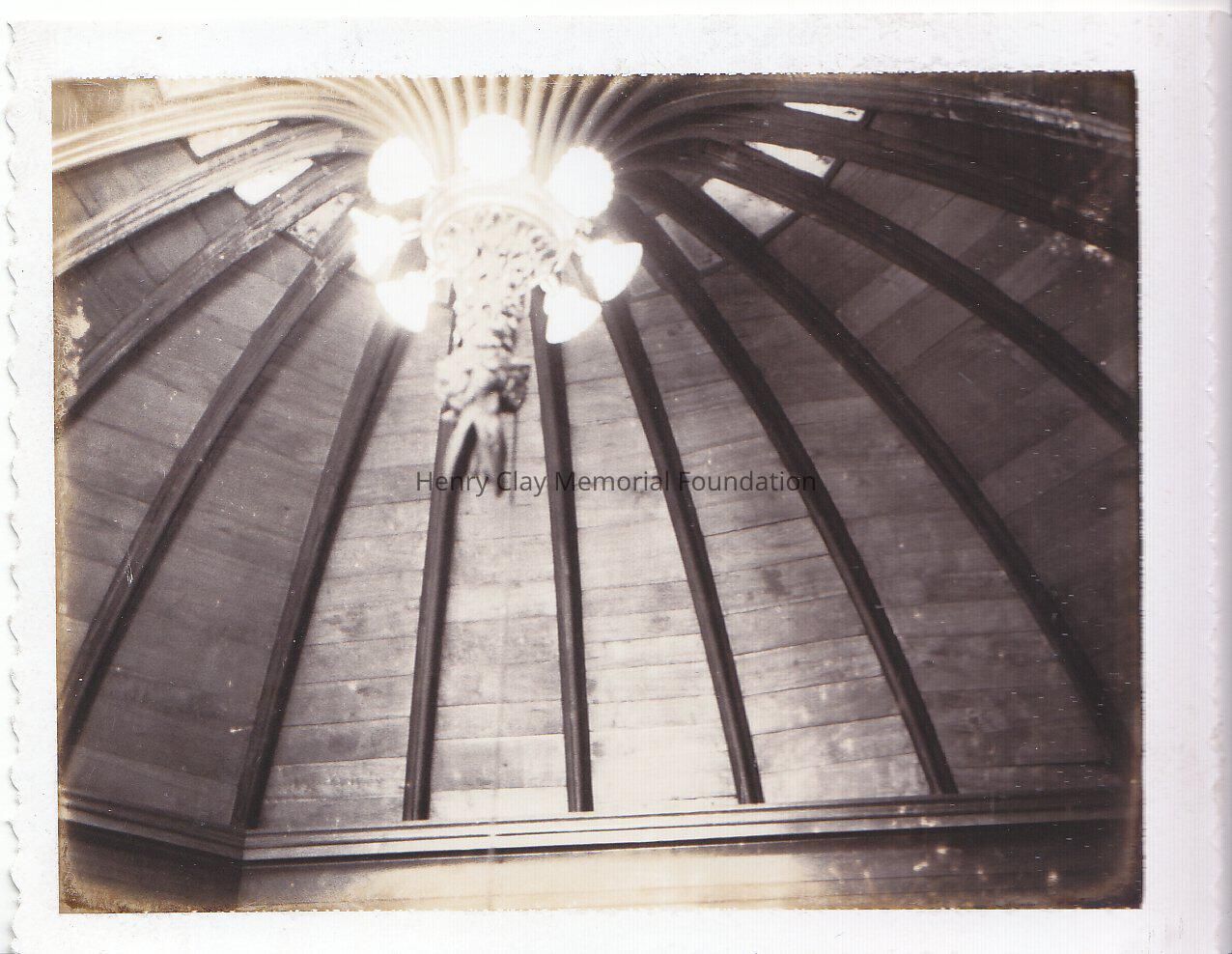 Black and white photograph of the library of Ashland ceiling. The cupola cealing has a snake head coming down, which served as chandelier holder.